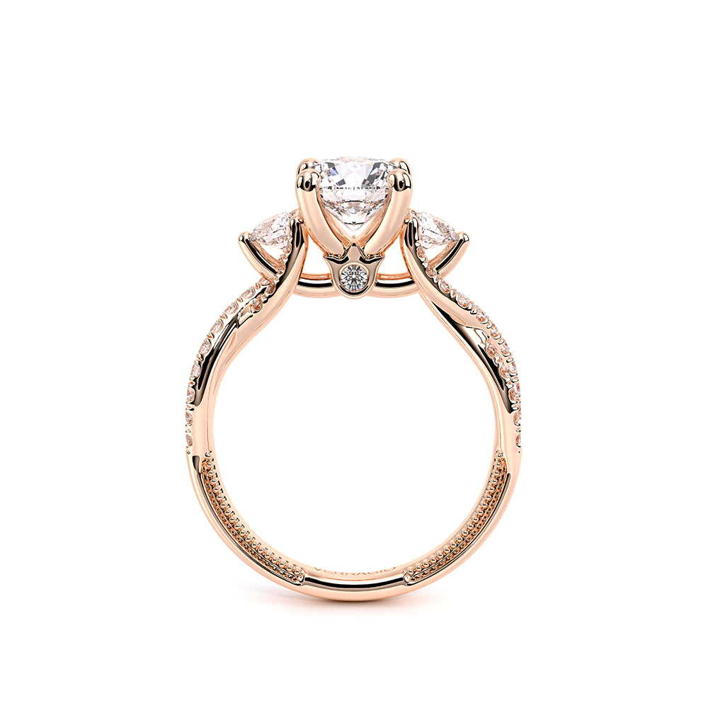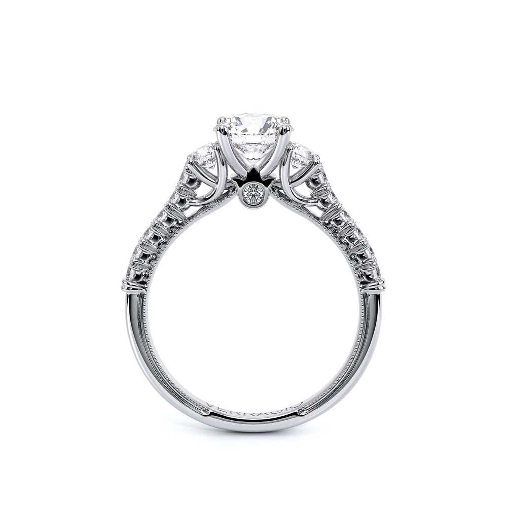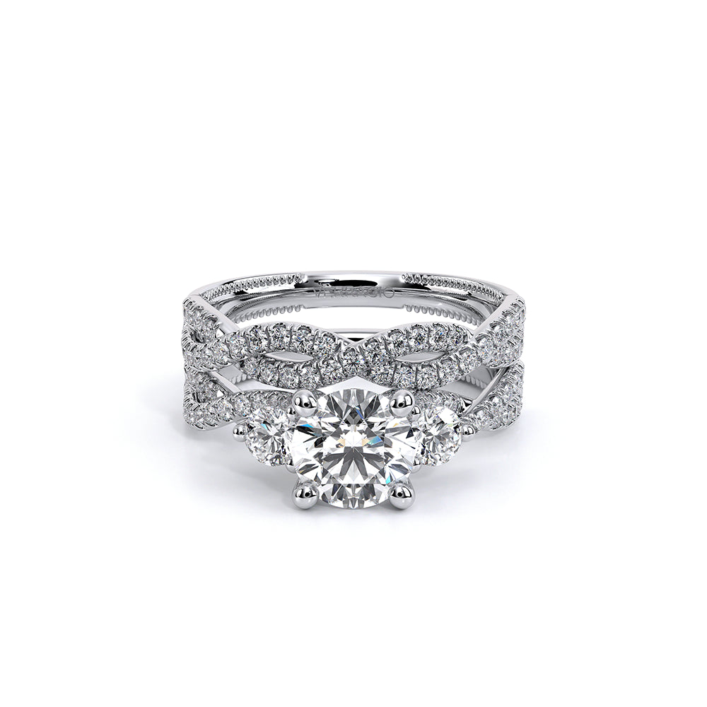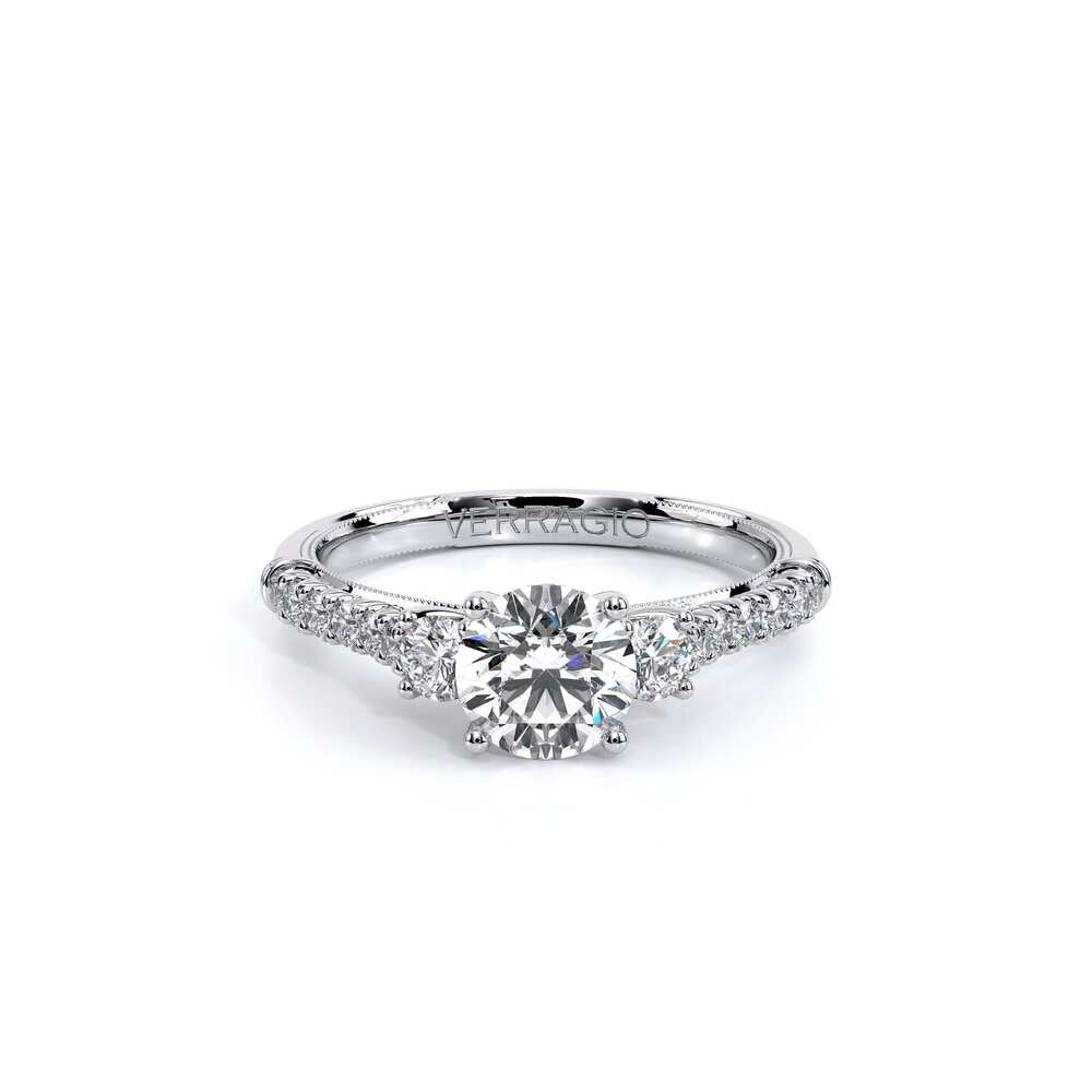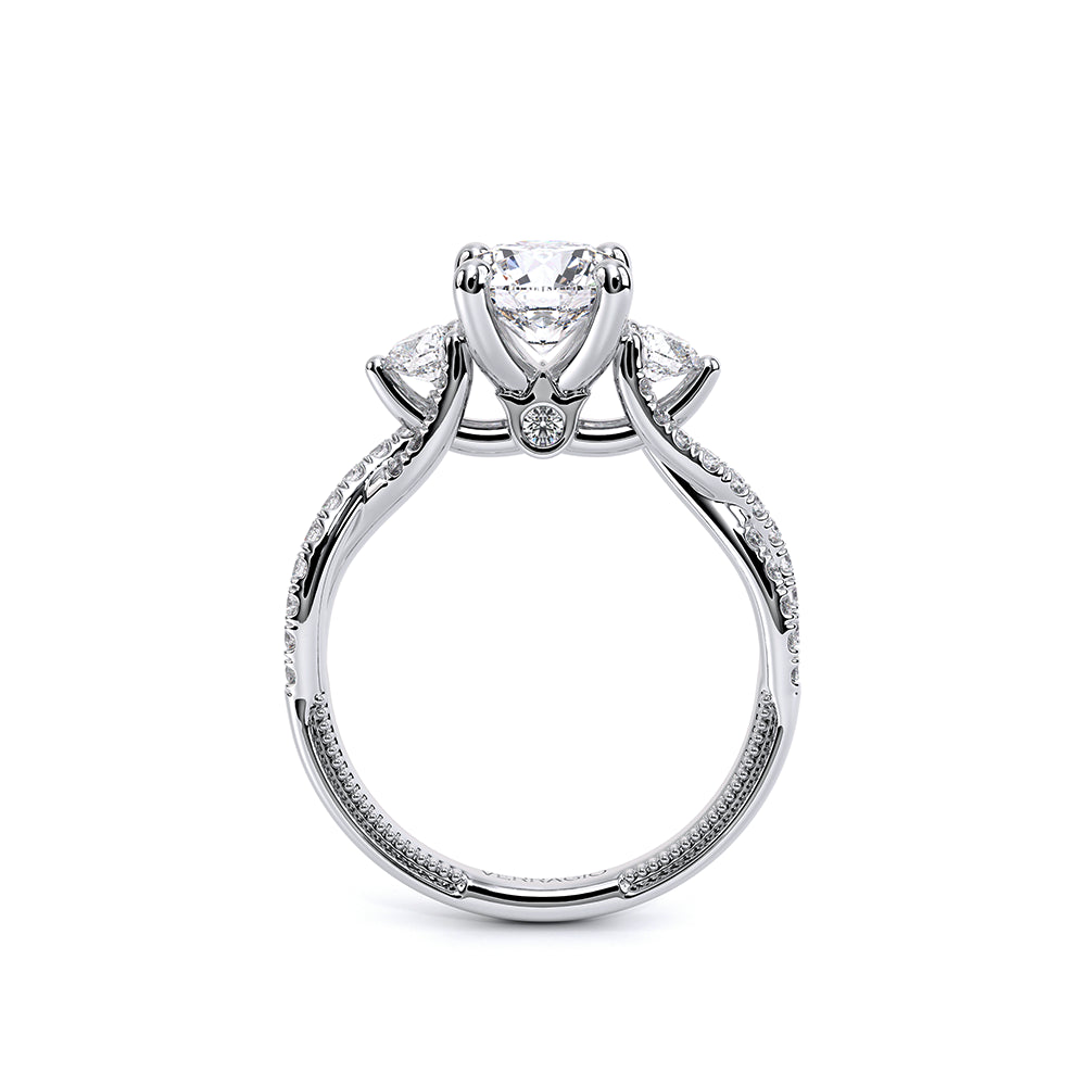 Renaissance-962-3R1.2 features three dazzling stones representing past, present, and future. The twisted shank adds modern elegance with its delicate diamonds. Milgrain detailing and the signature Verragio crest make this ring a symbol of timeless love and commitment.
