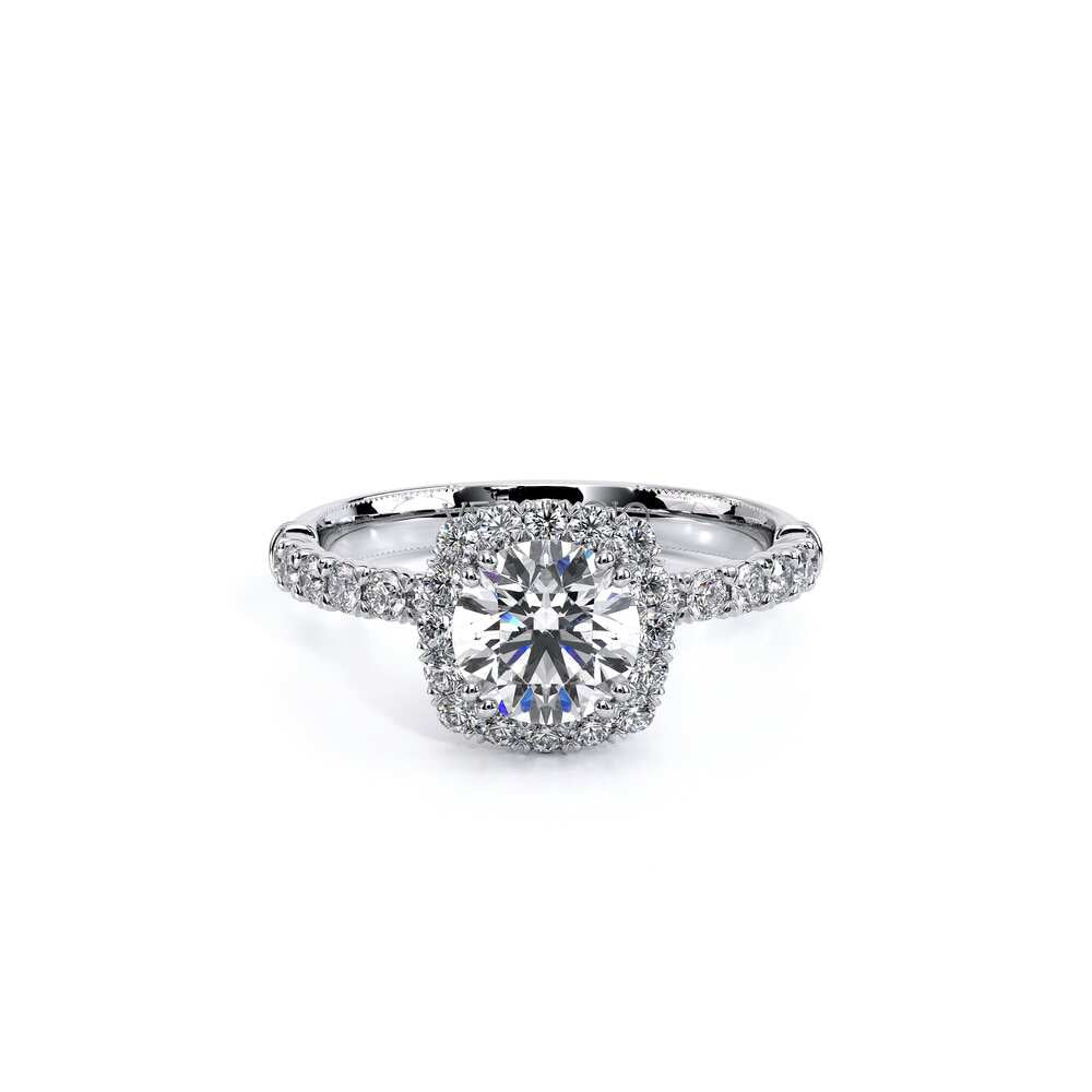 Renaissance-954CU1.8 is beautifully accented with pave set diamond prongs leading to from the shank to the halo. This cushion halo engagement ring sparkles from every angle.
