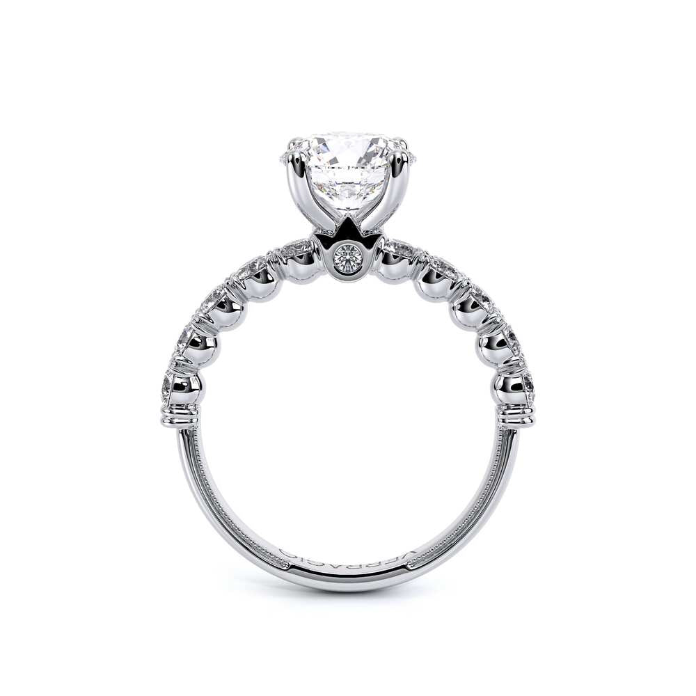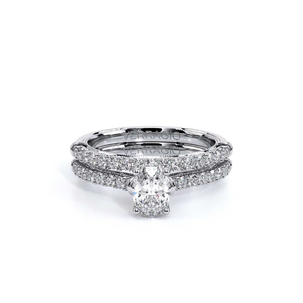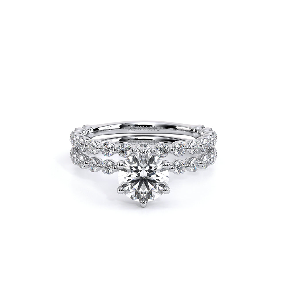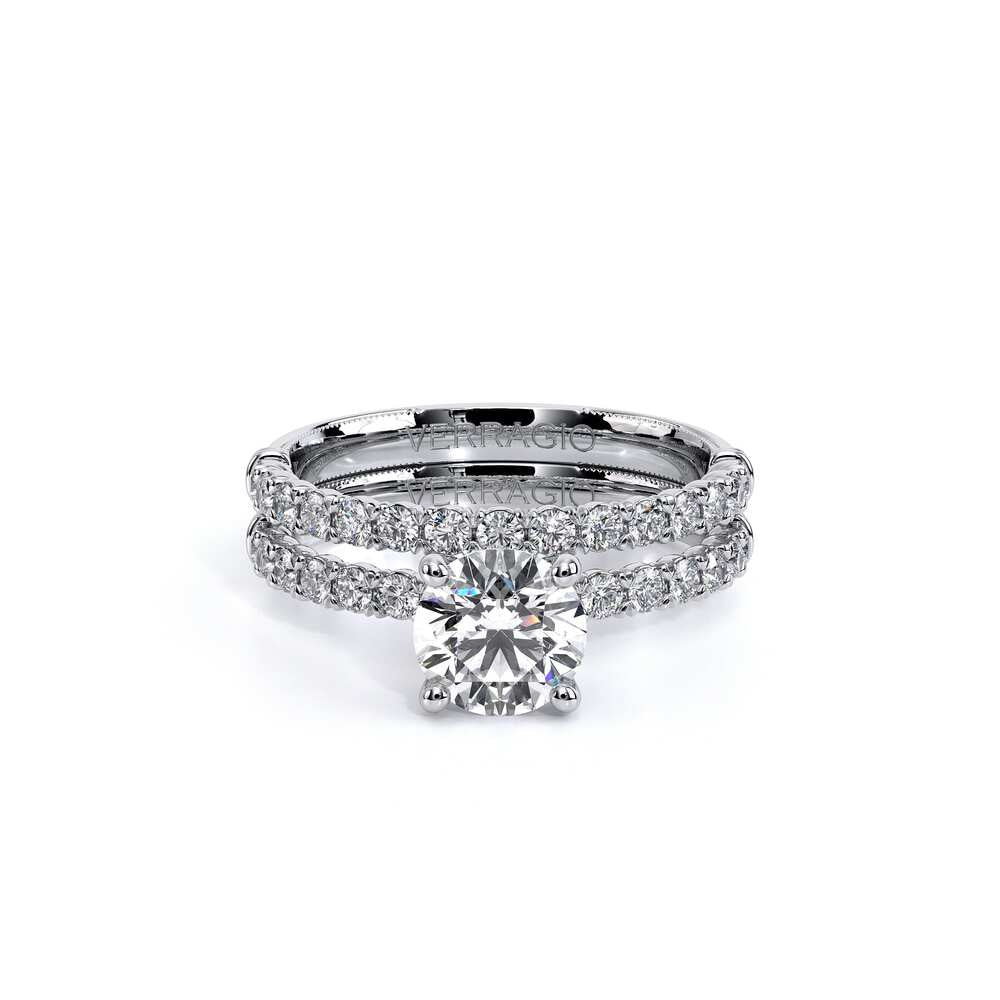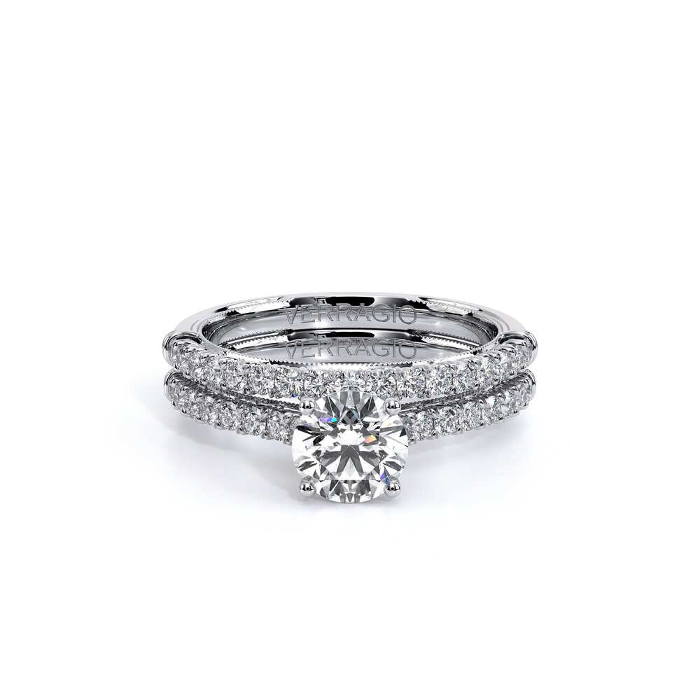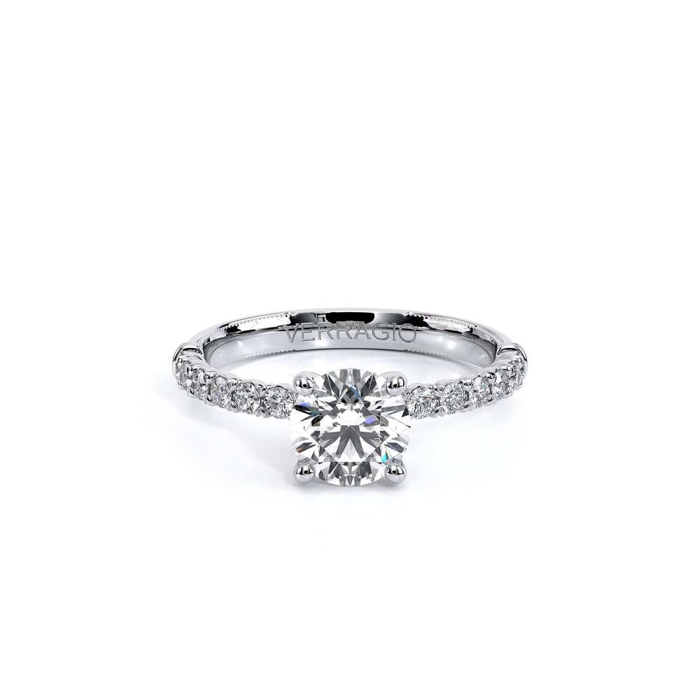 Renaissance-989P-2.0 features a diamond-rich, four-prong setting meticulously crafted to cradle each stone securely. Its sleek, shared-prong cup setting exudes elegance, while the design ensures both comfort and durability. Verragio's signature crest unifies the sophisticated style.