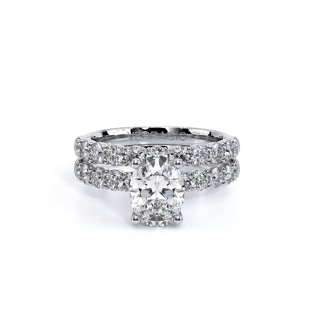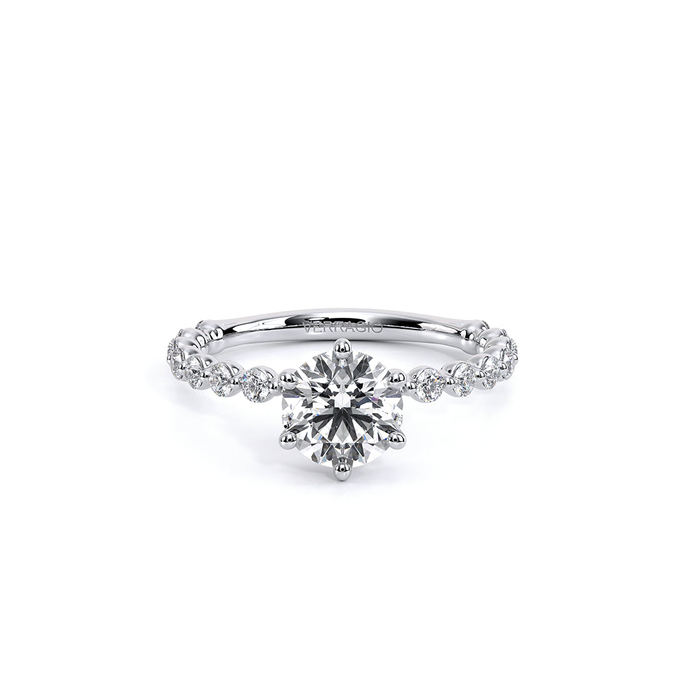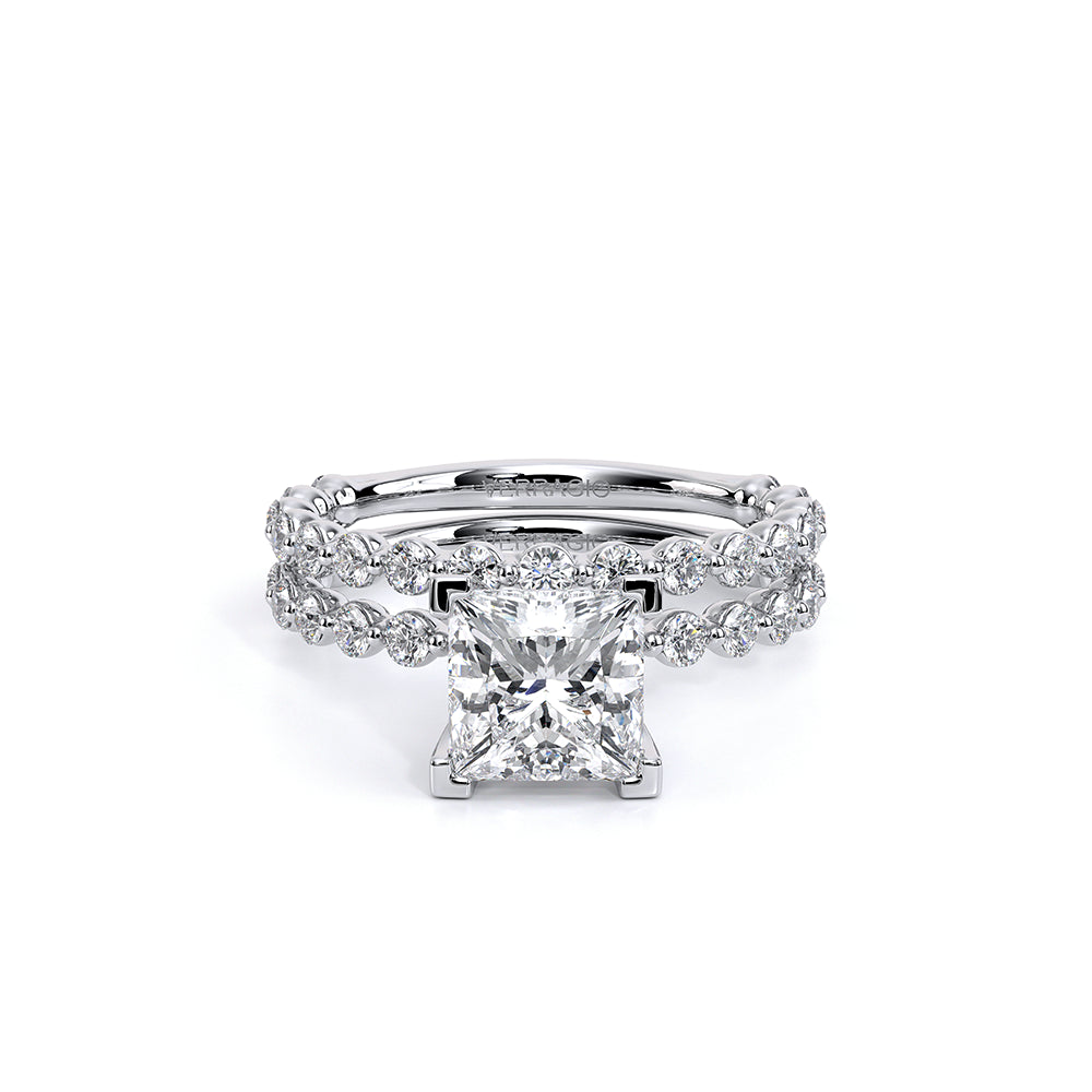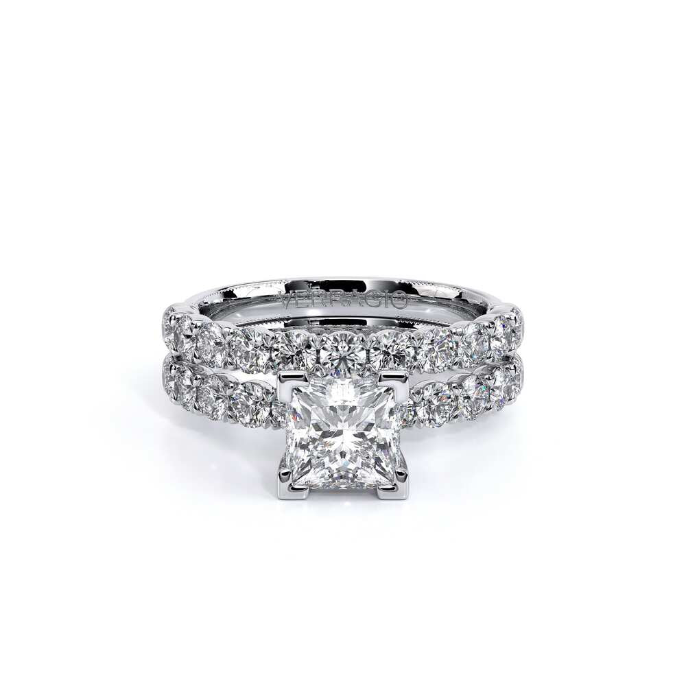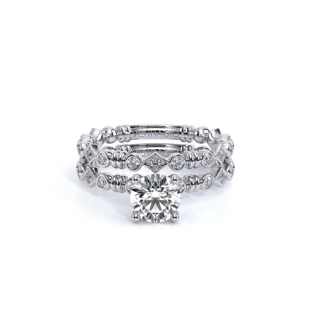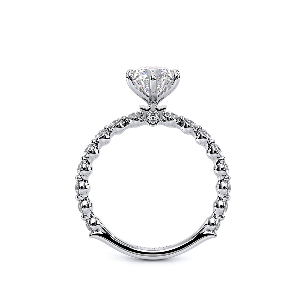 Renaissance-989P-2.0 features a diamond-rich, four-prong setting meticulously crafted to cradle each stone securely. Its sleek, shared-prong cup setting exudes elegance, while the design ensures both comfort and durability. Verragio's signature crest unifies the sophisticated style.