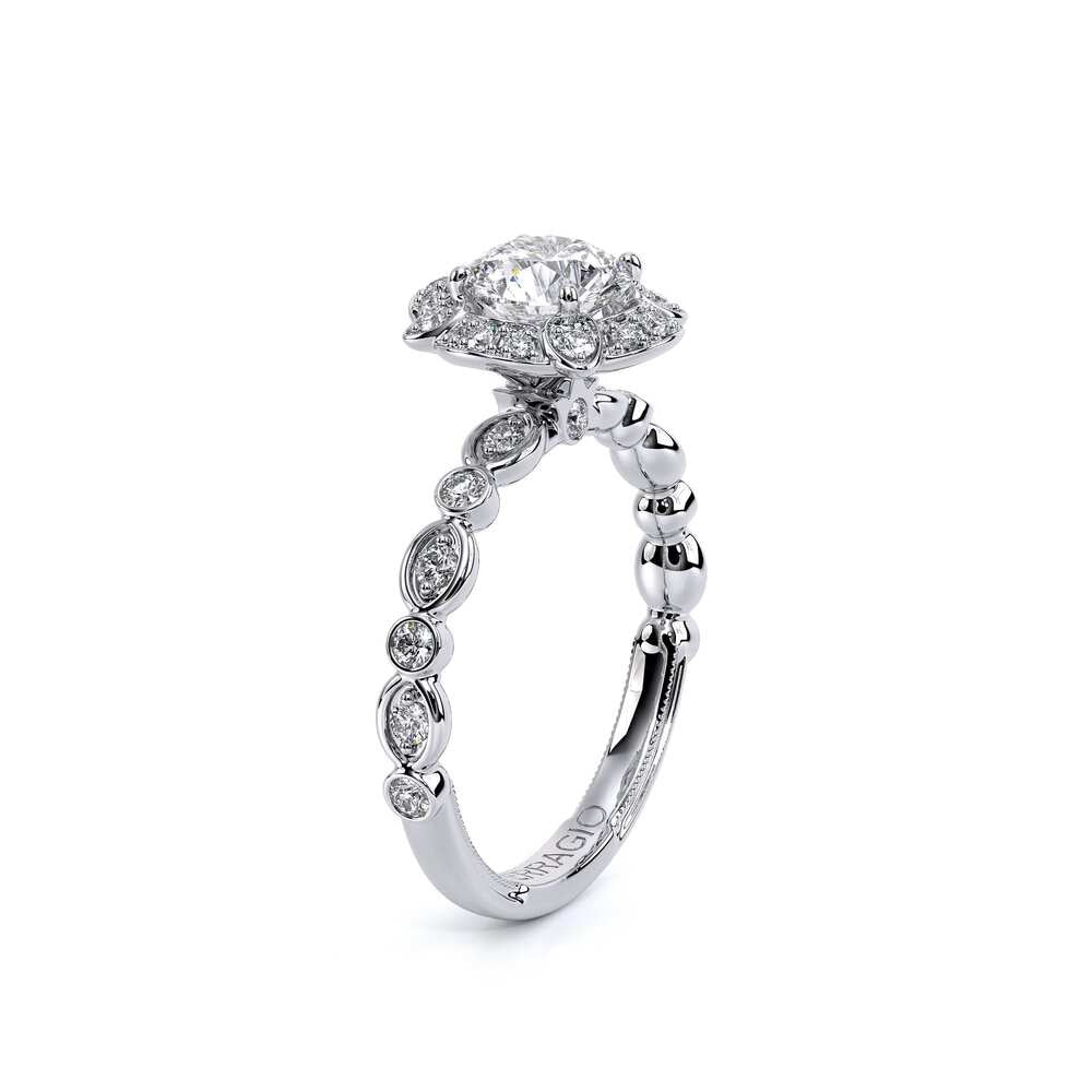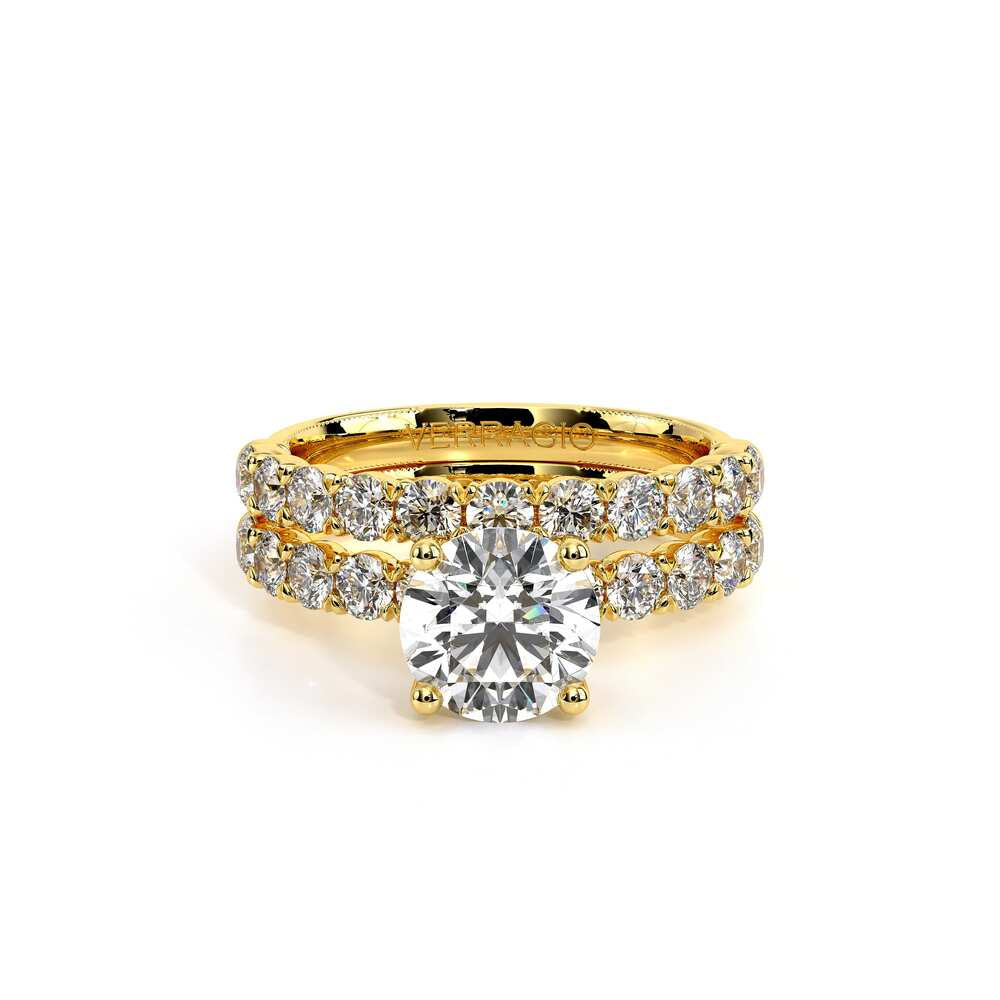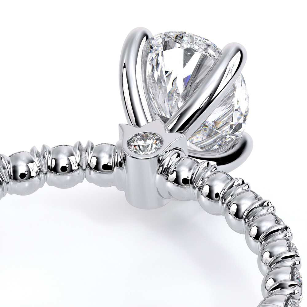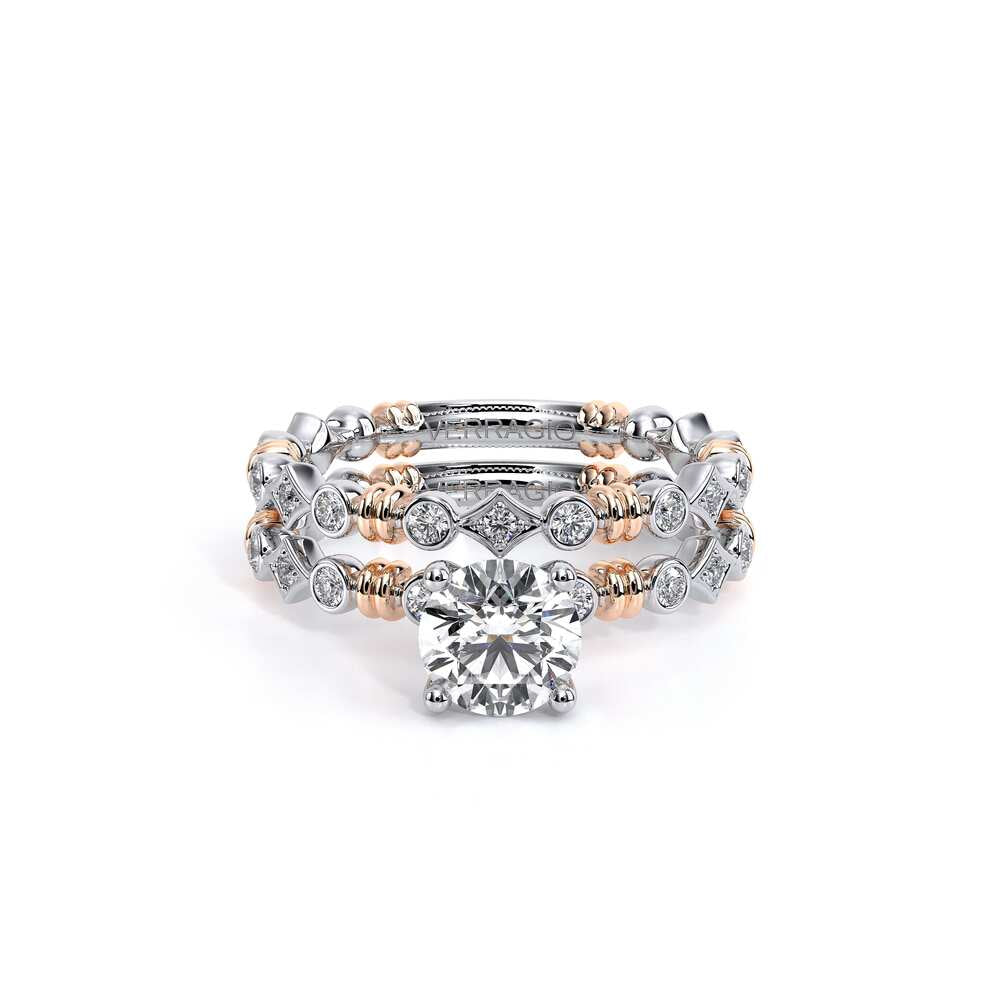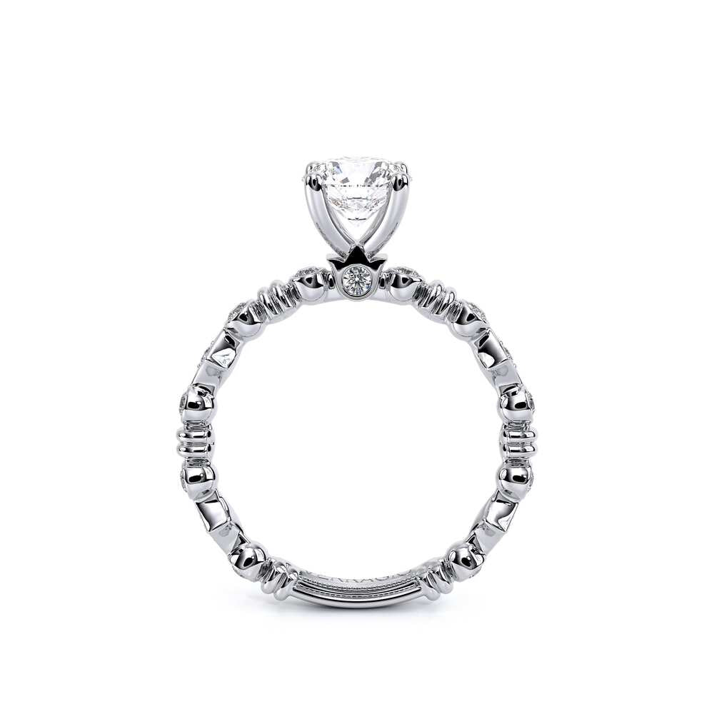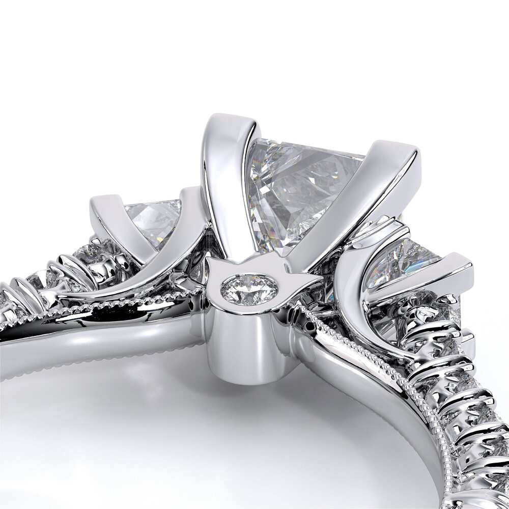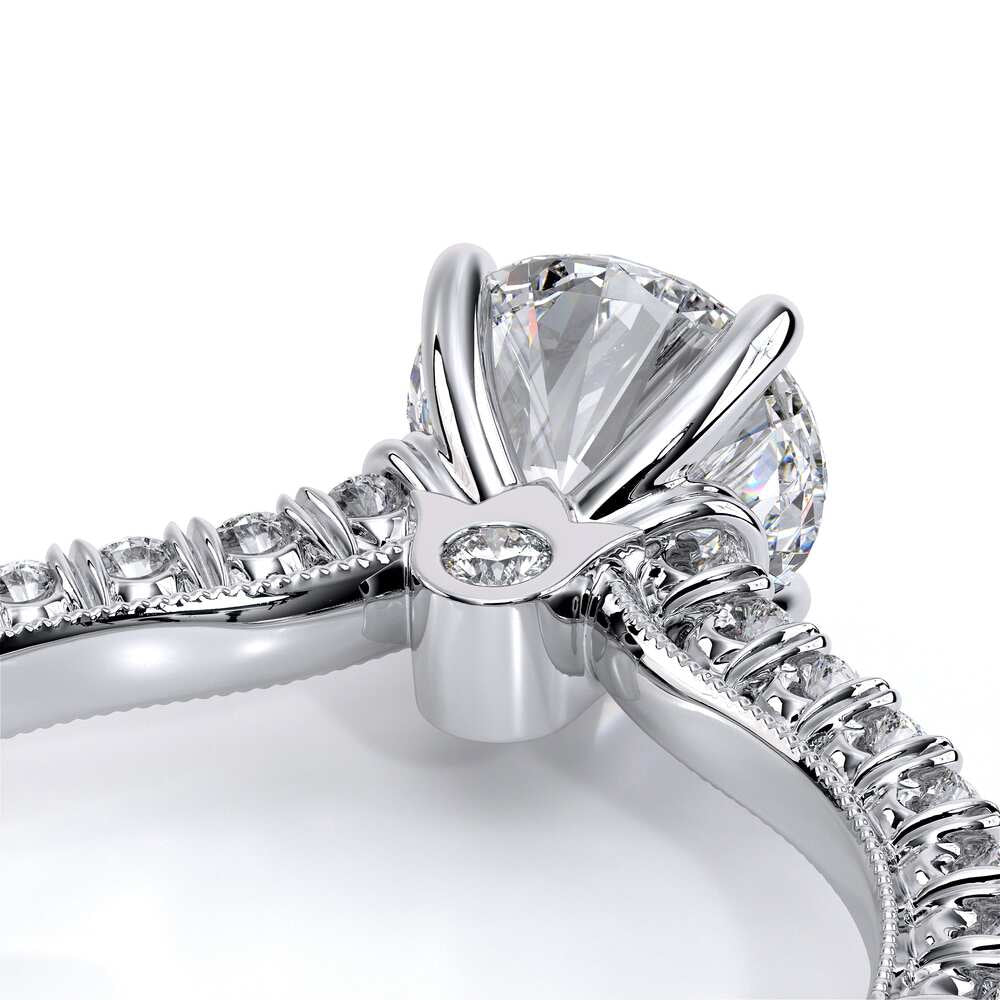 Renaissance-989P-2.0 features a diamond-rich, four-prong setting meticulously crafted to cradle each stone securely. Its sleek, shared-prong cup setting exudes elegance, while the design ensures both comfort and durability. Verragio's signature crest unifies the sophisticated style.
