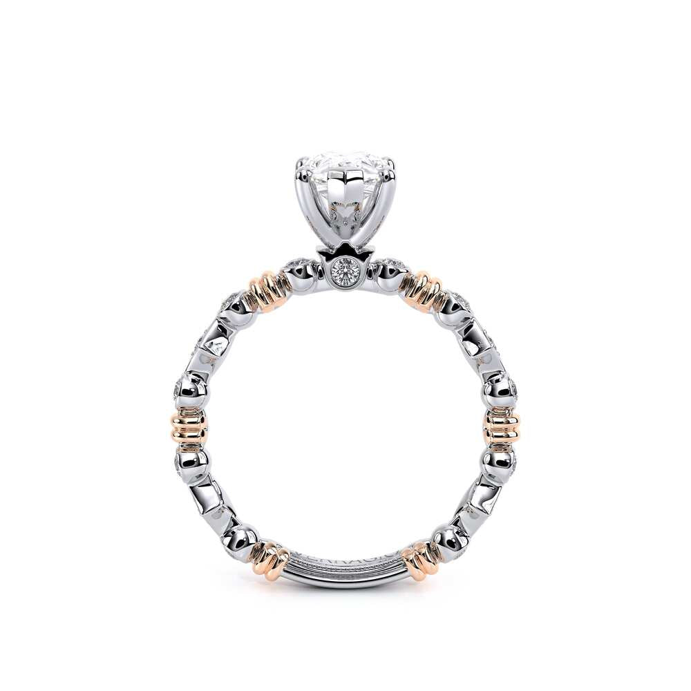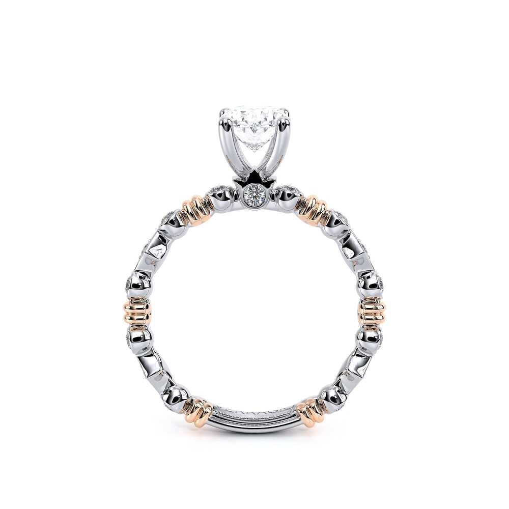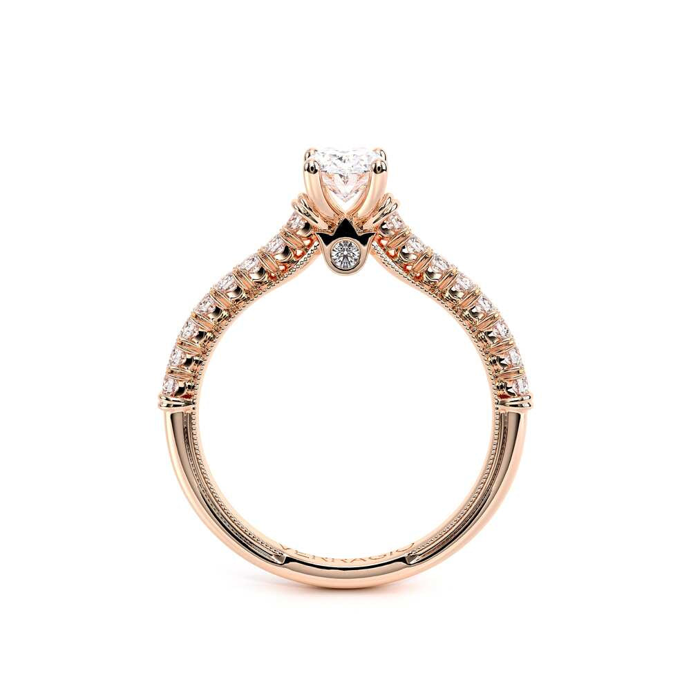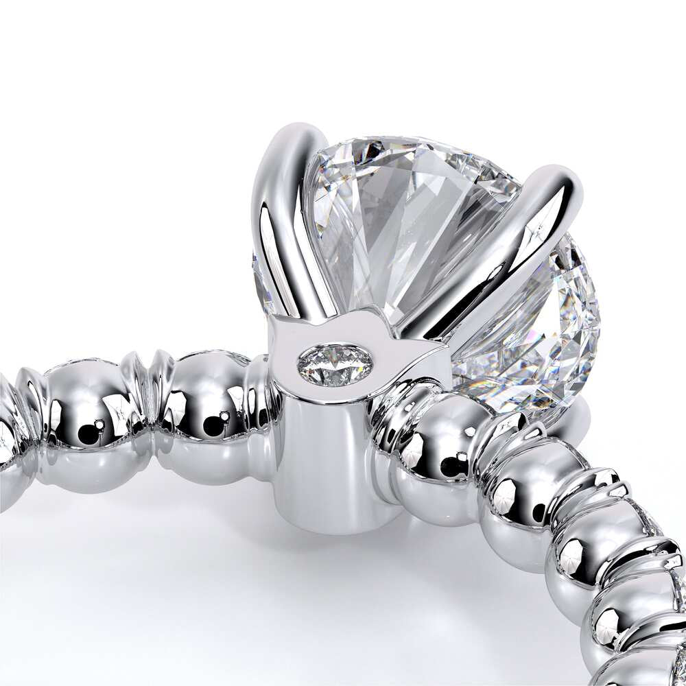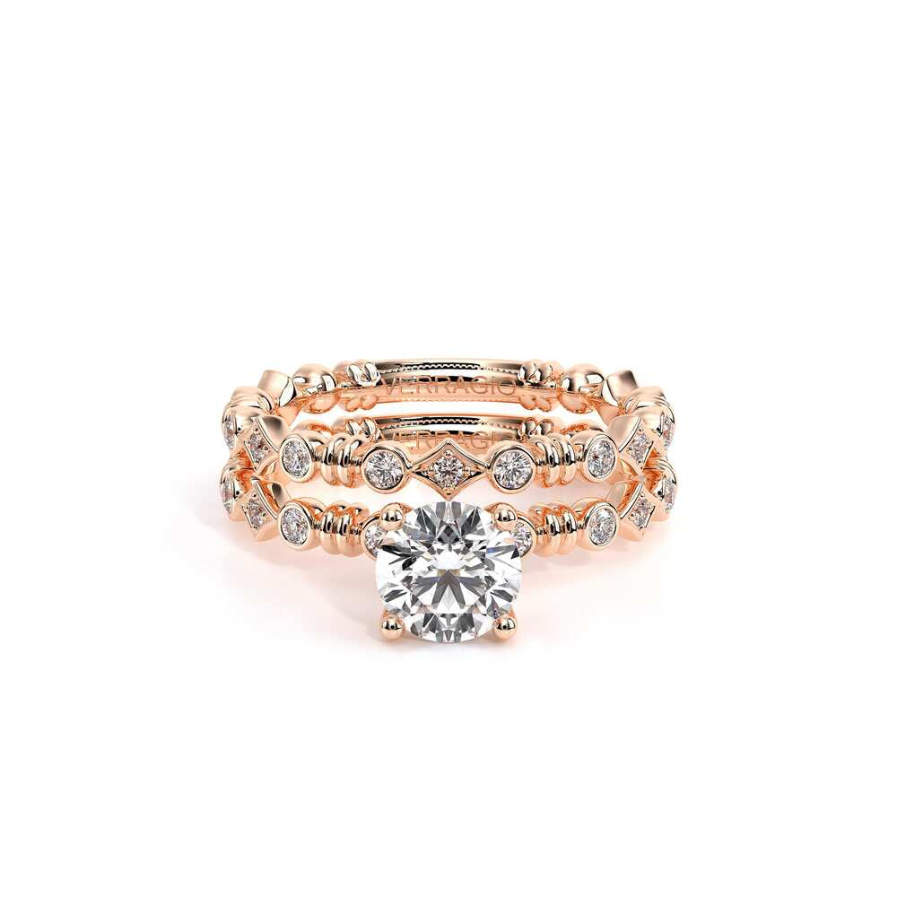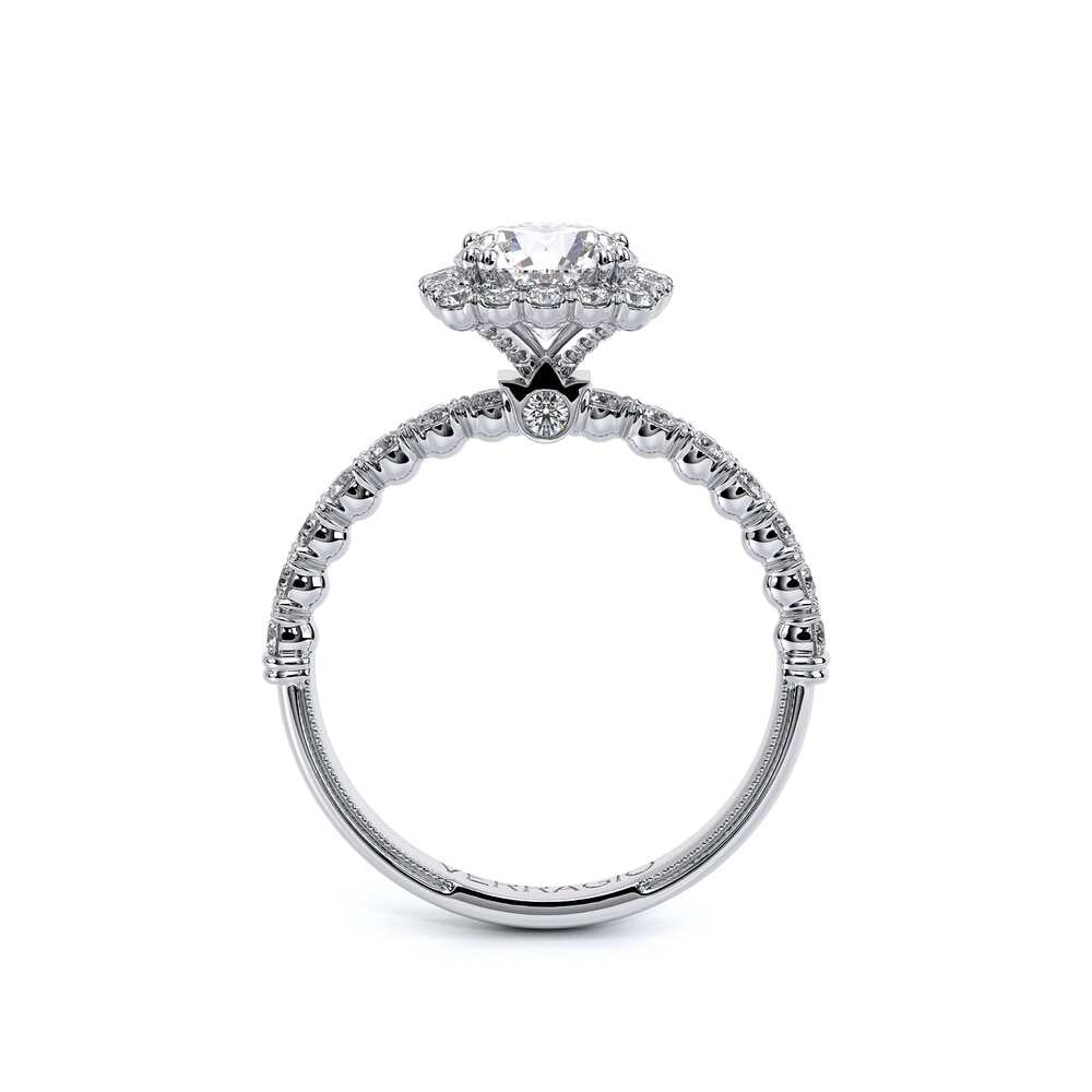 Renaissance-989P-2.0 features a diamond-rich, four-prong setting meticulously crafted to cradle each stone securely. Its sleek, shared-prong cup setting exudes elegance, while the design ensures both comfort and durability. Verragio's signature crest unifies the sophisticated style.