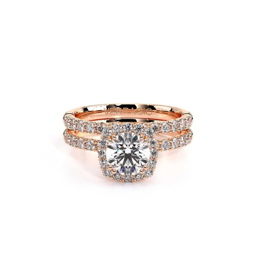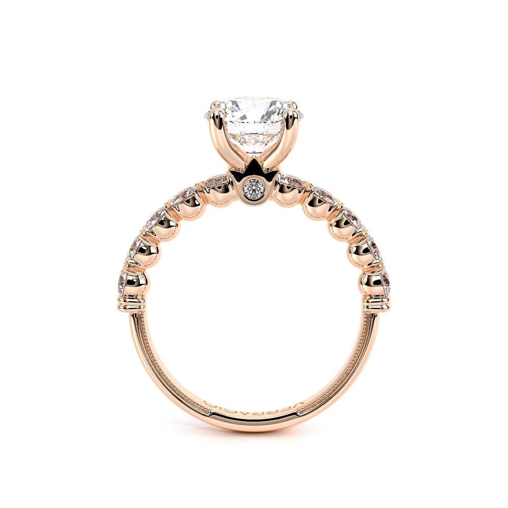 Renaissance-989R-2.0 features a diamond-rich, four-prong setting meticulously crafted to cradle each stone securely. Its sleek, shared-prong cup setting exudes elegance, while the design ensures both comfort and durability. Verragio's signature crest unifies the sophisticated style.