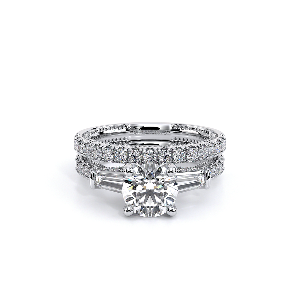 Renaissance-991R-S is a captivating three-stone engagement ring featuring baguette diamonds. Pave diamonds beautifully frame your center stone; the simple shank adorned with delicate milgrain detail elevates this ring with vintage charm. The Verragio signature crest completes the refinement of this piece.