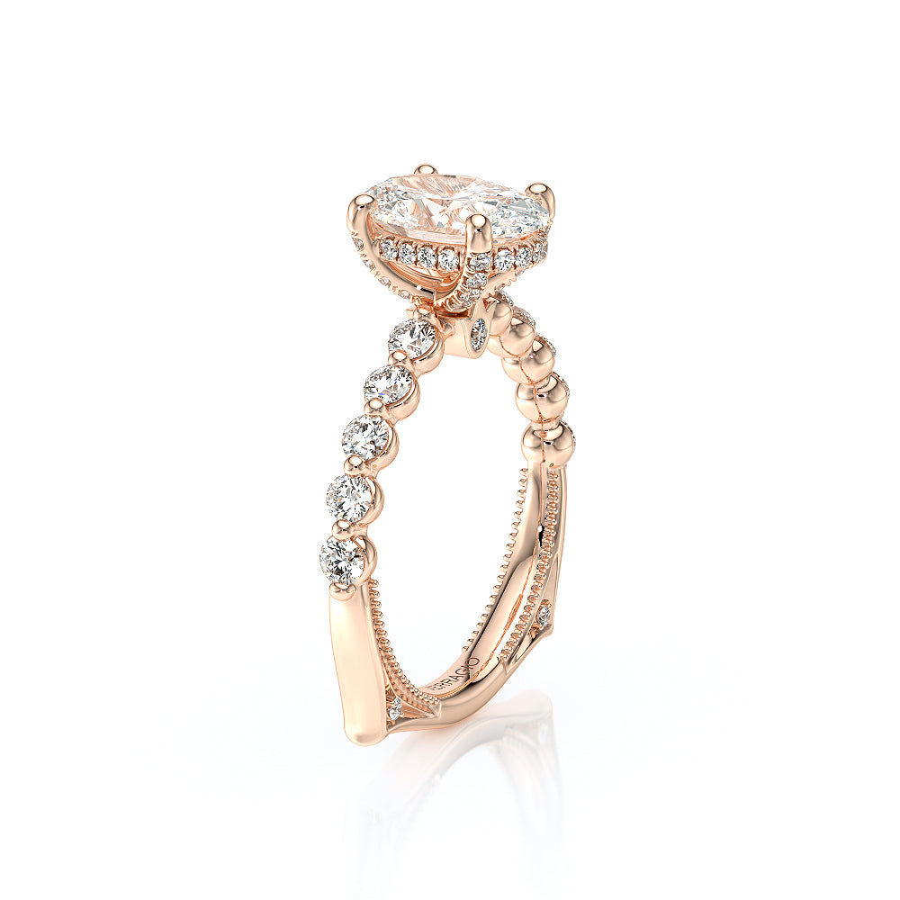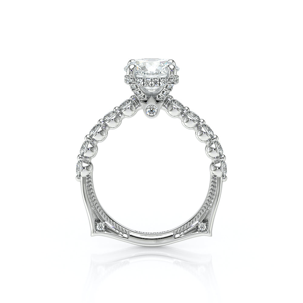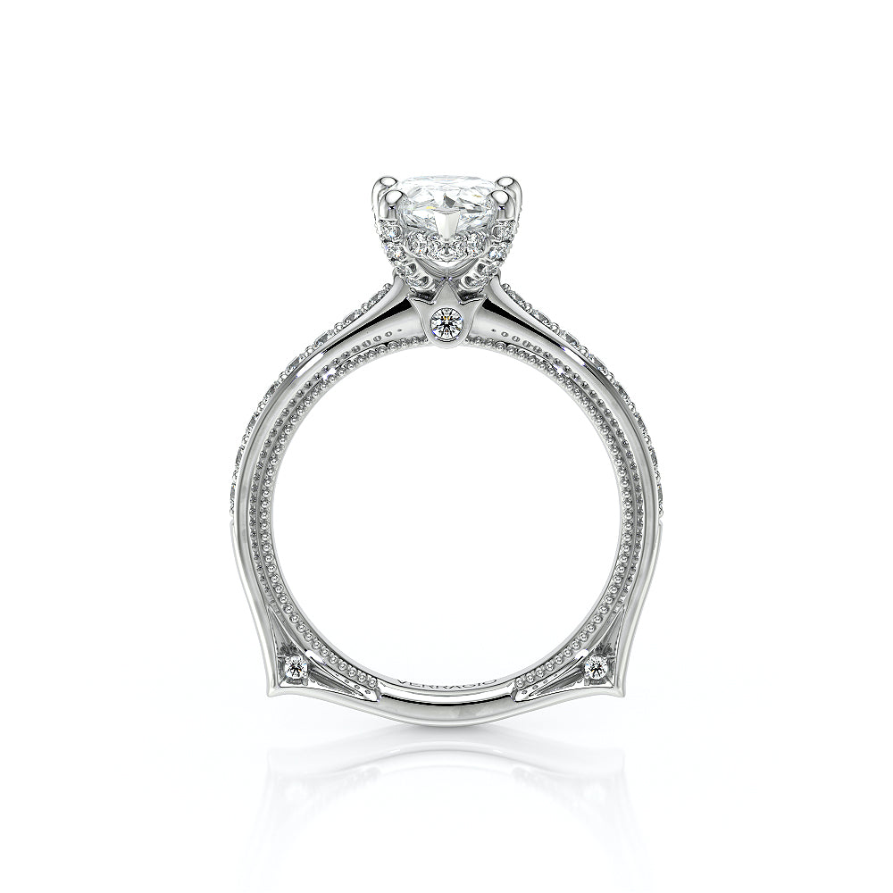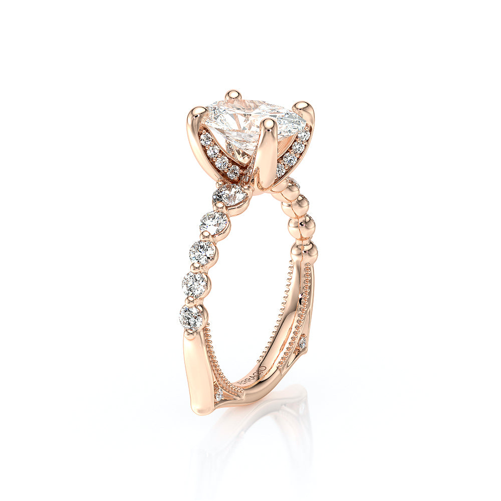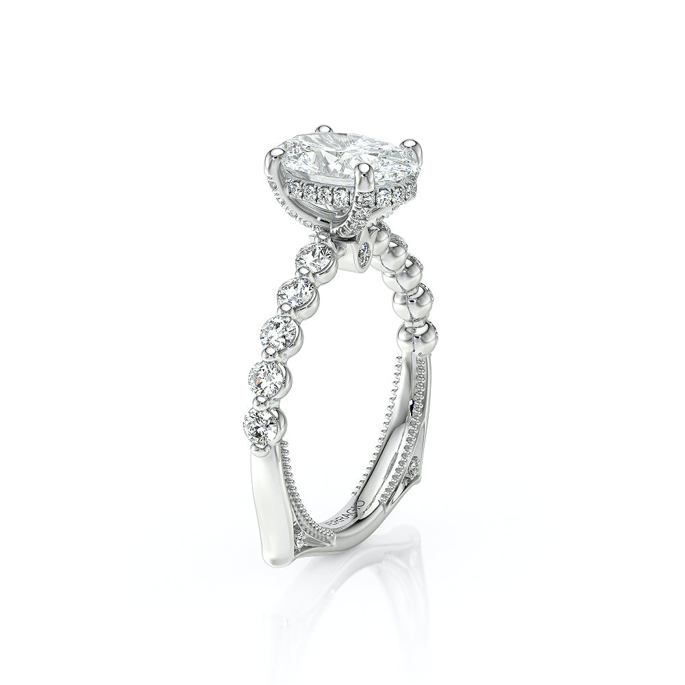 The VNG-2204OV features a knife-edge shank with round stones flowing along both sides, paired with Verragio beading on the side profile and diamond-accented prongs for a harmonious look.