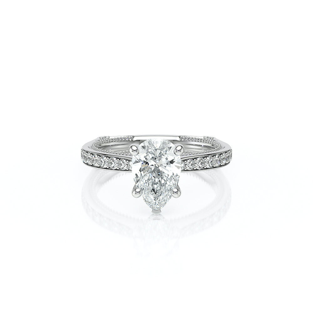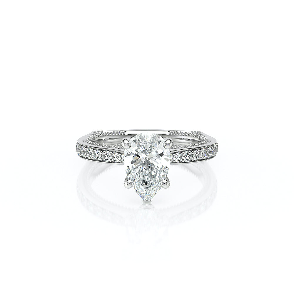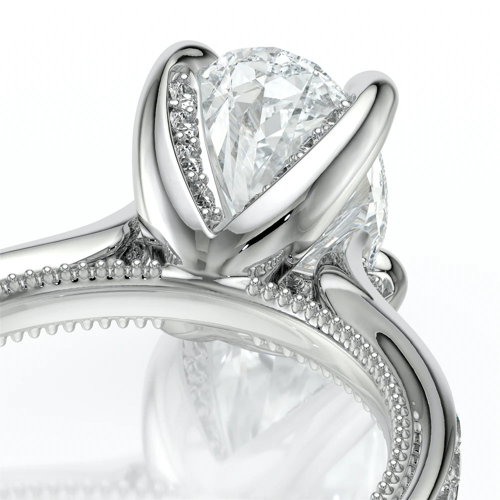 Set for a pear-shaped center, the VNG-2201PS-2.4 features a euro-style shank at the bottom of the ring, elevated by two tiny diamond bezels. 2.4mm stones gracefully adorn the shank, set with a single shared prong for a timeless and elegant design.