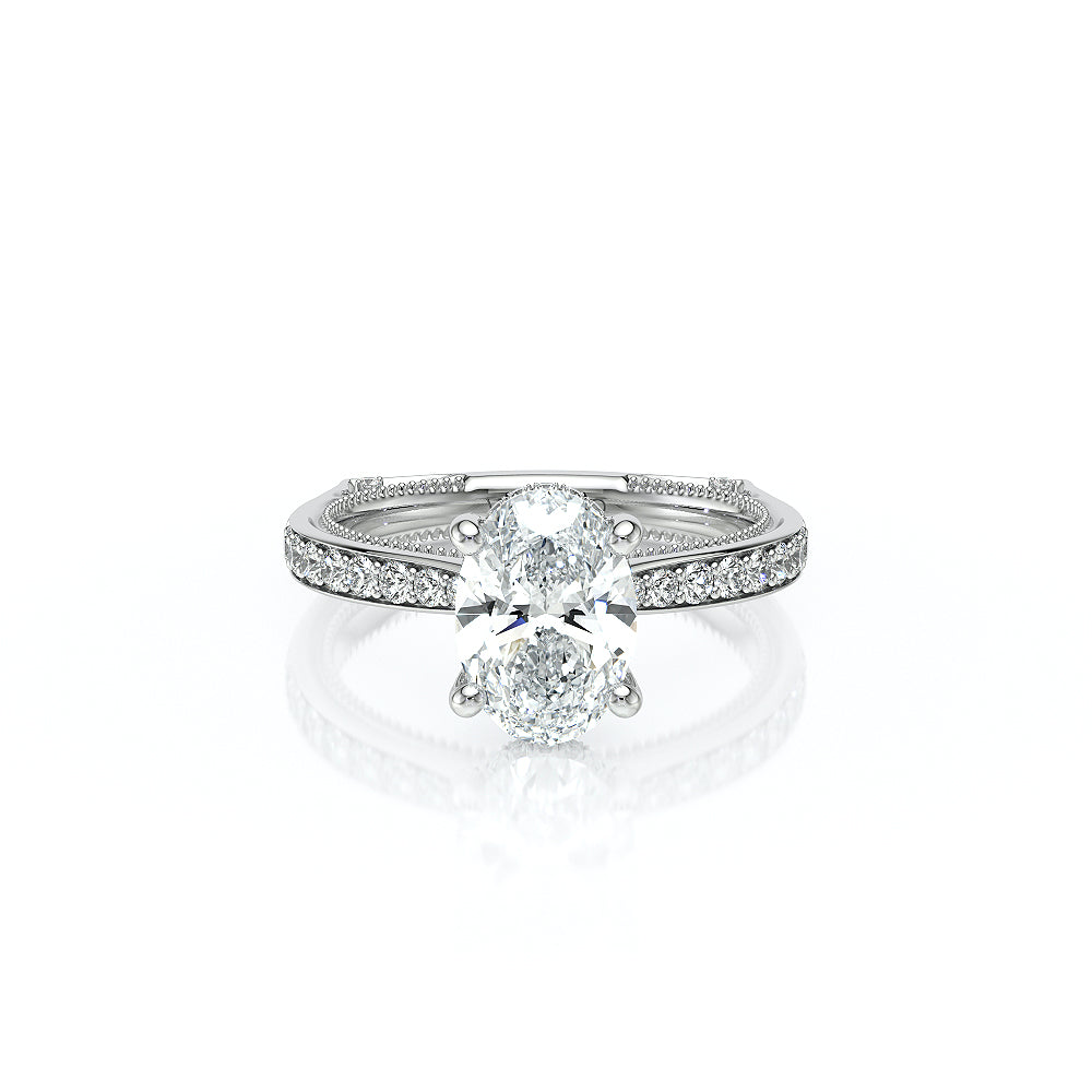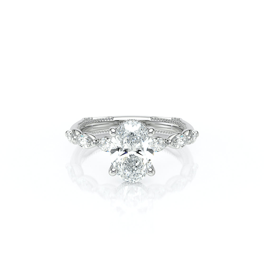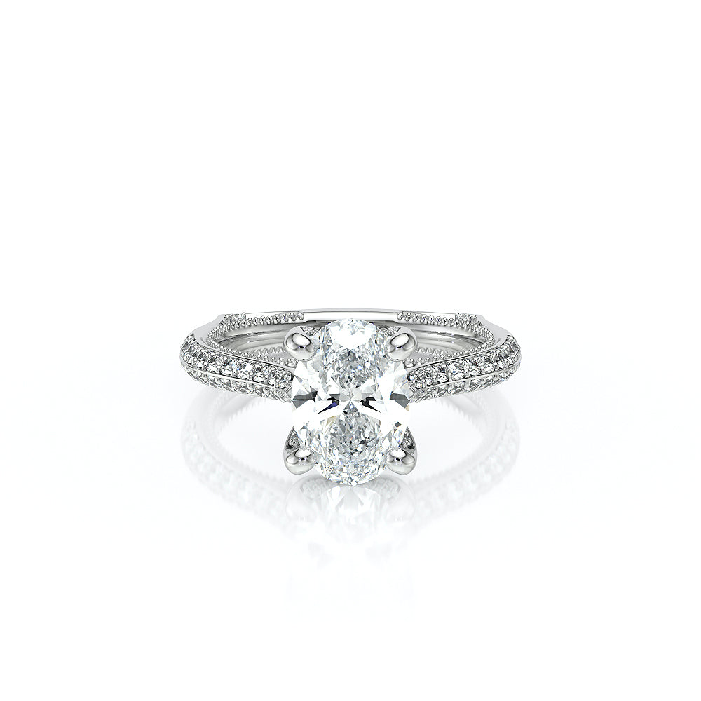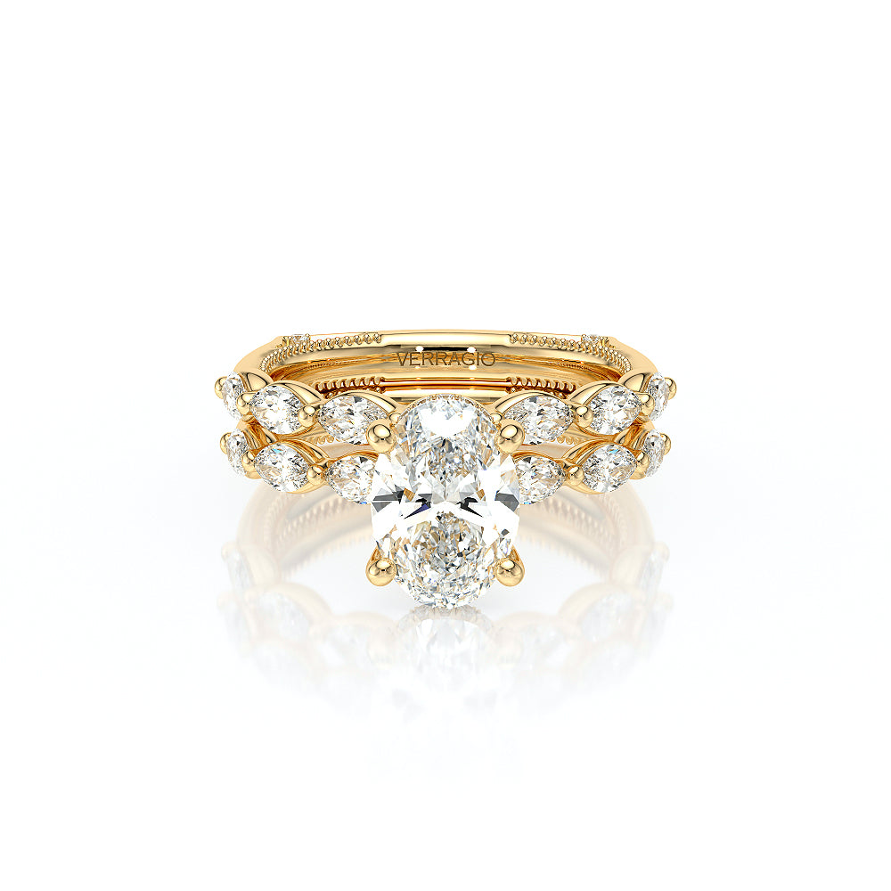 The VNG-2207OV pairs its euro-style design with an oval-shaped center stone setting, complemented by two bezels, signature Verragio beading, and two rows of diamonds on each side of the prong for an exquisite finish.
