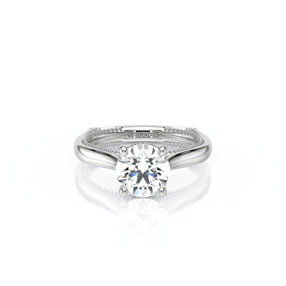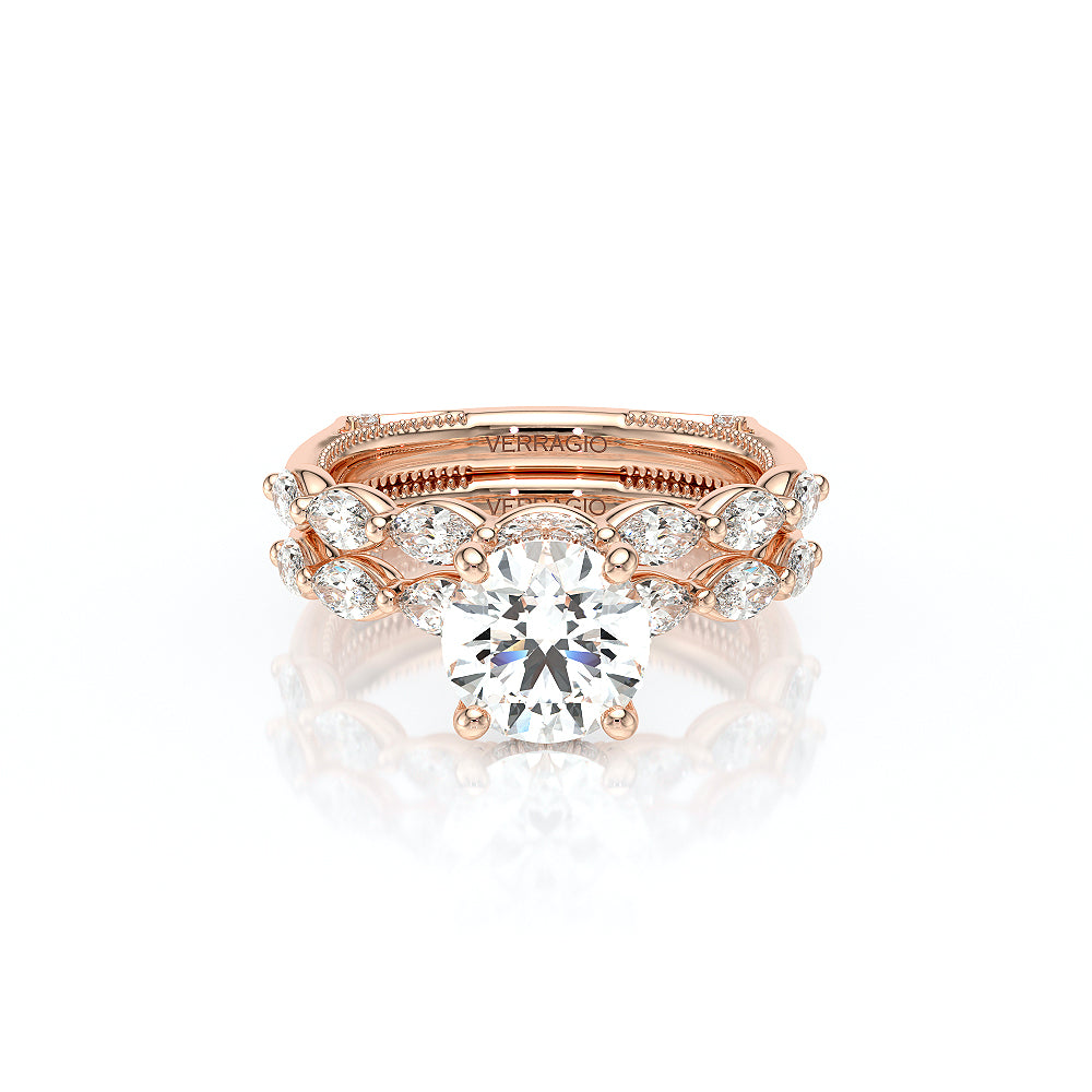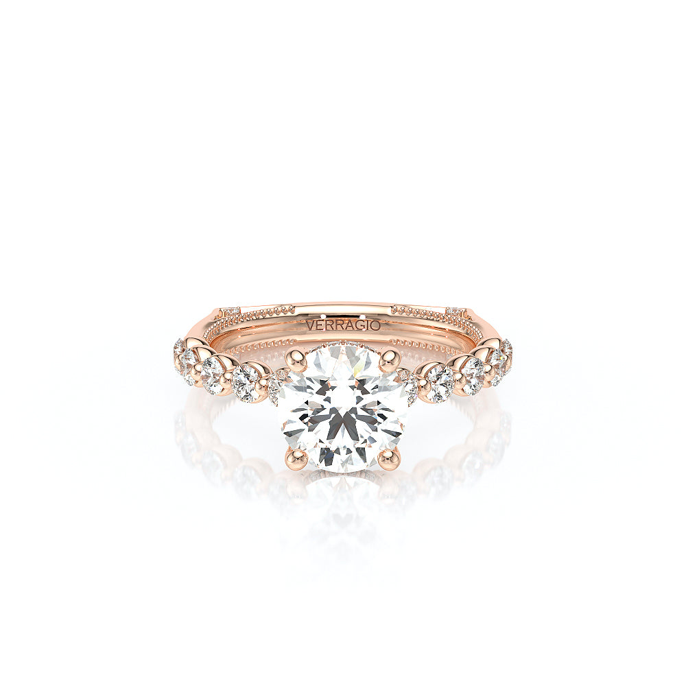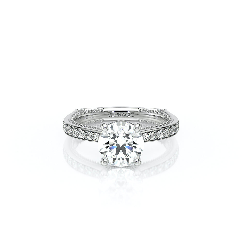 The VNG-2204R showcases a knife-edge shank with round stones on both sides, enhanced by Verragio beading on the side profile and diamond-accented prongs that perfectly complement the design.