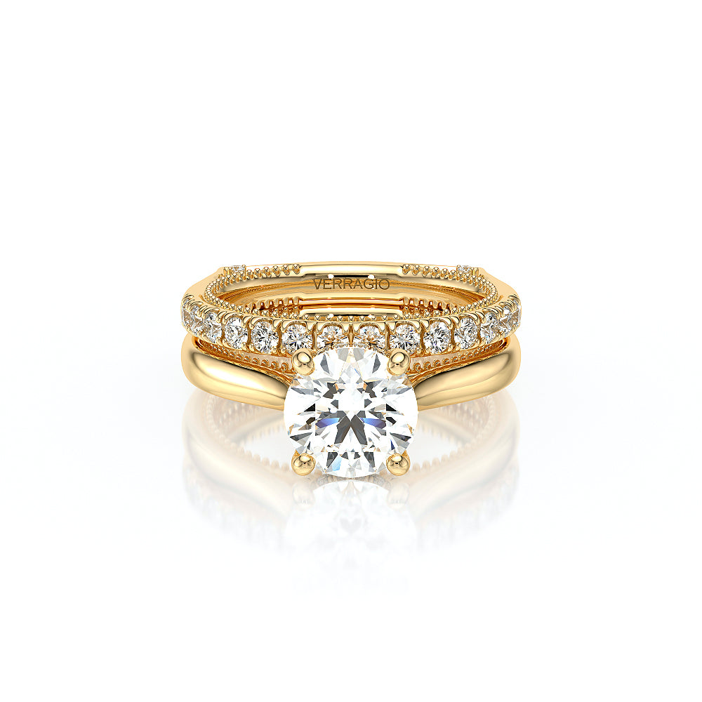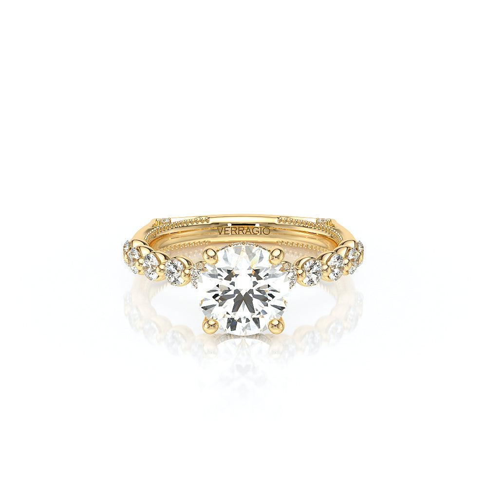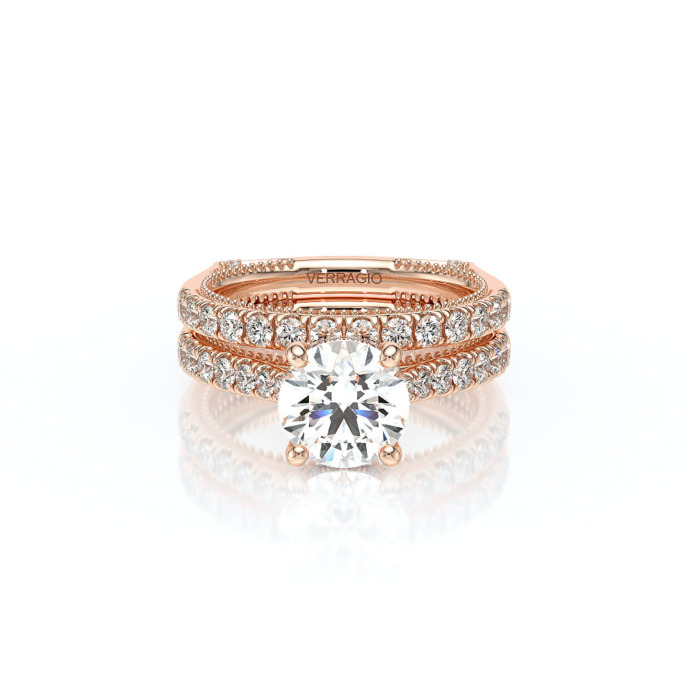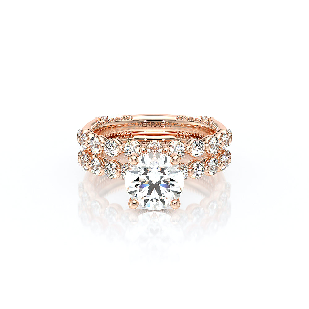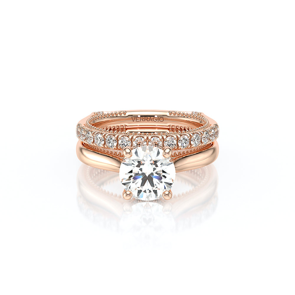 The VNG-2204R showcases a knife-edge shank with round stones on both sides, enhanced by Verragio beading on the side profile and diamond-accented prongs that perfectly complement the design.