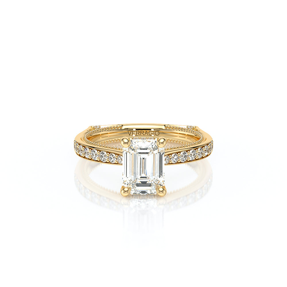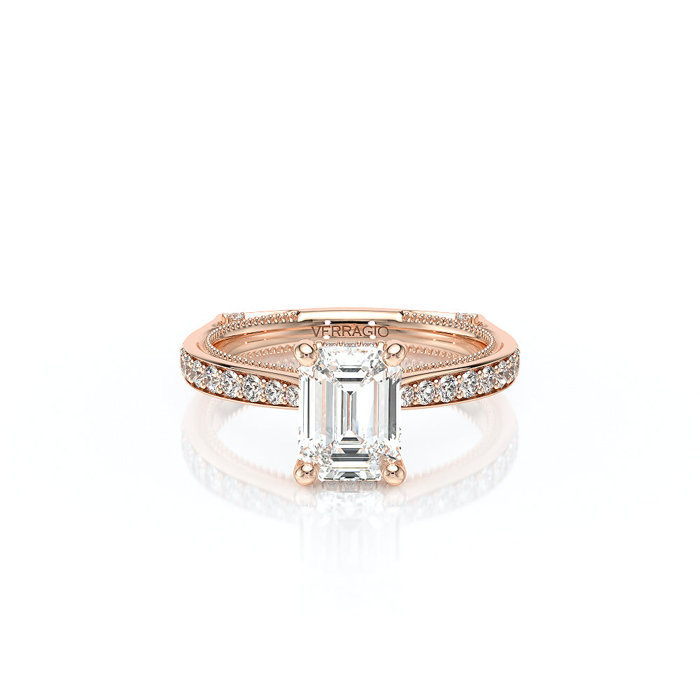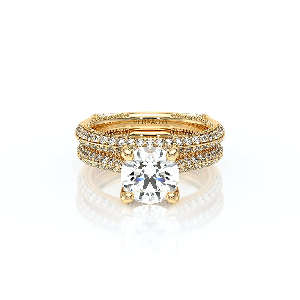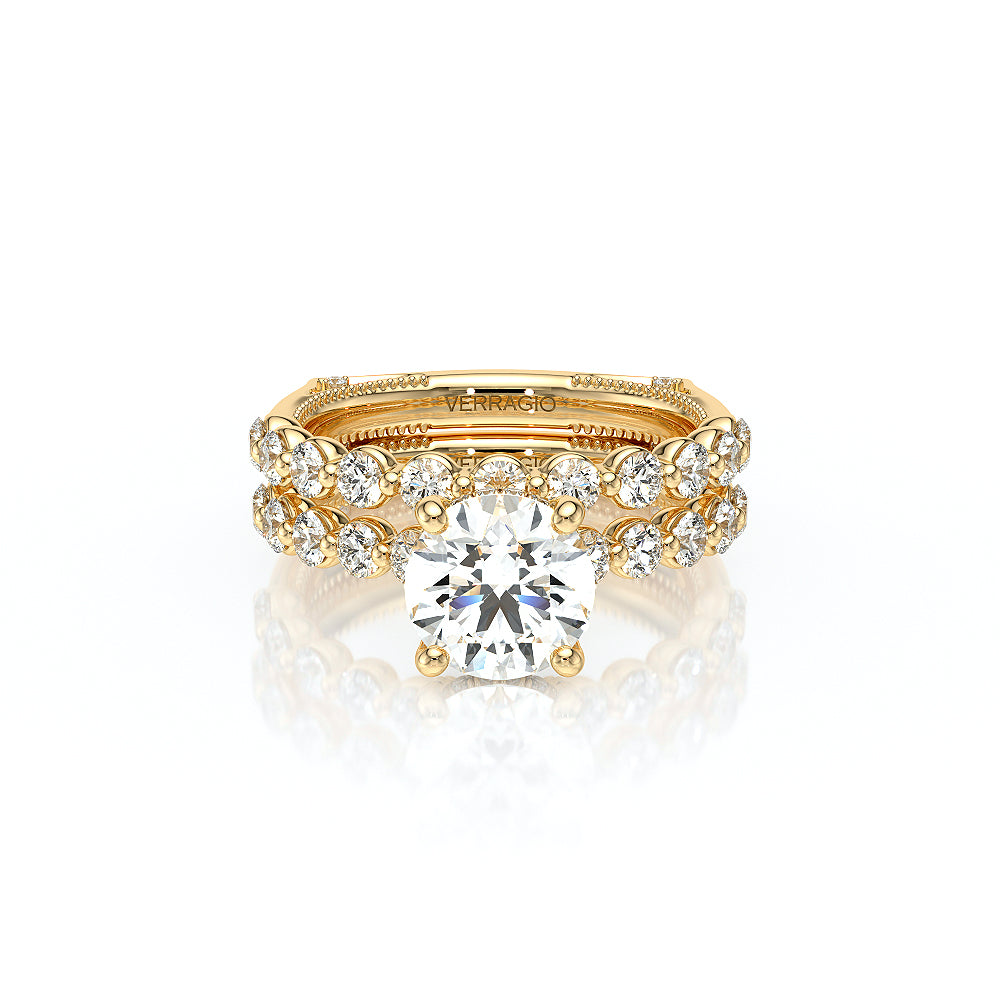 The VNG-2204R showcases a knife-edge shank with round stones on both sides, enhanced by Verragio beading on the side profile and diamond-accented prongs that perfectly complement the design.