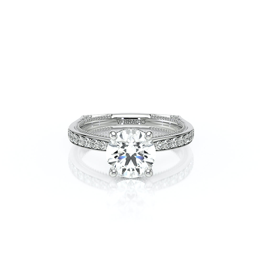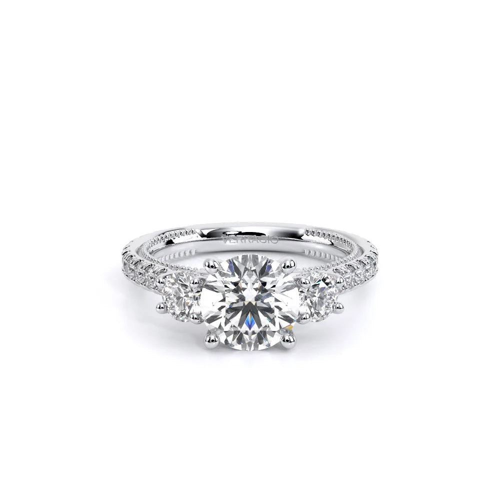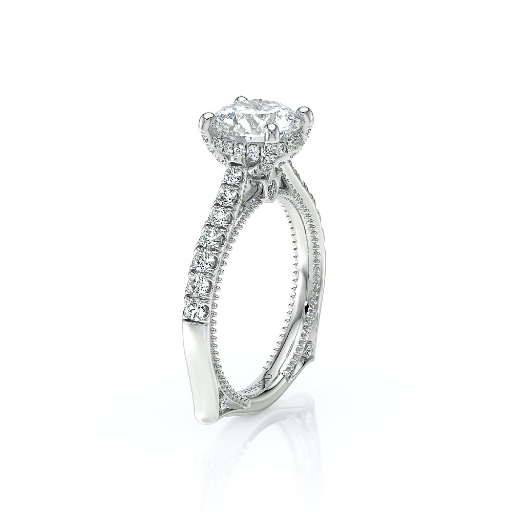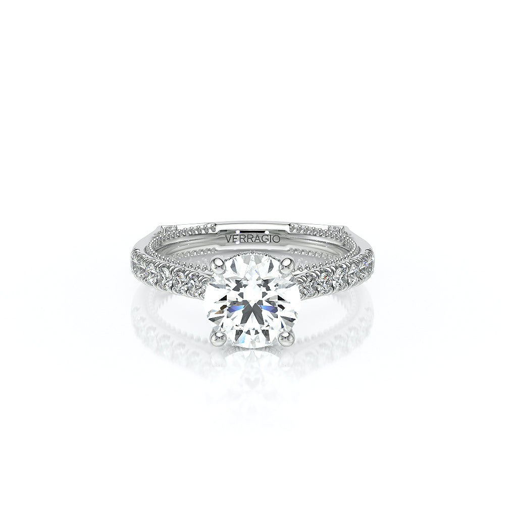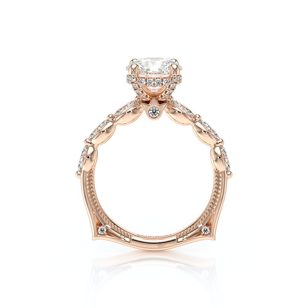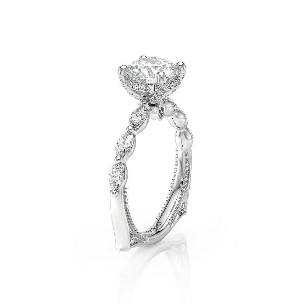 The VNG-2204P highlights a knife-edge shank with round stones, Verragio beading on the side profile, and diamond-accented prongs that enhance the overall aesthetic.
