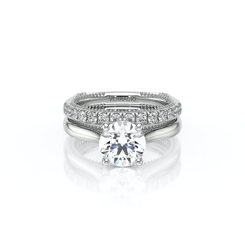 The minimalist embellisher, VNG-2032W, showcases Verragio's signature crest, offering a timeless design that enhances your engagement ring with understated elegance while reflecting the brand's iconic craftsmanship.