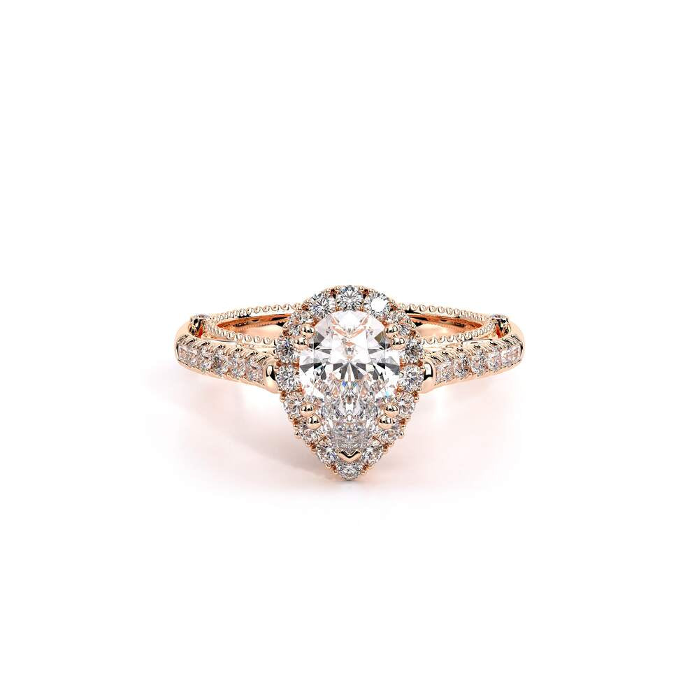 VENETIAN-5061PEAR engagement ring from the Venetian Collection, features a unique diamond adorned basket topped with a single halo made for a pear shaped center. A delicate straight shank encrusted with round brilliant diamonds completes this ornate design.