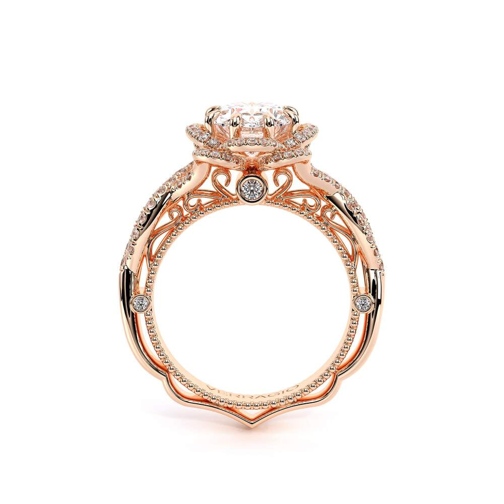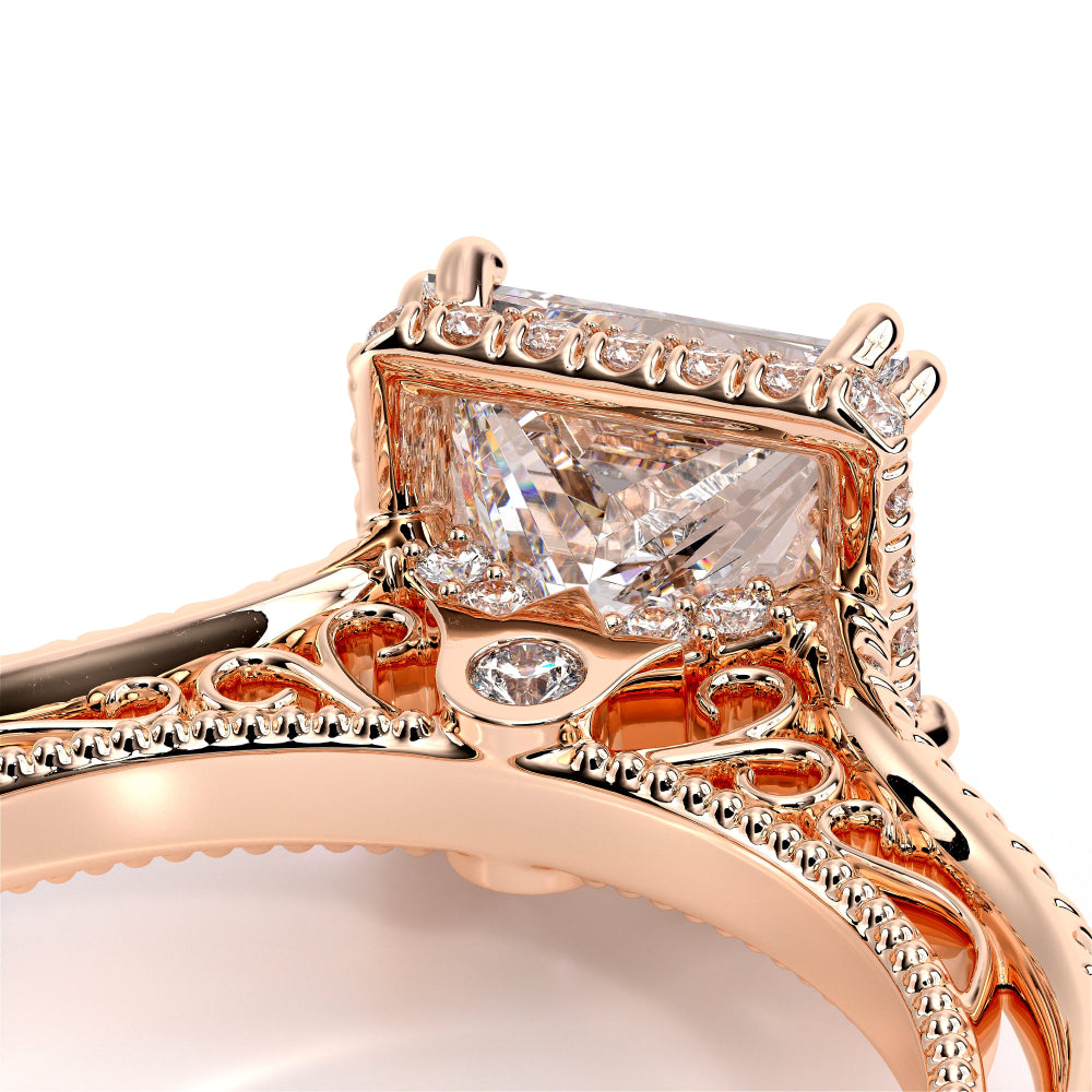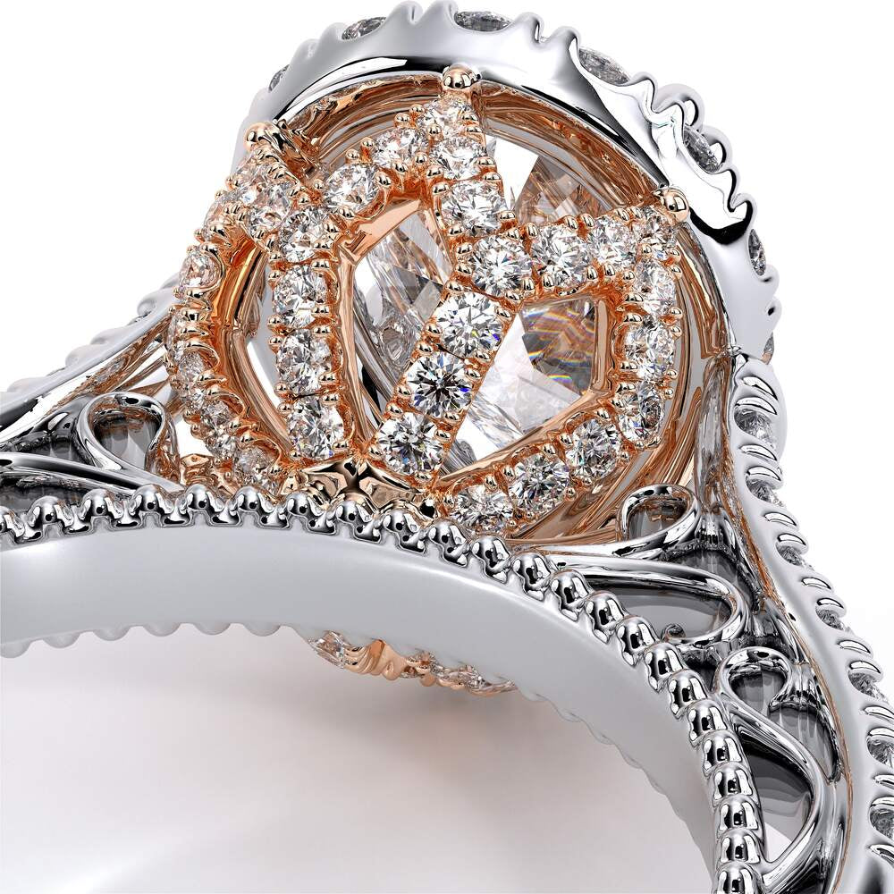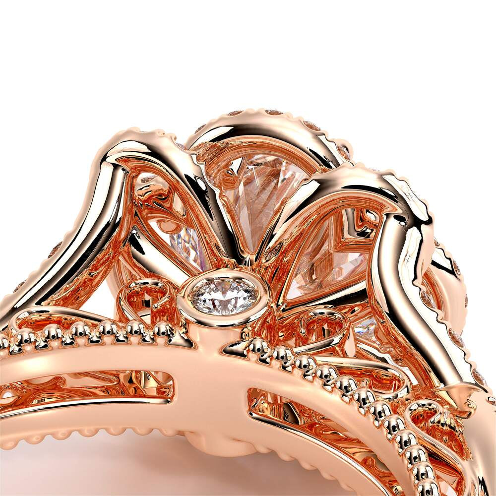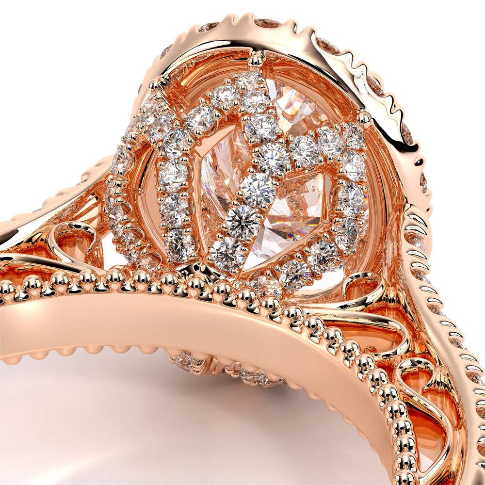 VENETIAN-5061CU engagement ring from the Venetian Collection, features a unique diamond adorned basket in rose gold topped with a cushion shaped single halo made for a round center. A delicate straight shank encrusted with round brilliant diamonds completes this beautiful ornate design.