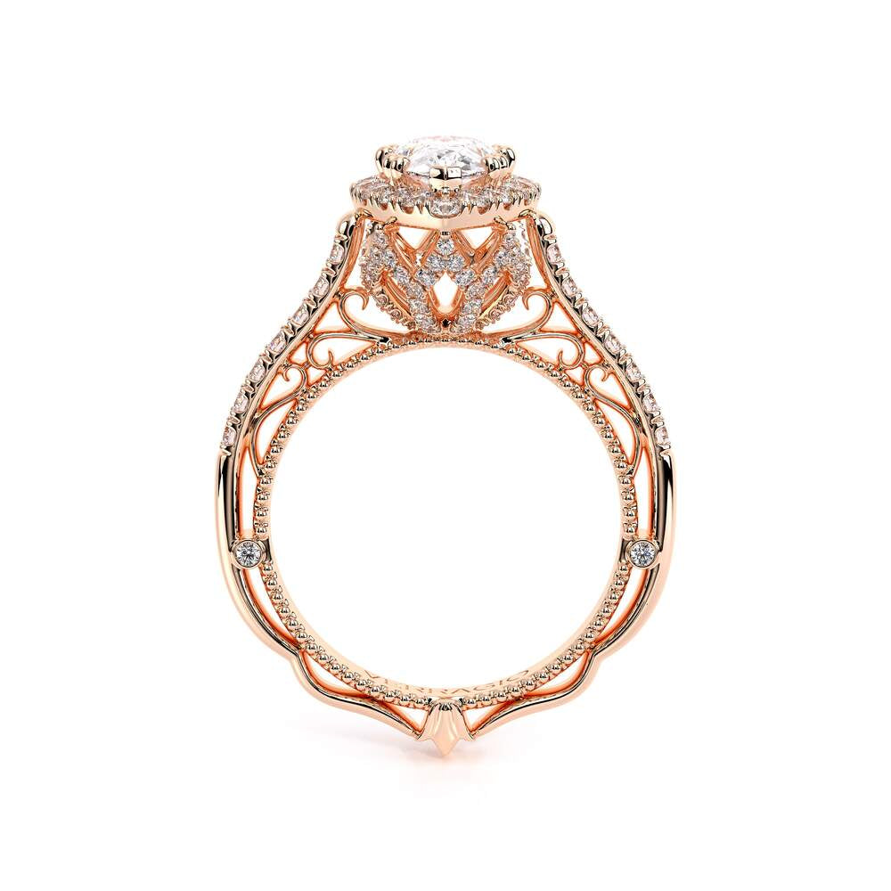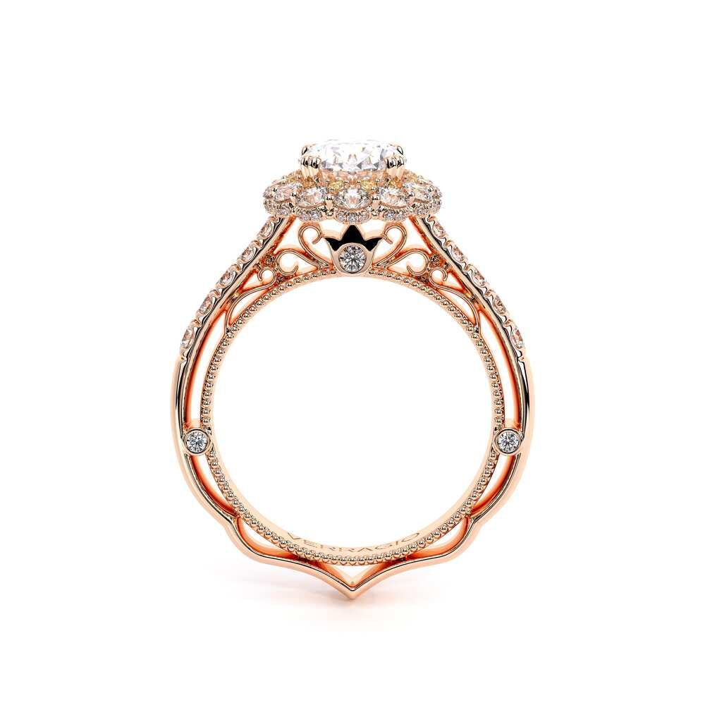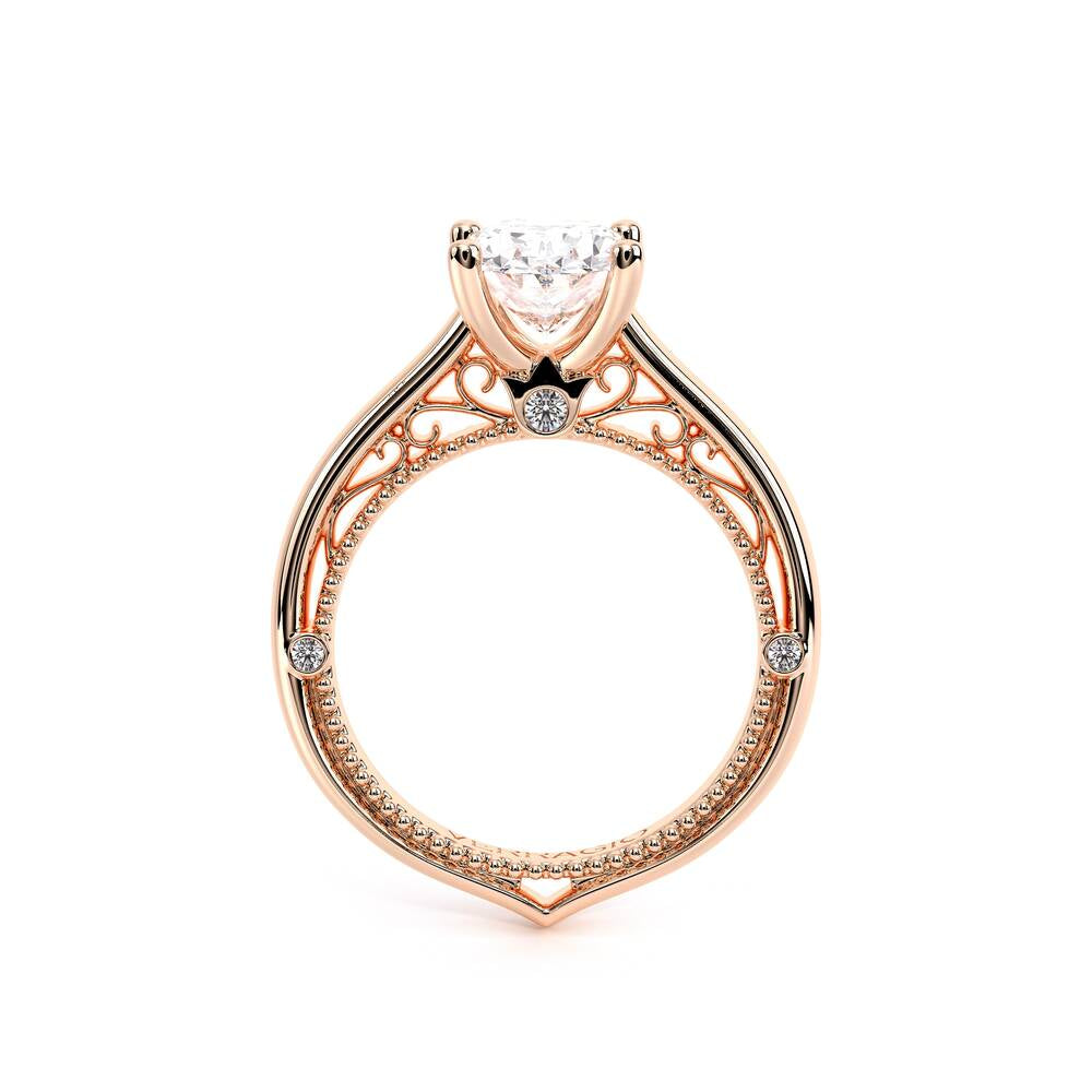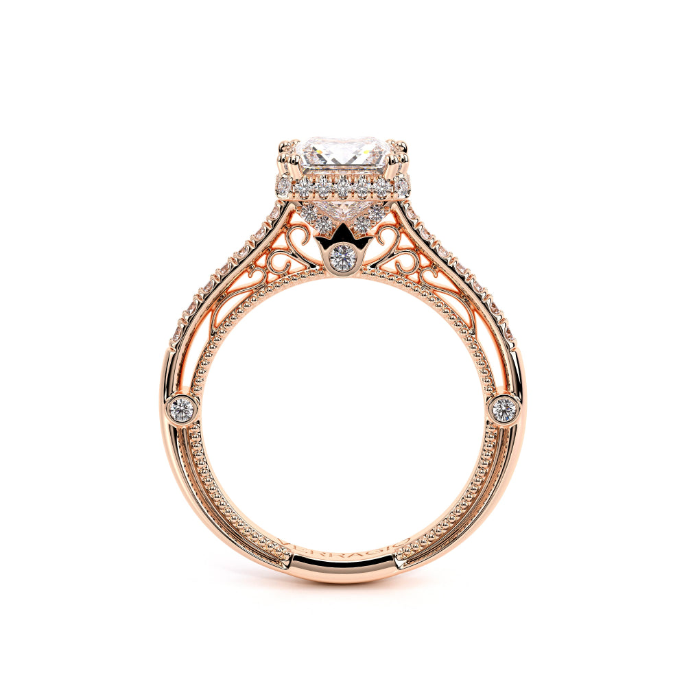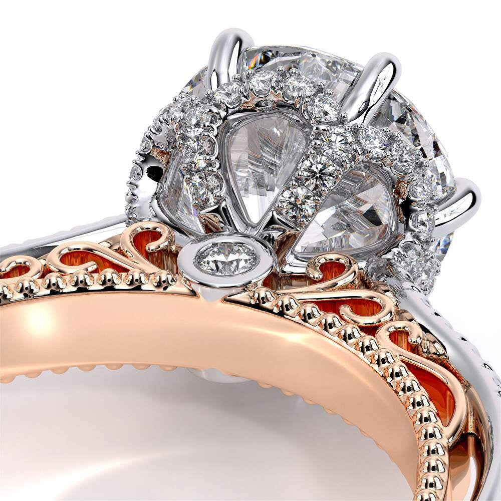 VENETIAN-5061CU engagement ring from the Venetian Collection, features a unique diamond adorned basket in rose gold topped with a cushion shaped single halo made for a round center. A delicate straight shank encrusted with round brilliant diamonds completes this beautiful ornate design.