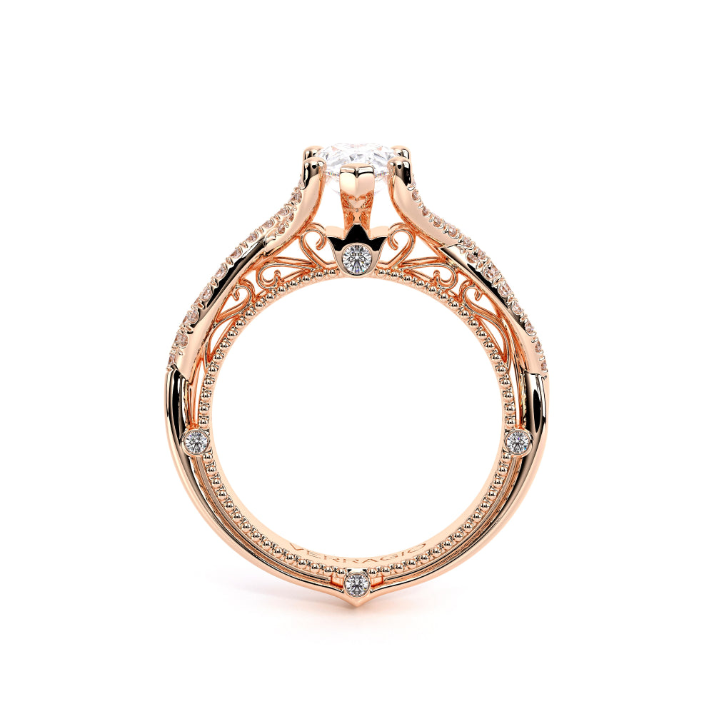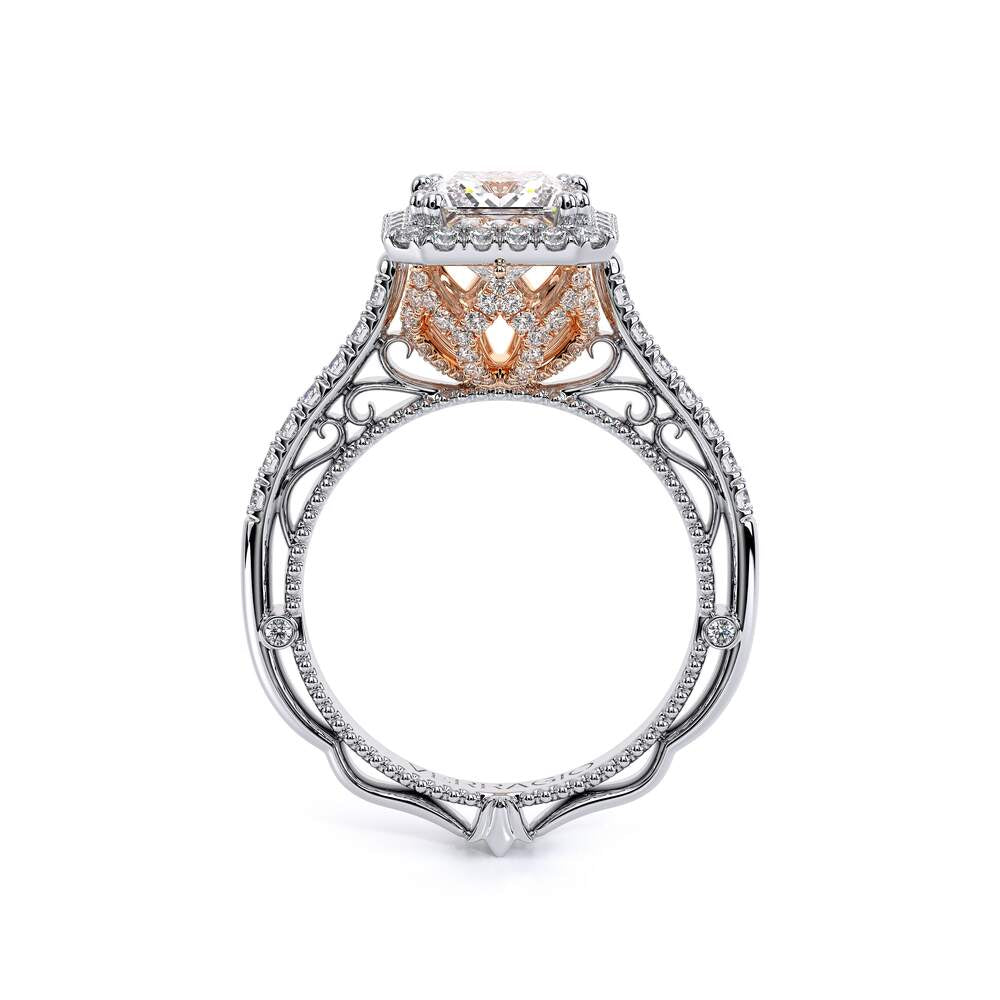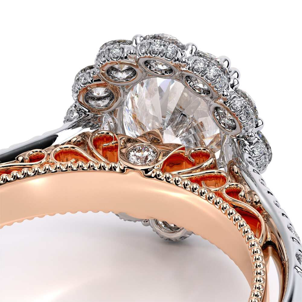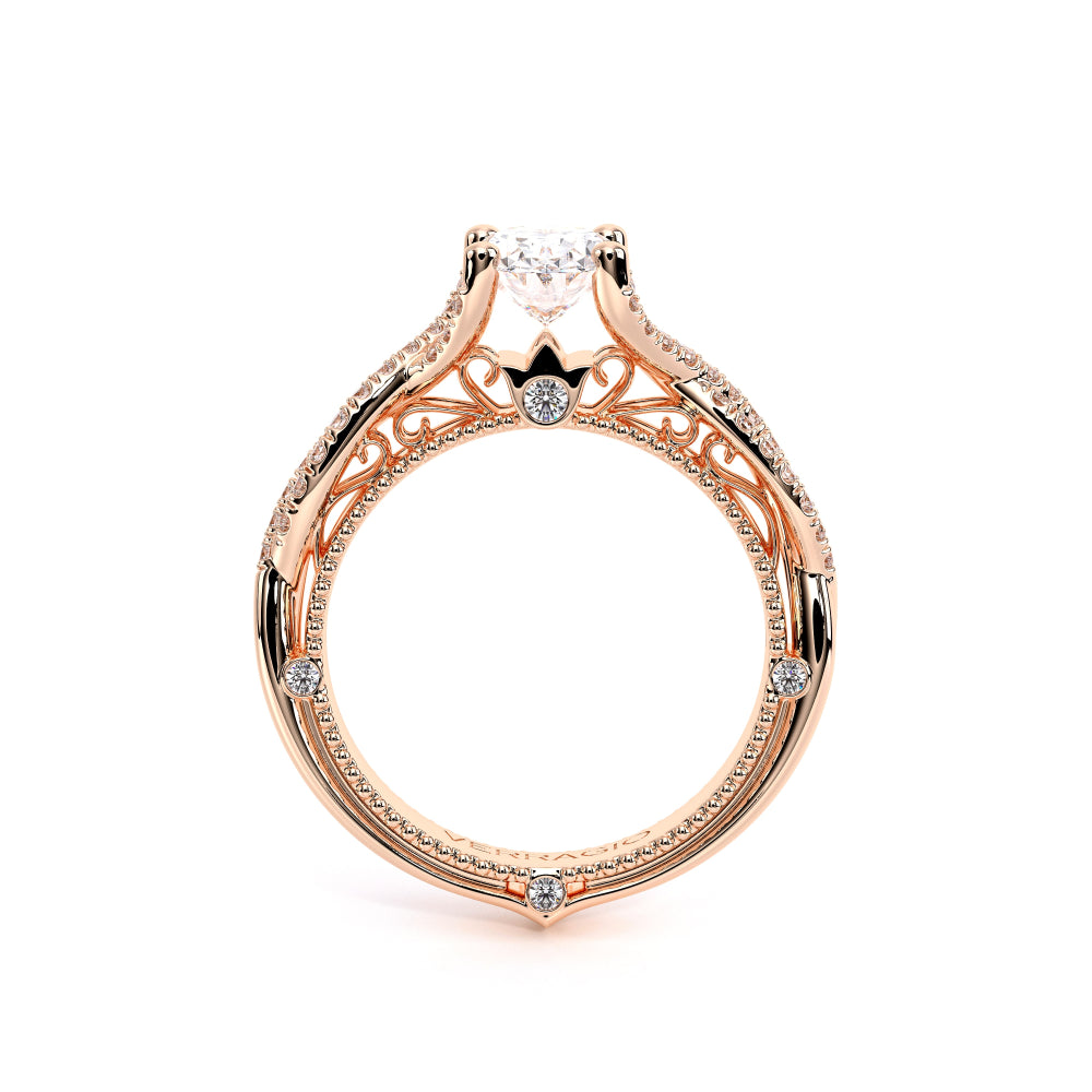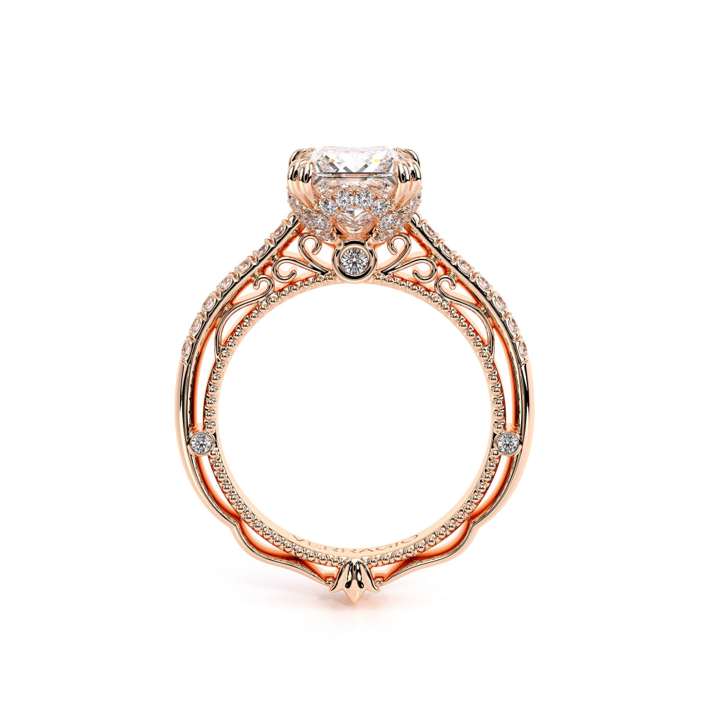 VENETIAN-5061CU engagement ring from the Venetian Collection, features a unique diamond adorned basket in rose gold topped with a cushion shaped single halo made for a round center. A delicate straight shank encrusted with round brilliant diamonds completes this beautiful ornate design.