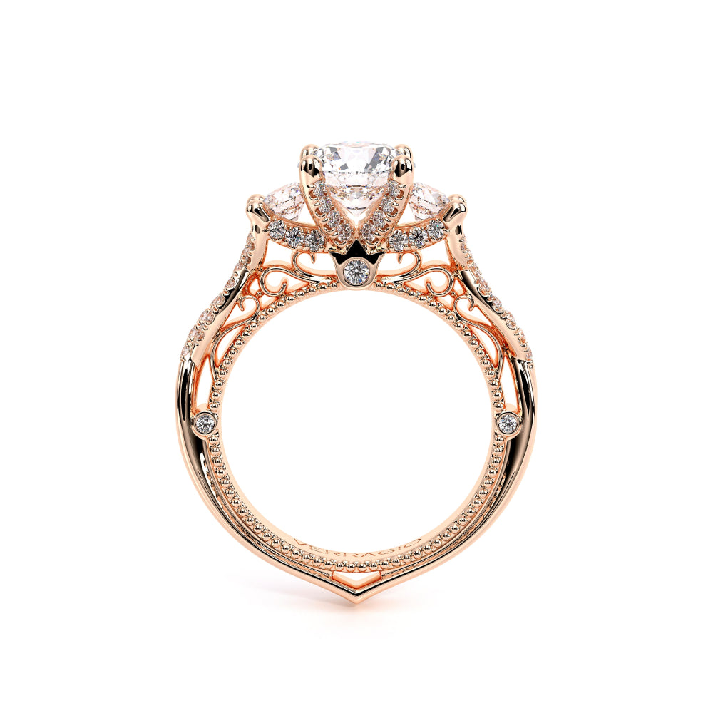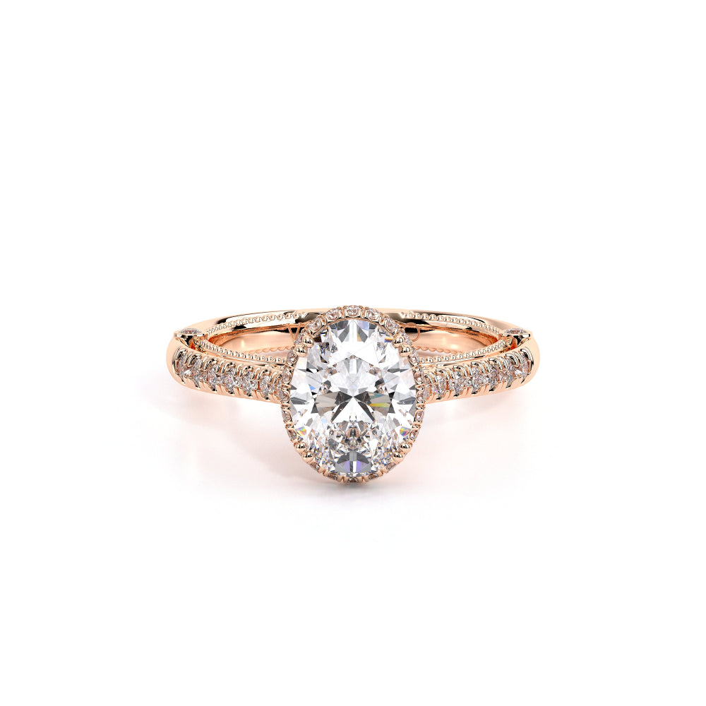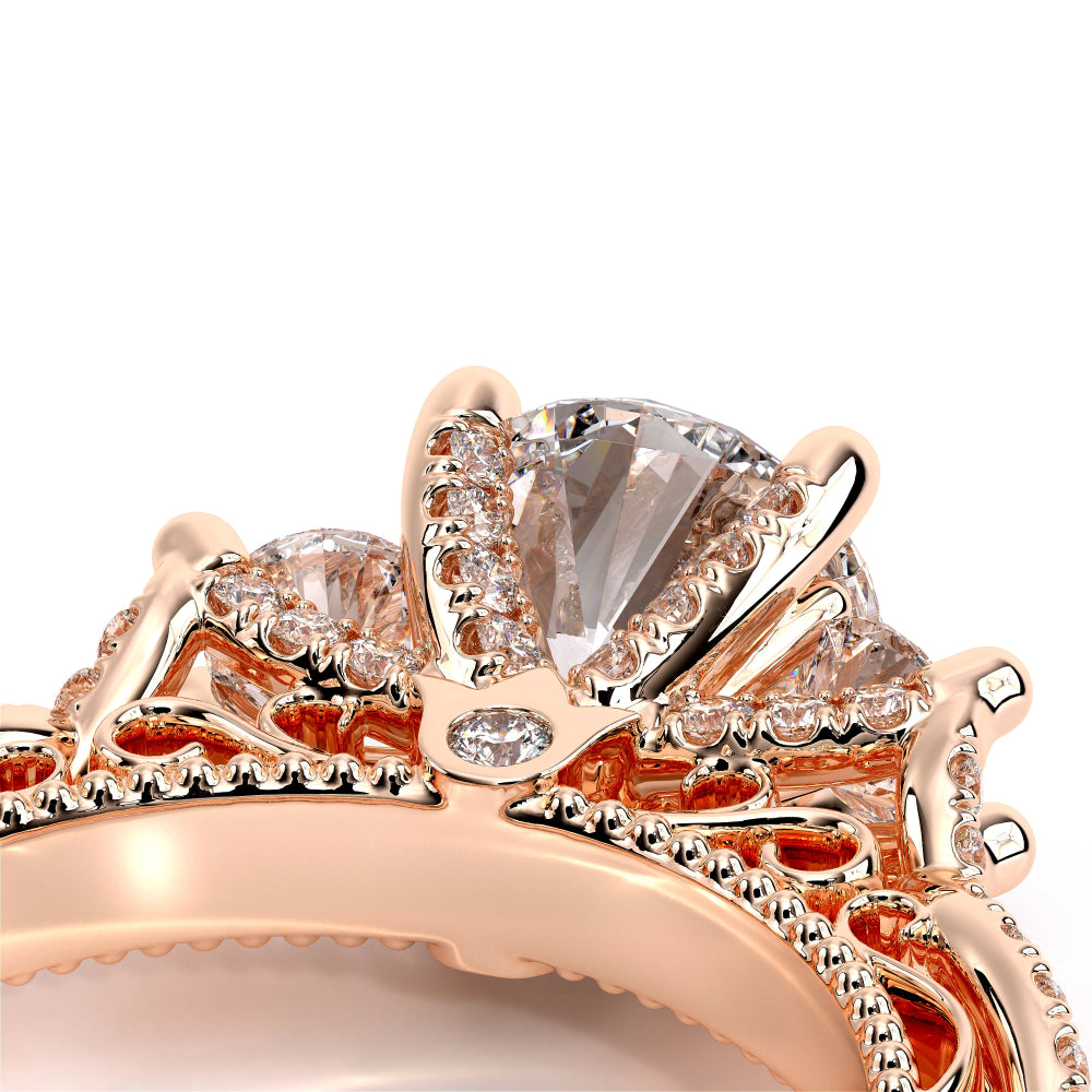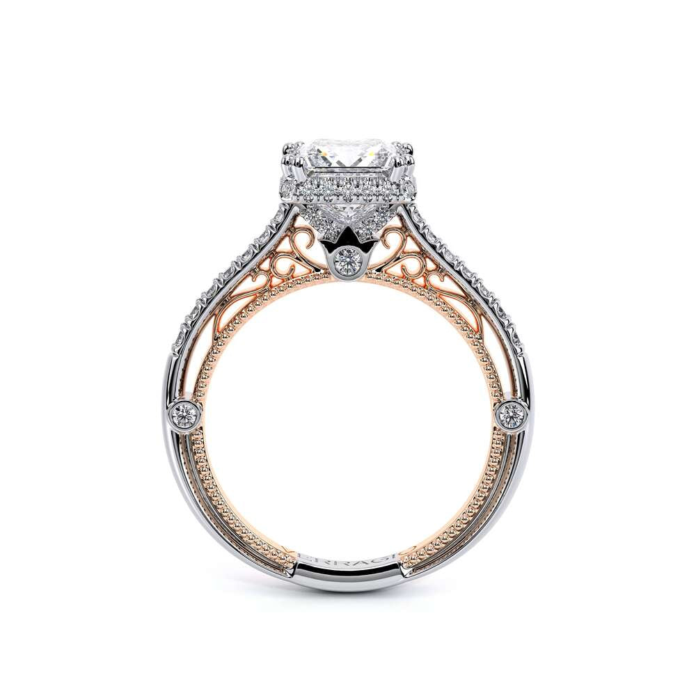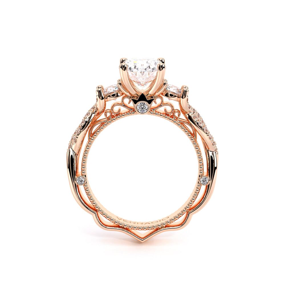 VENETIAN-5061CU engagement ring from the Venetian Collection, features a unique diamond adorned basket in rose gold topped with a cushion shaped single halo made for a round center. A delicate straight shank encrusted with round brilliant diamonds completes this beautiful ornate design.