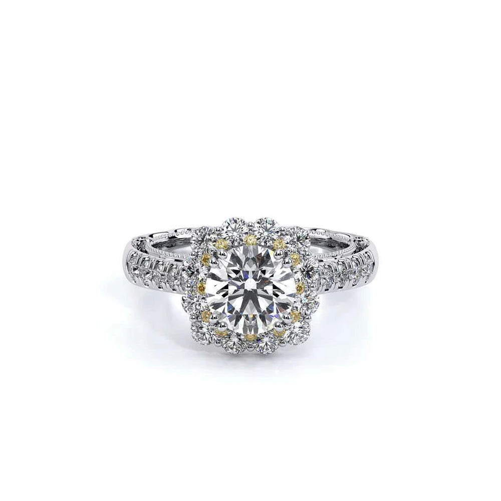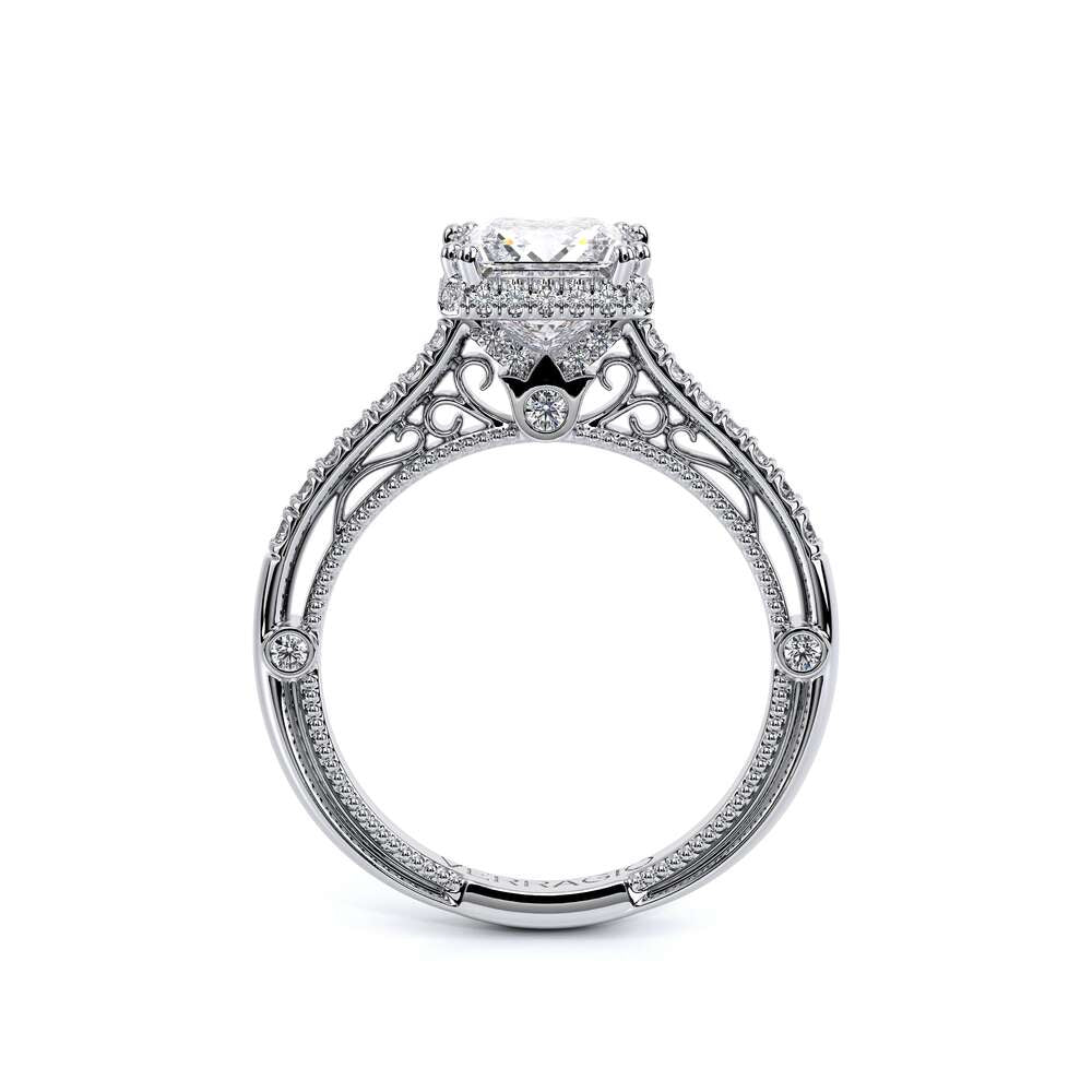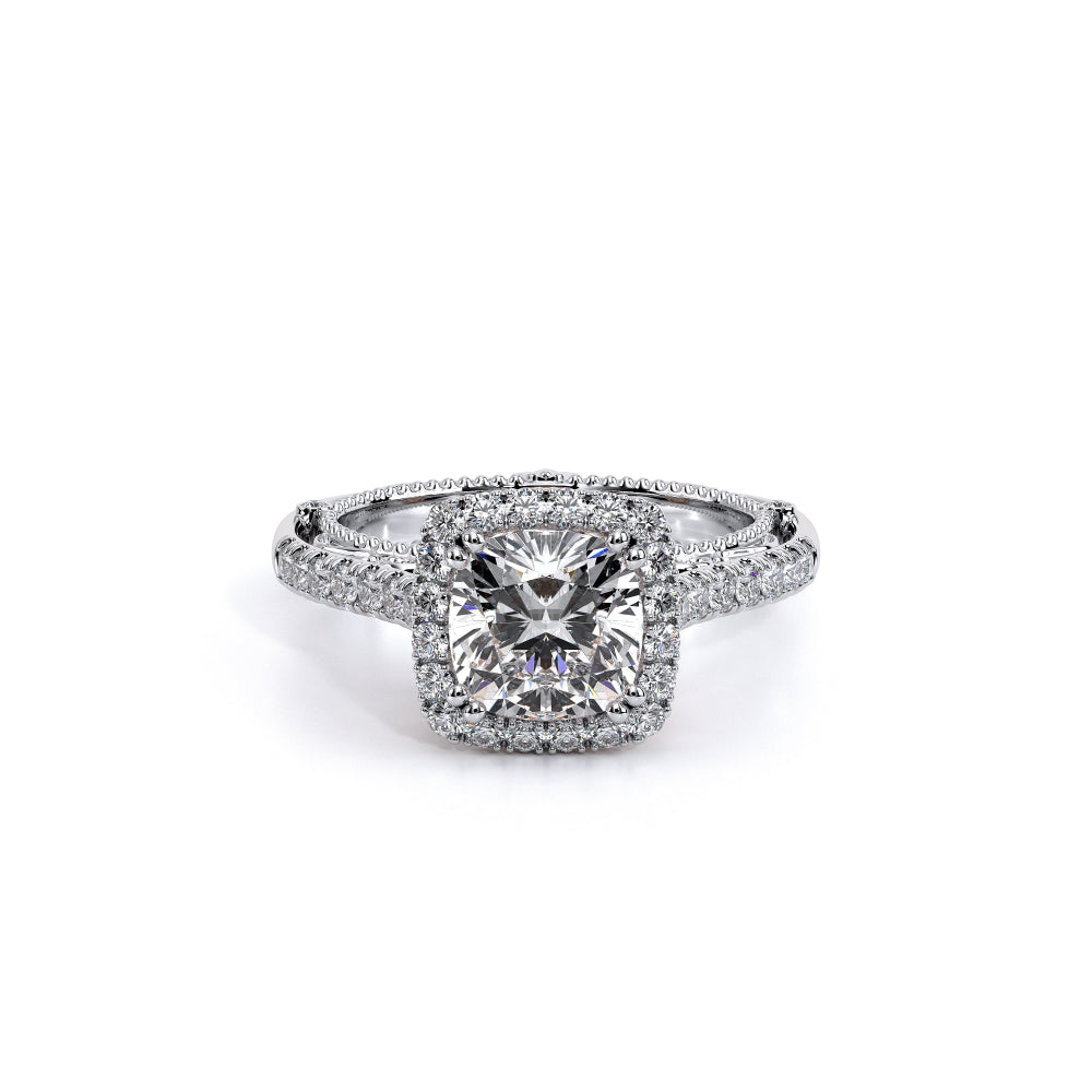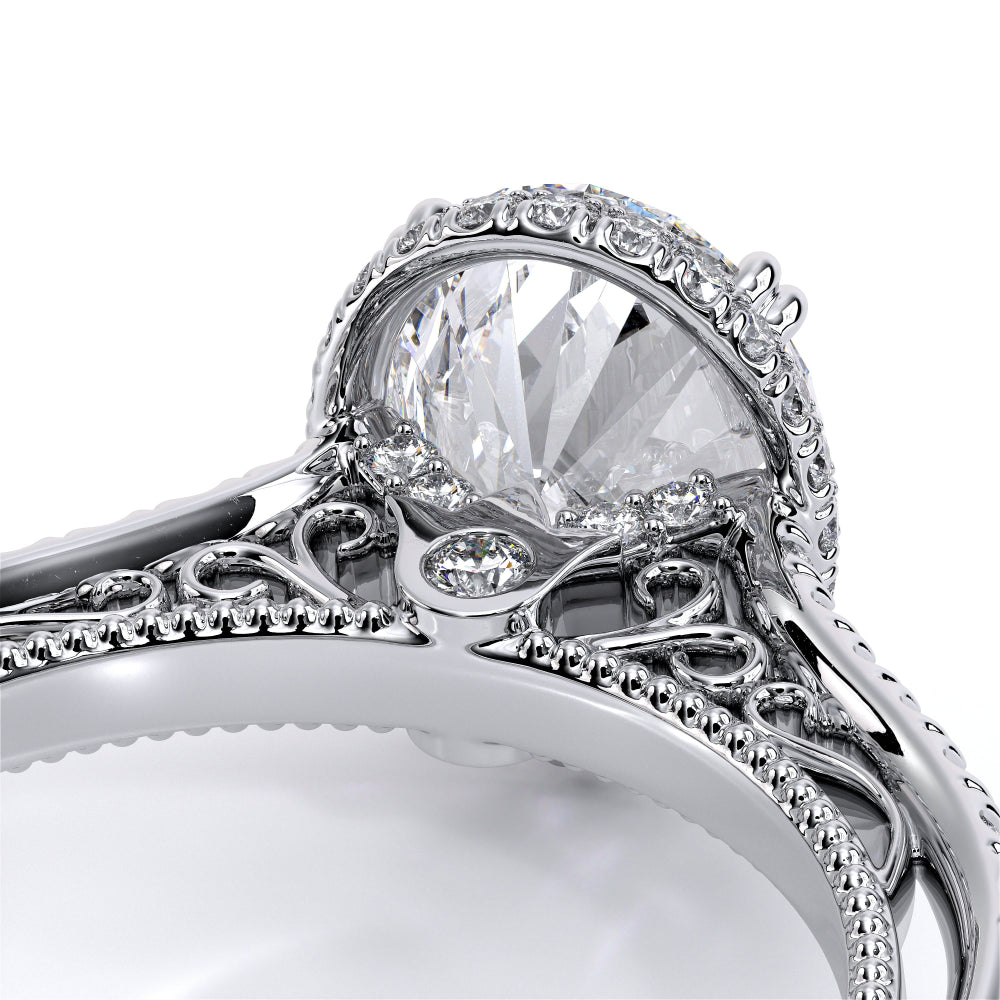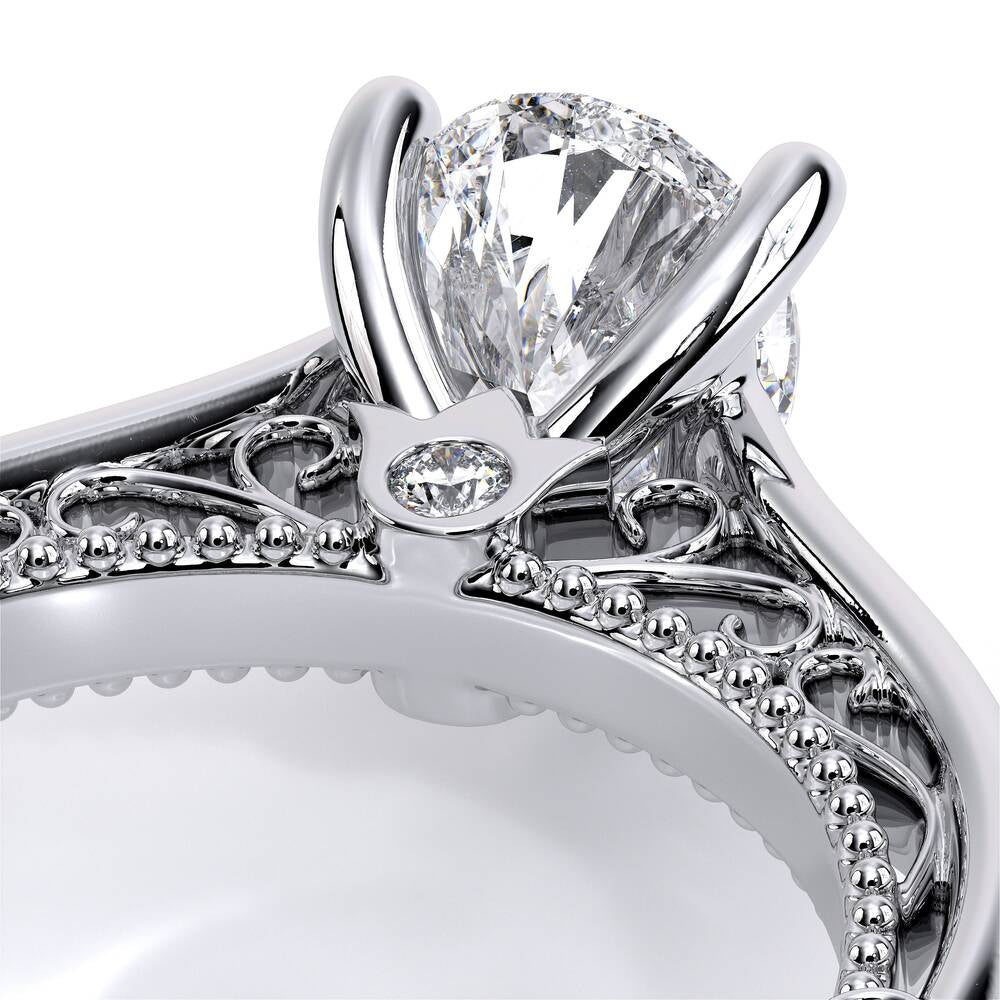 VENETIAN-5003 engagement ring from the Venetian Collection, features round brilliant-cut diamonds pave set in a twisted shank, enhancing the center stone giving an illusion of a floating diamond. Our beautiful Venetian lace and Verragio signature beading completes this vintage piece.