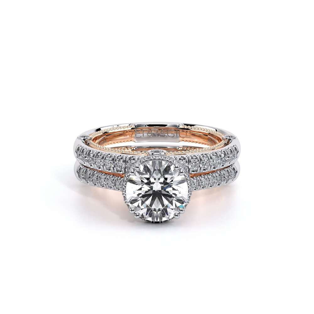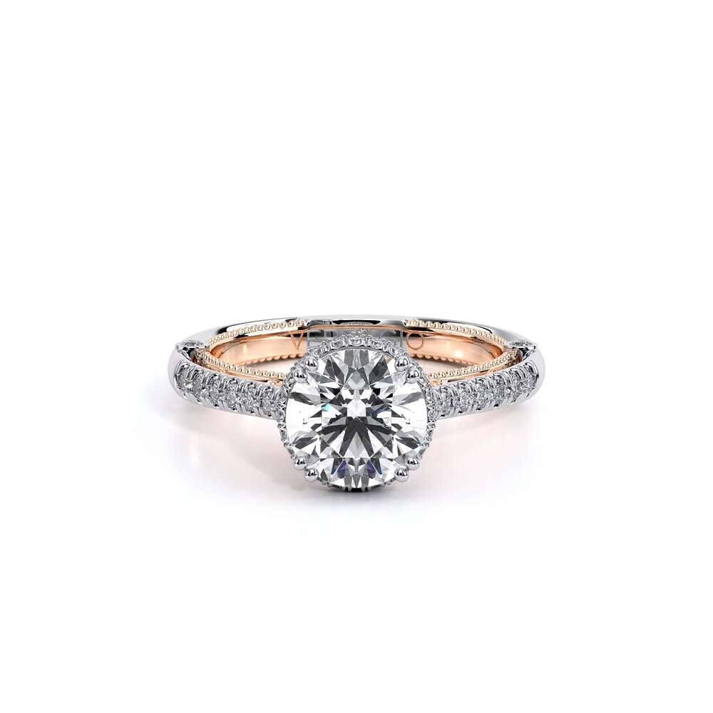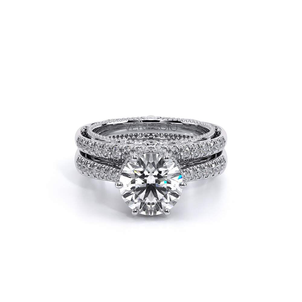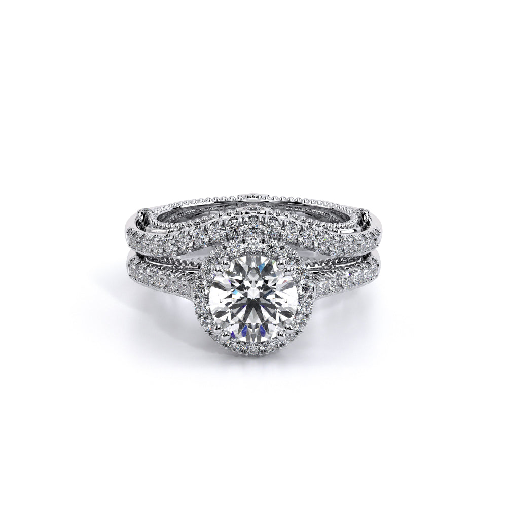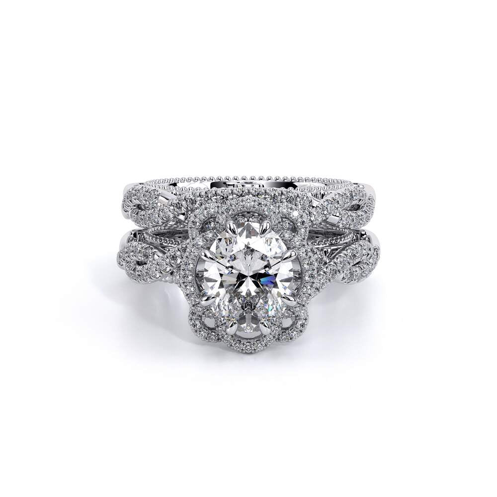 VENETIAN-5003 engagement ring from the Venetian Collection, features round brilliant-cut diamonds pave set in a twisted shank, enhancing the center stone giving an illusion of a floating diamond. Our beautiful Venetian lace and Verragio signature beading completes this vintage piece.