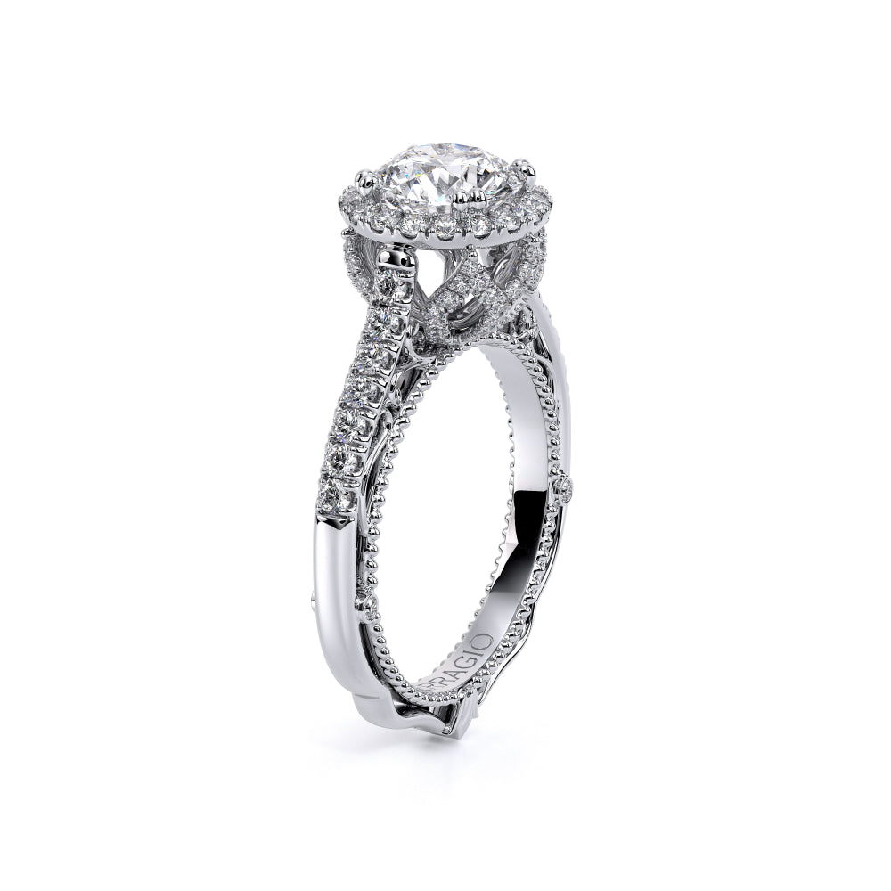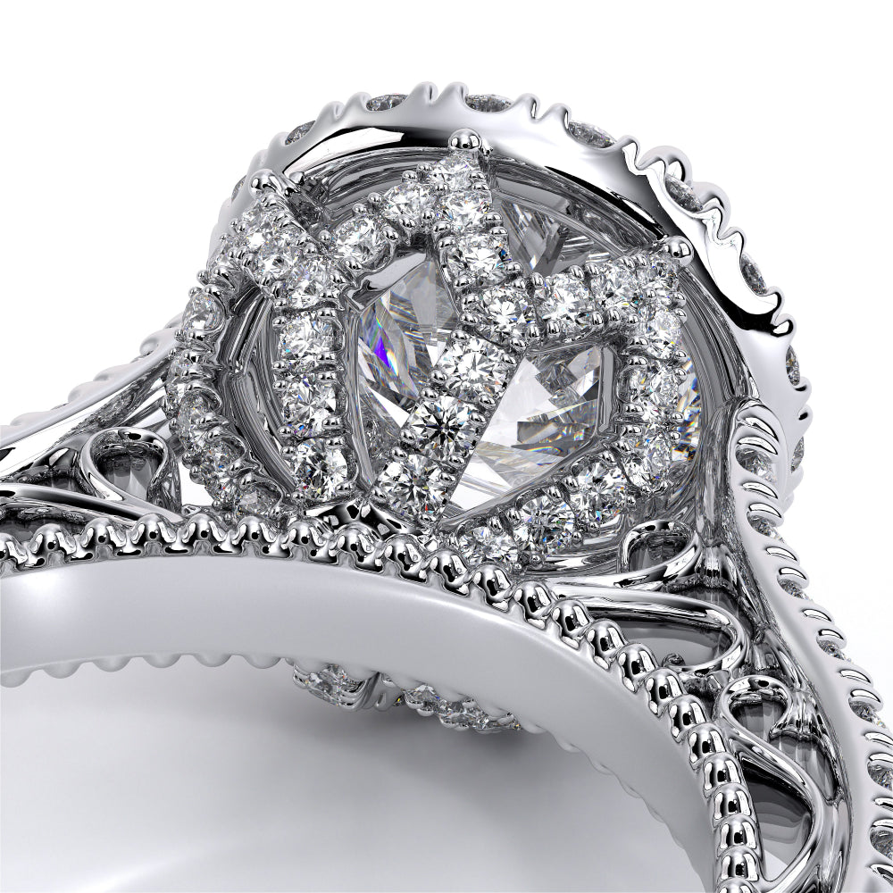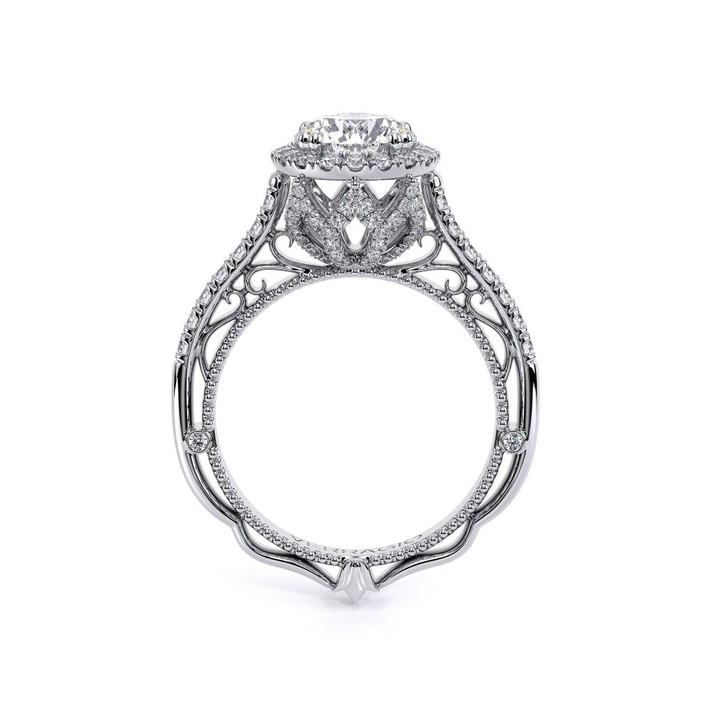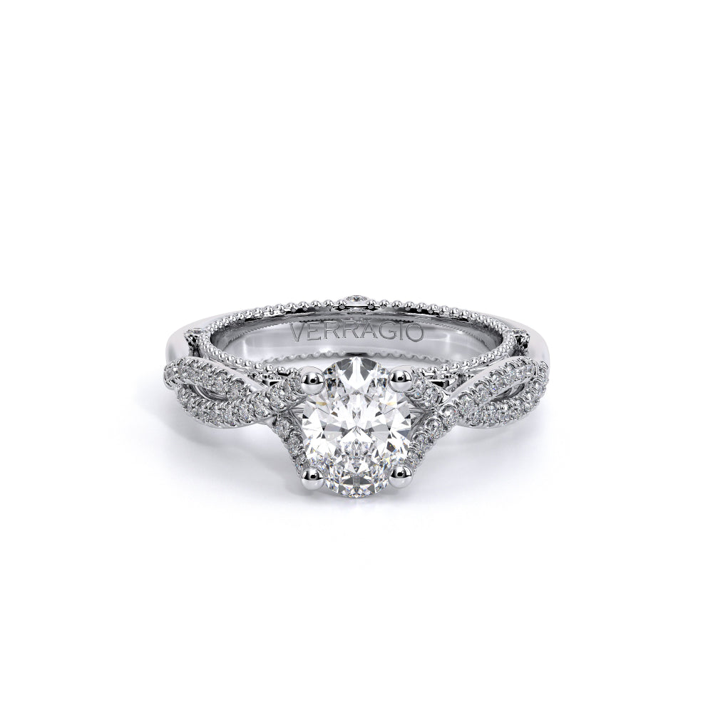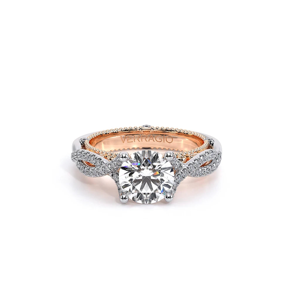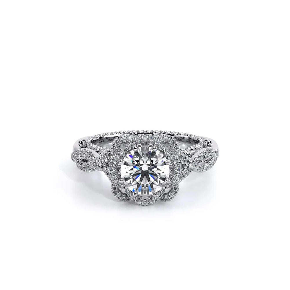 VENETIAN-5003 engagement ring from the Venetian Collection, features round brilliant-cut diamonds pave set in a twisted shank, enhancing any center shape of your choice in a floating design. Our beautiful Venetian lace and Verragio signature beading completes this vintage piece.