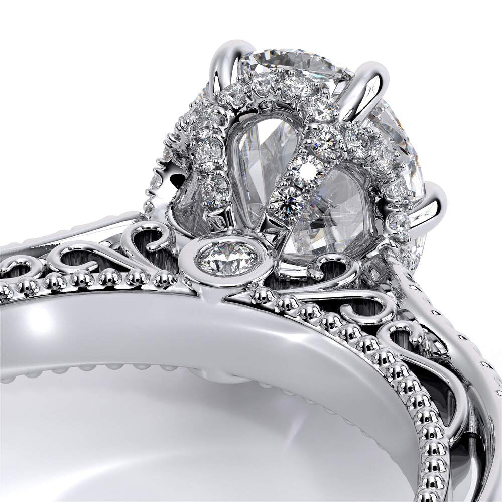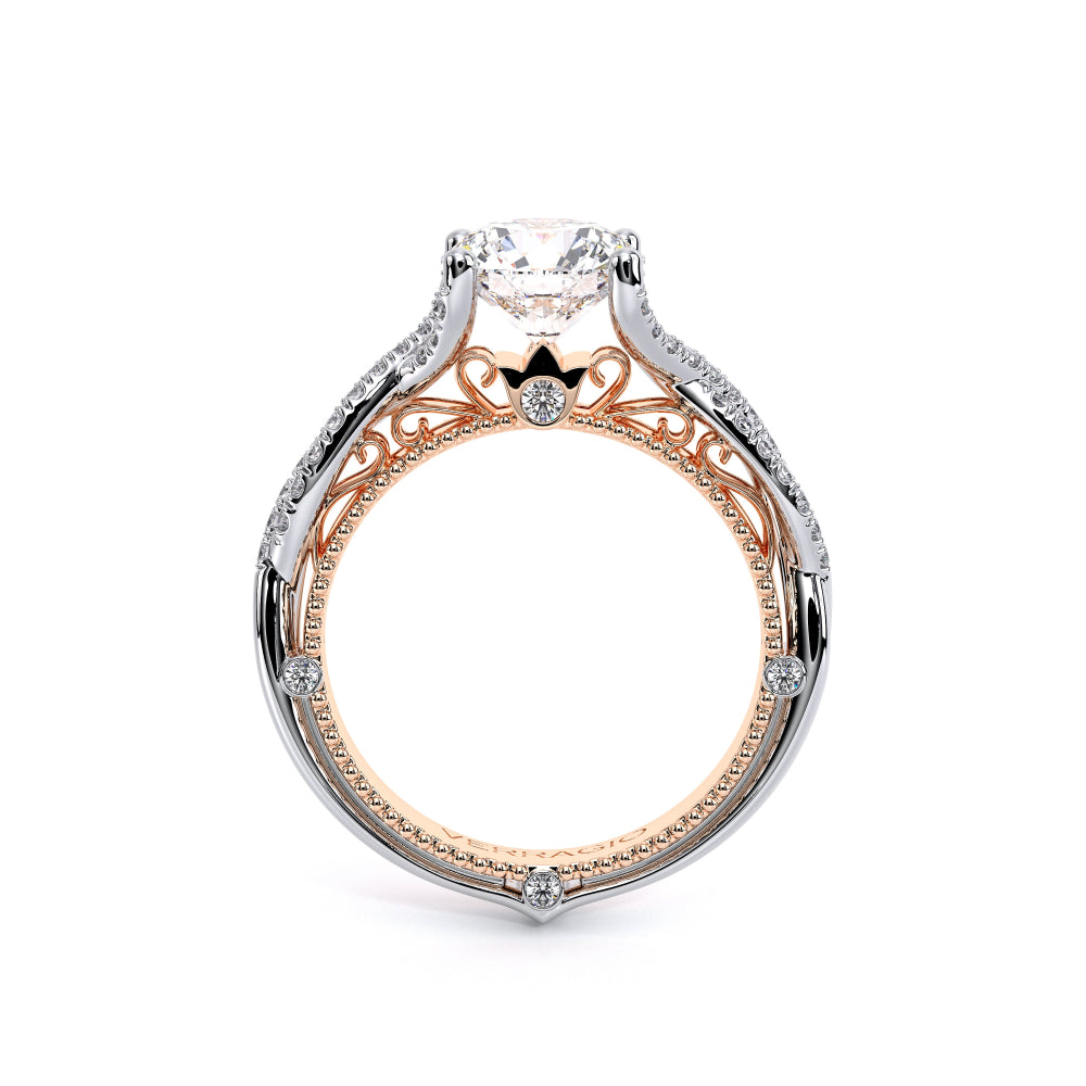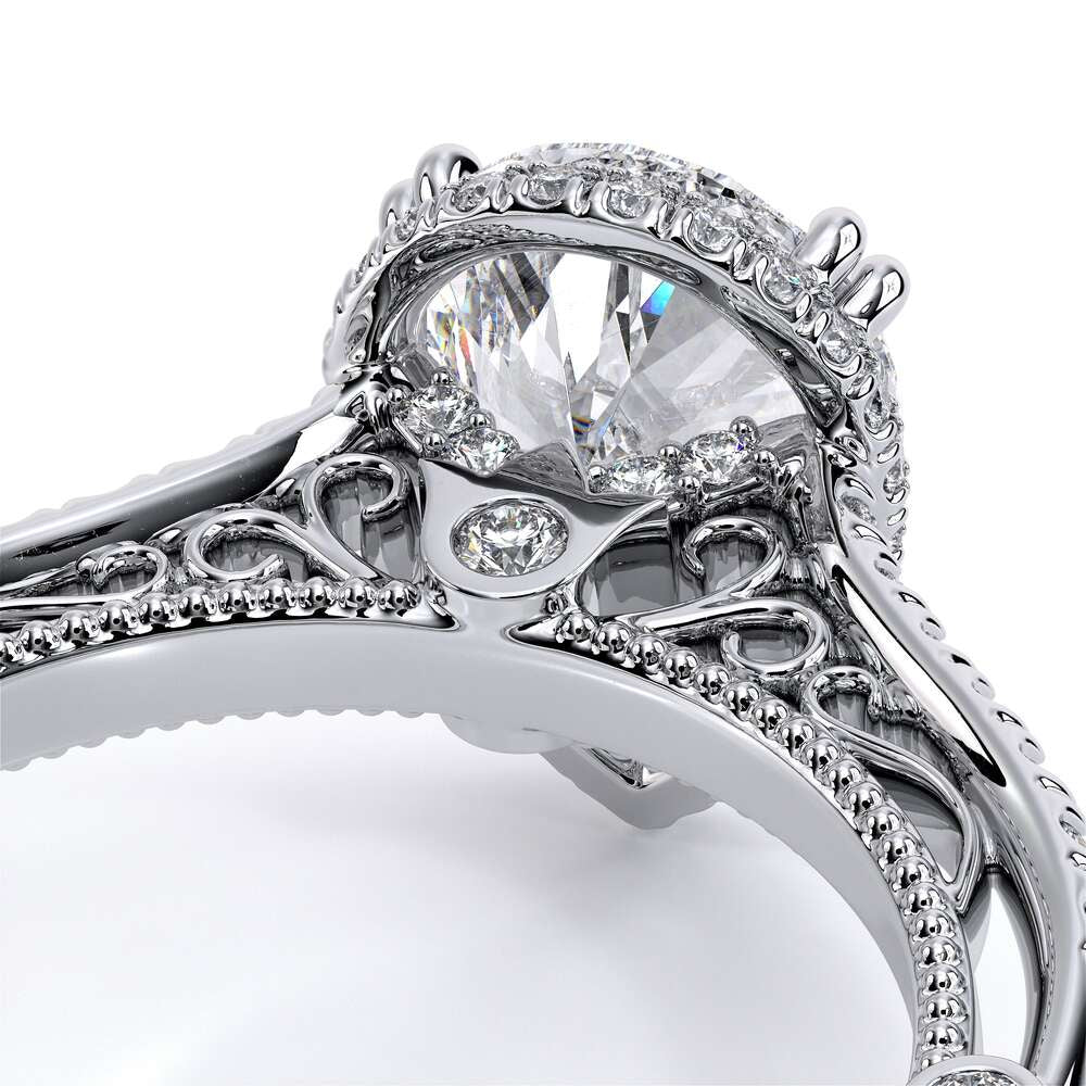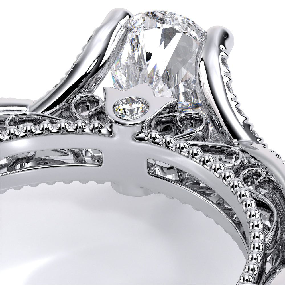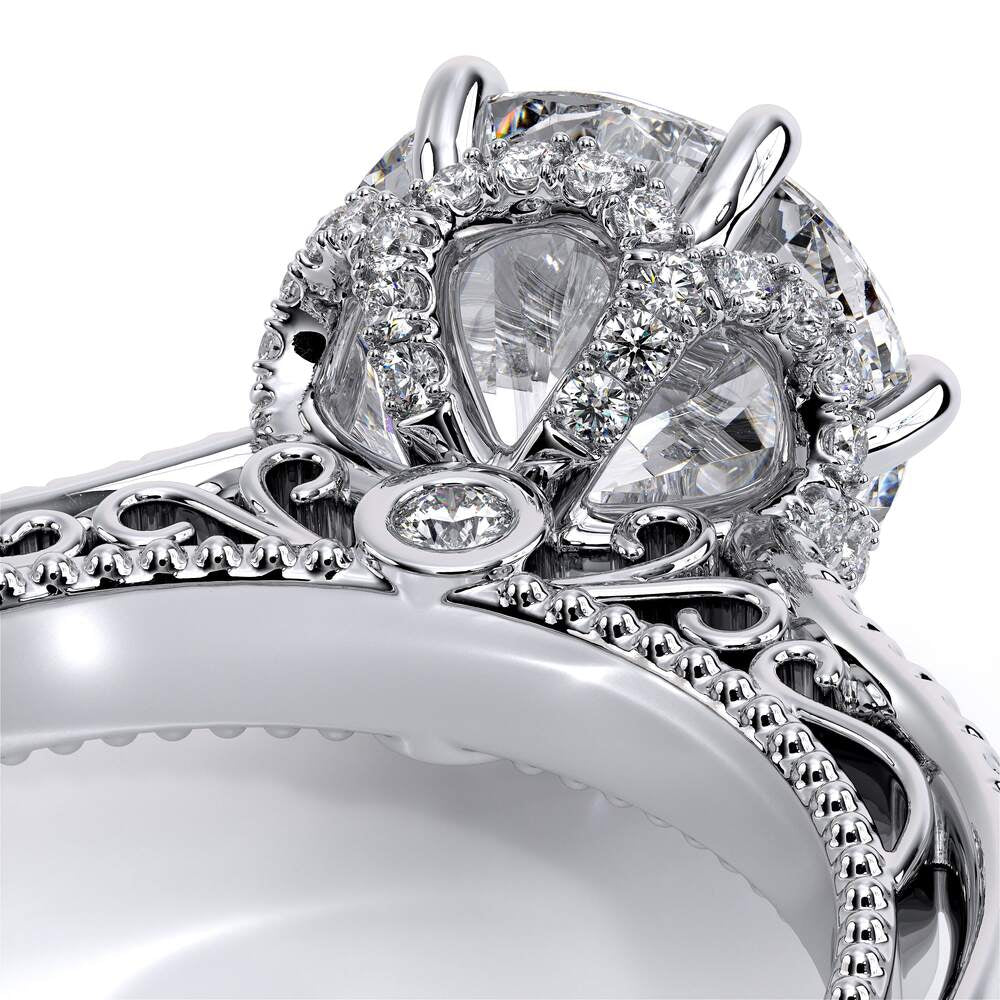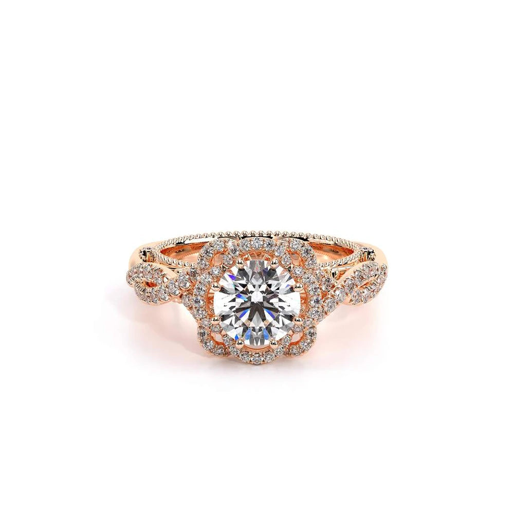 VENETIAN-5003 engagement ring from the Venetian Collection, features round brilliant-cut diamonds pave set in a twisted shank, enhancing any center shape of your choice in a floating design. Our beautiful Venetian lace and Verragio signature beading completes this vintage piece.