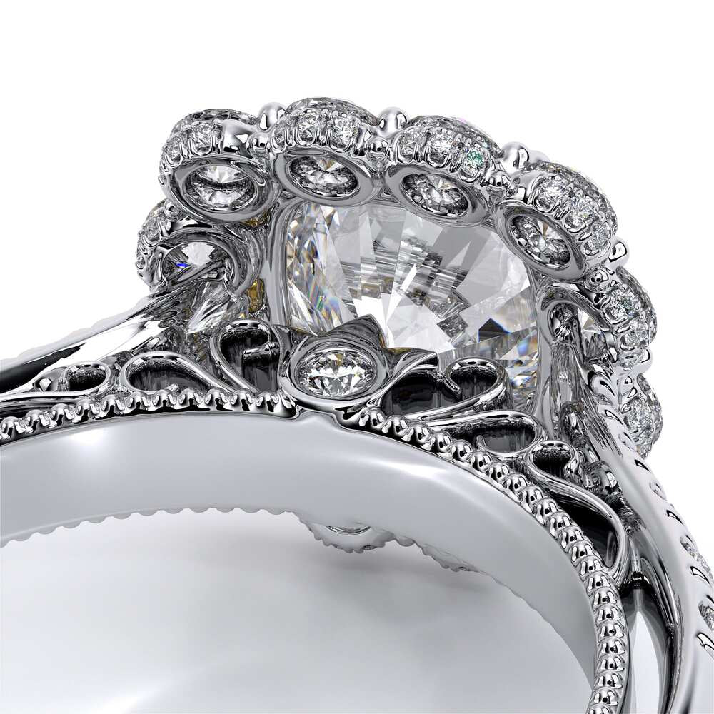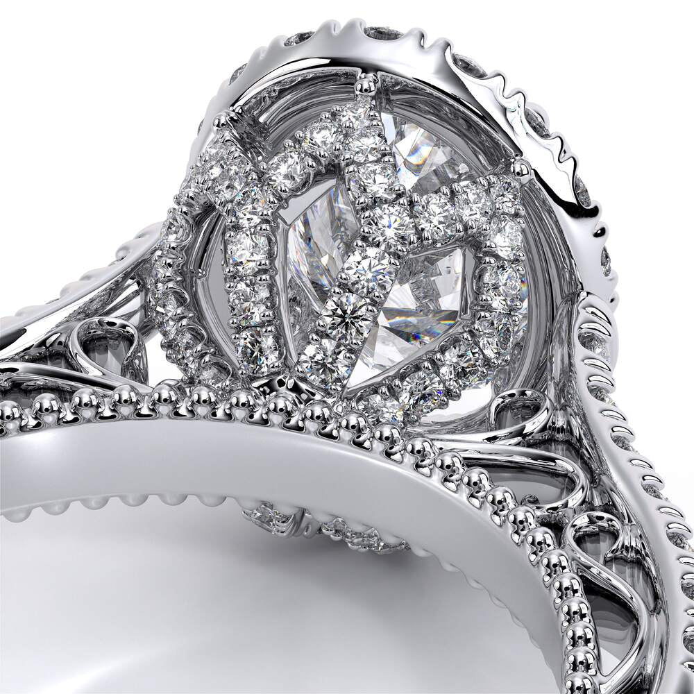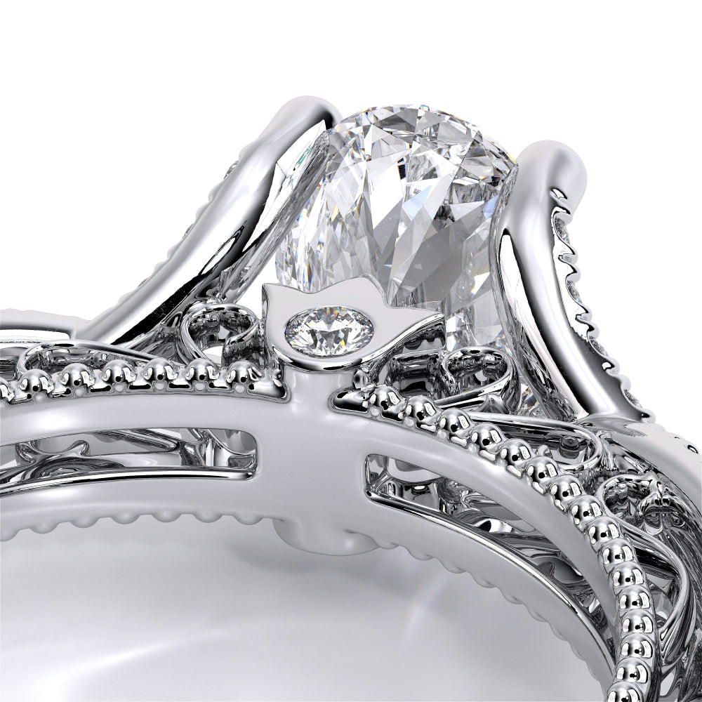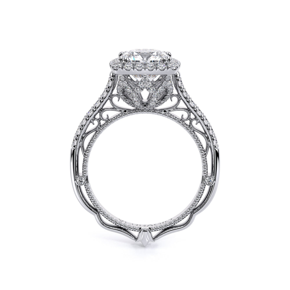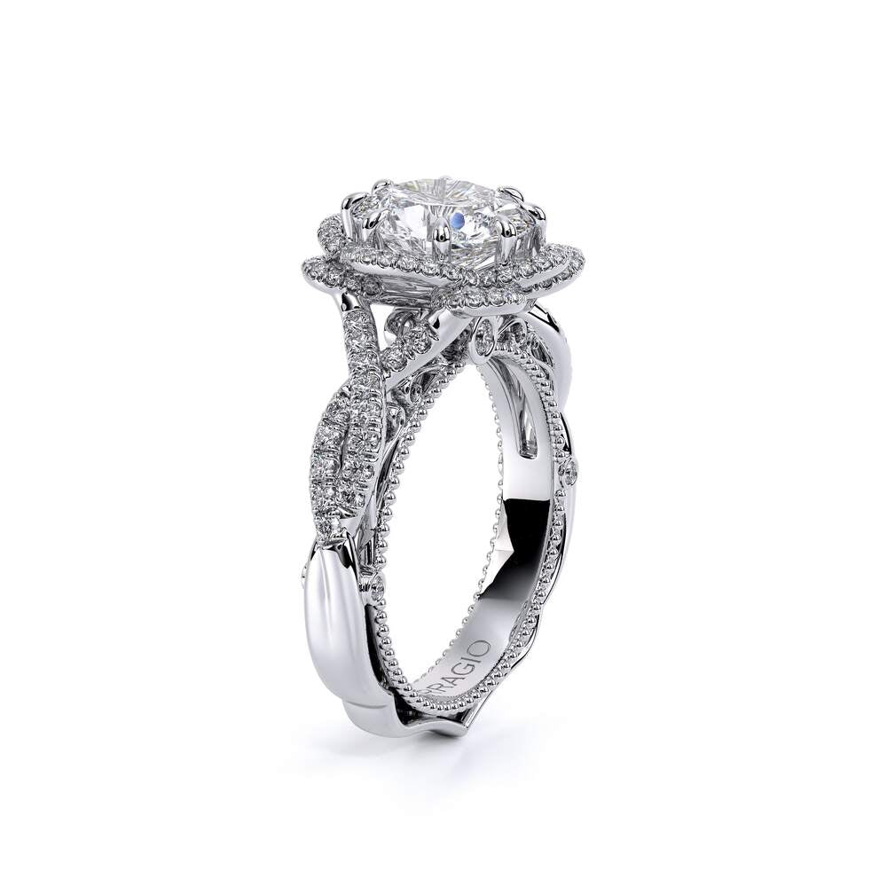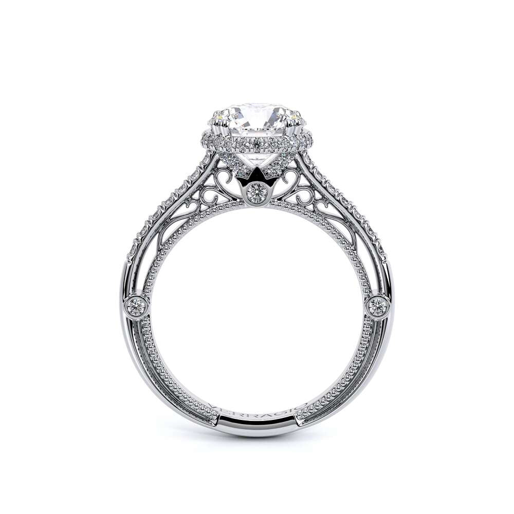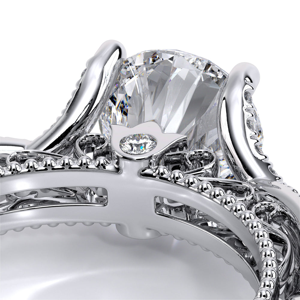 VENETIAN-5003 engagement ring from the Venetian Collection, features round brilliant-cut diamonds pave set in a twisted shank, enhancing any center shape of your choice in a floating design. Our beautiful Venetian lace and Verragio signature beading completes this vintage piece.