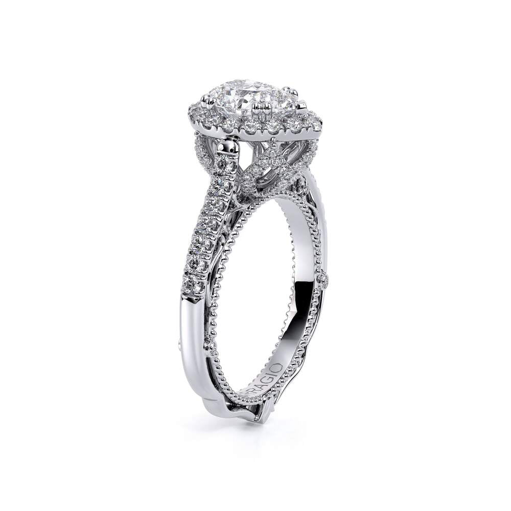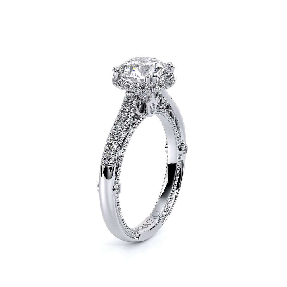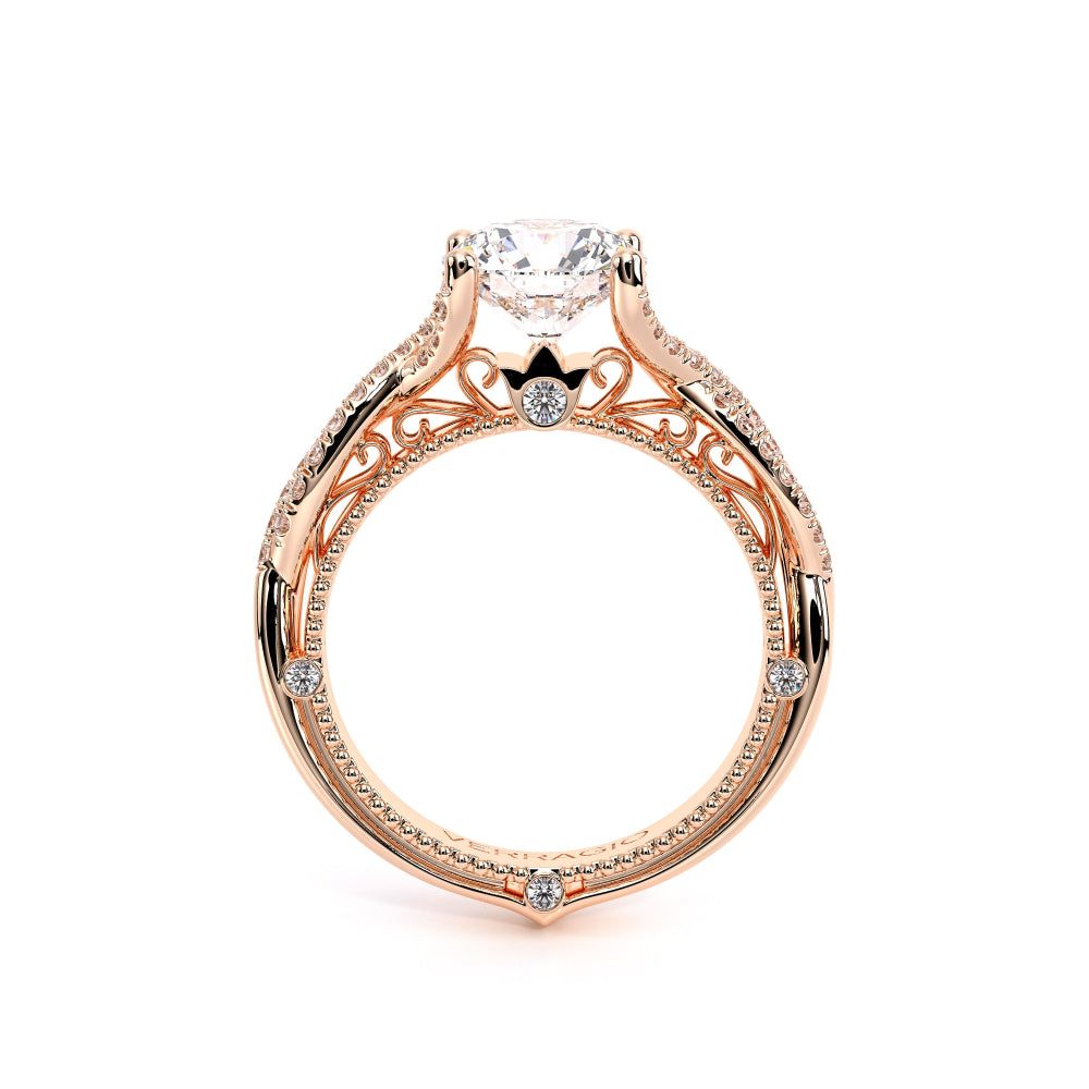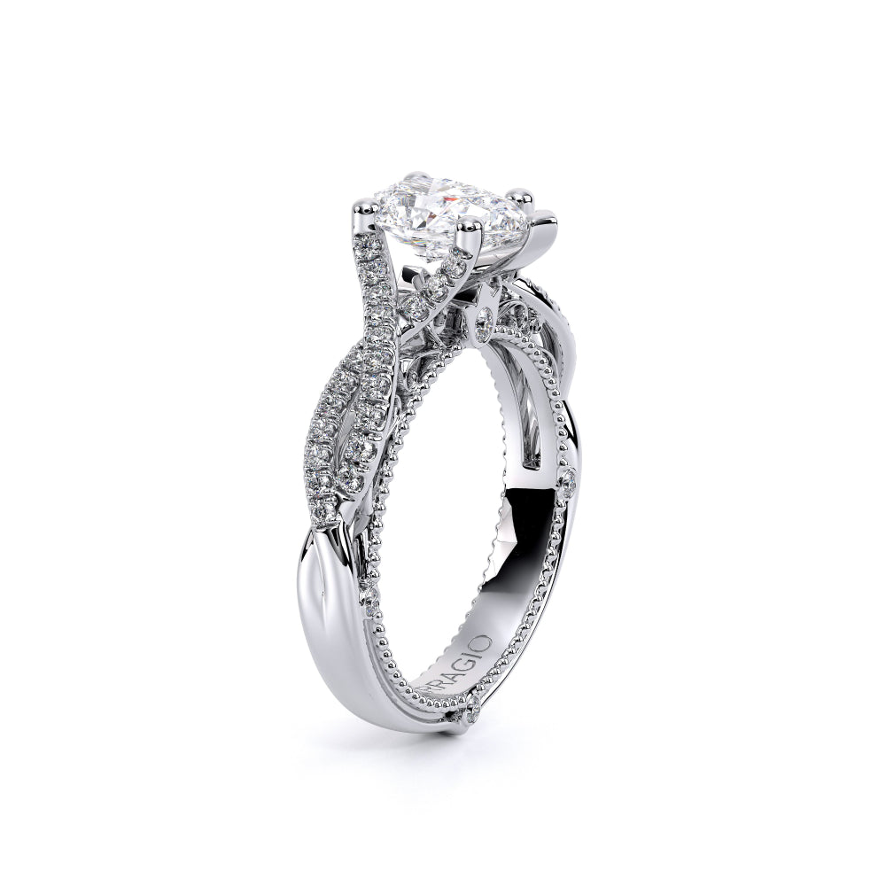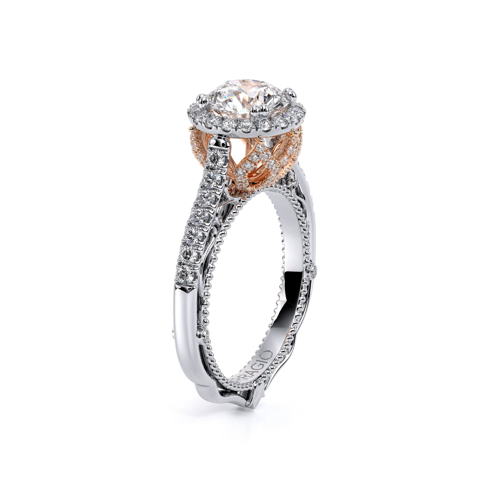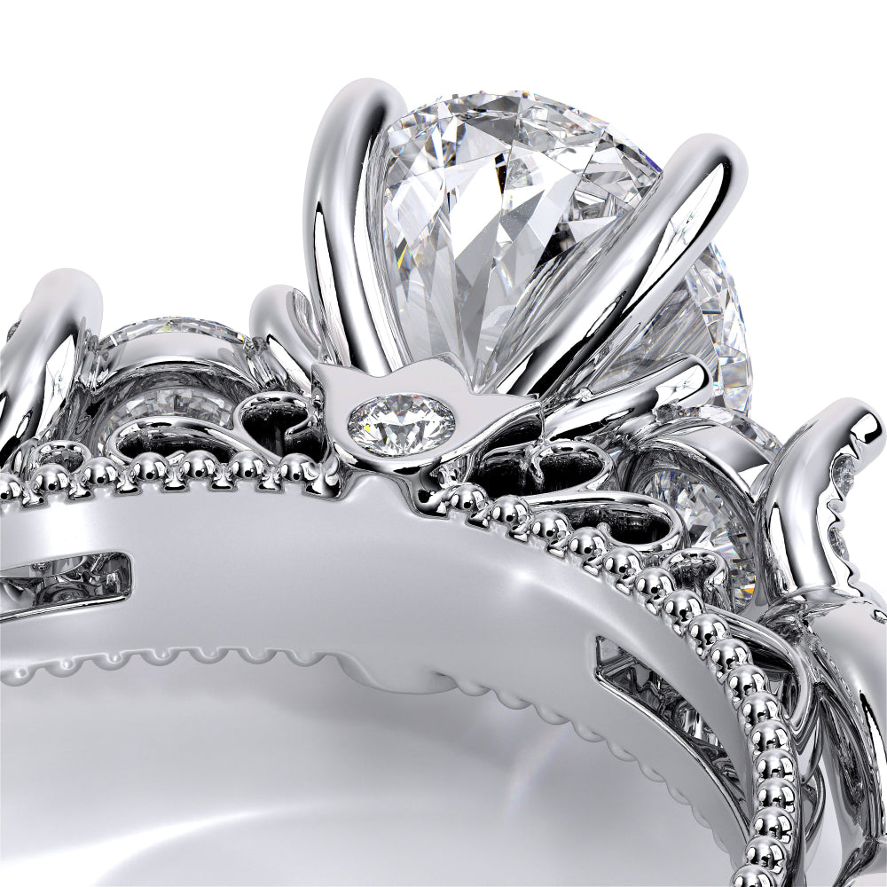 VENETIAN-5003 engagement ring from the Venetian Collection, features round brilliant-cut diamonds pave set in a twisted shank, enhancing any center shape of your choice in a floating design. Our beautiful Venetian lace and Verragio signature beading completes this vintage piece.