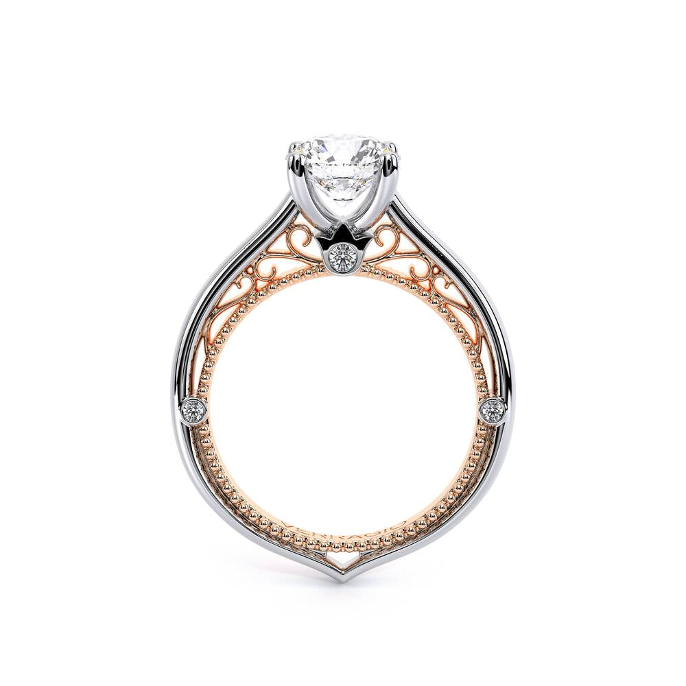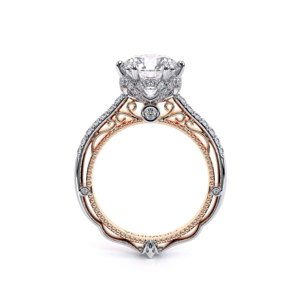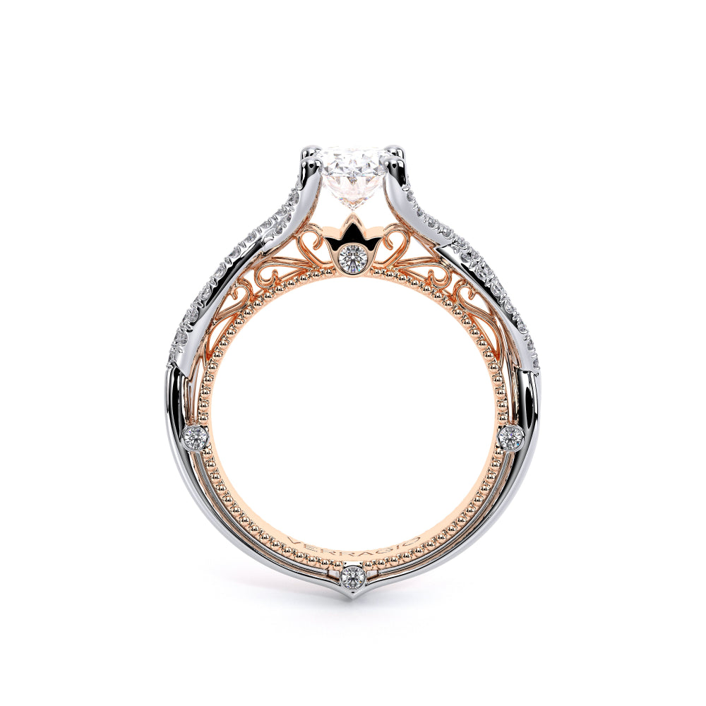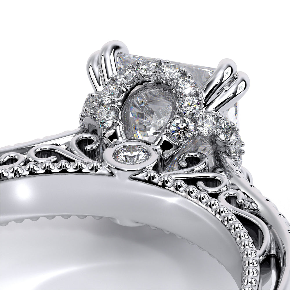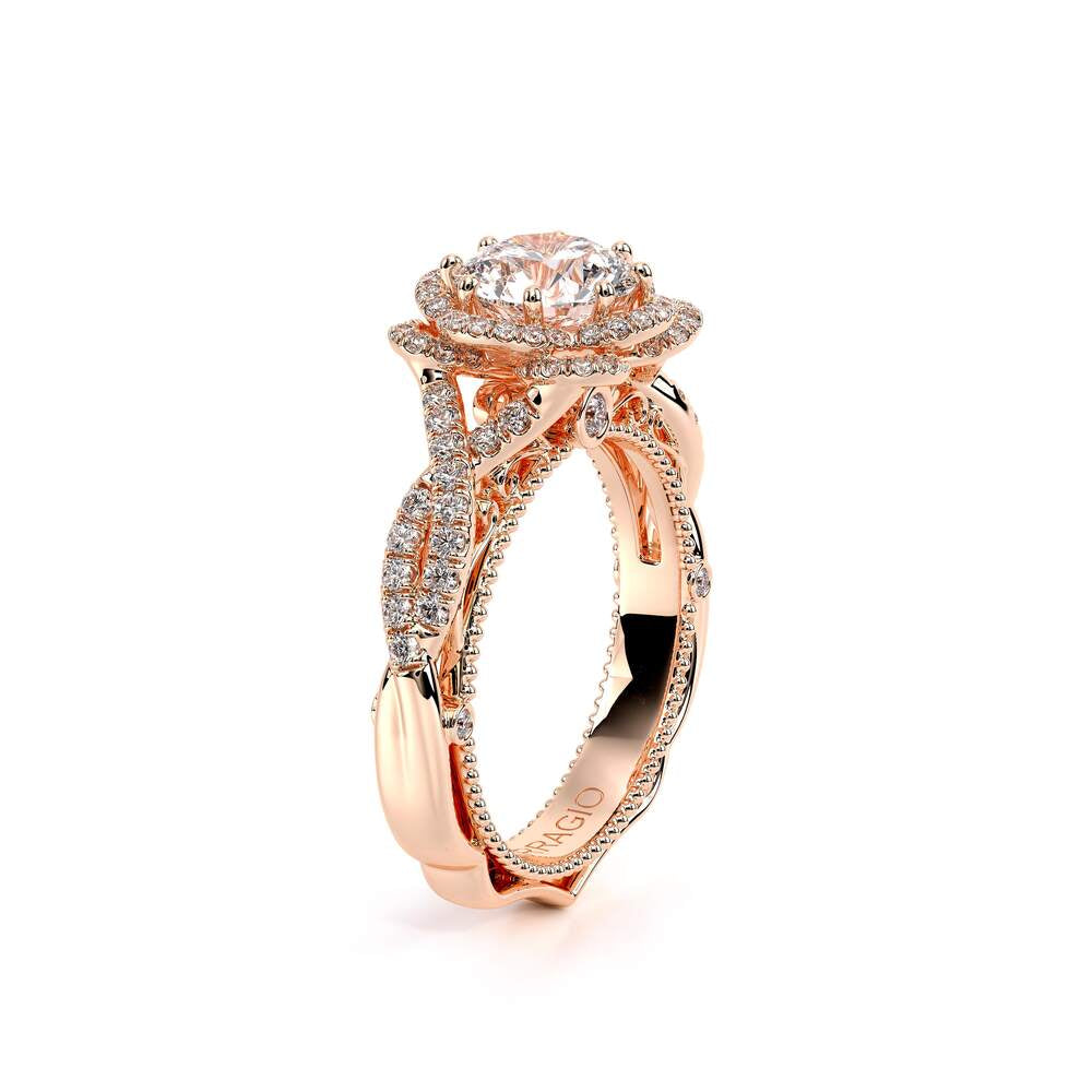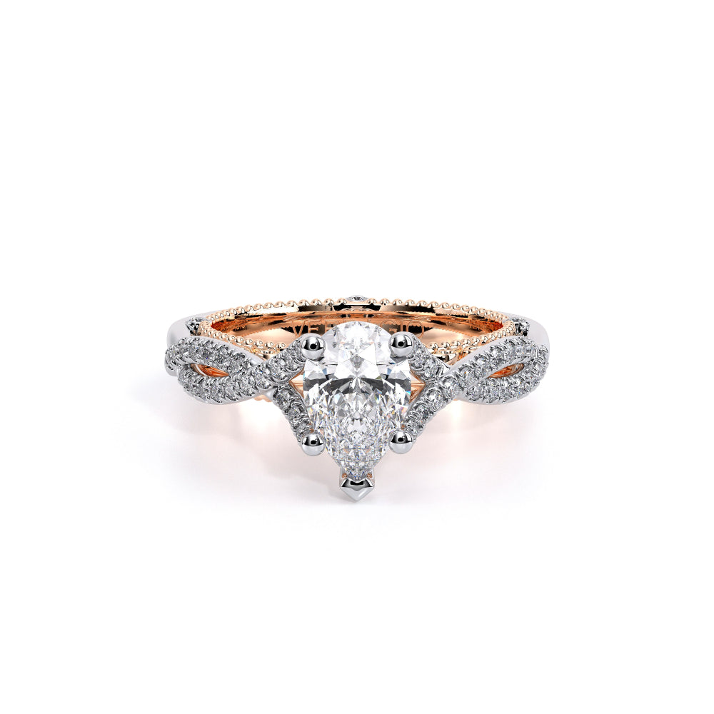 VENETIAN-5003 engagement ring from the Venetian Collection, features round brilliant-cut diamonds pave set in a twisted shank, enhancing any center shape of your choice in a floating design. Our beautiful Venetian lace and Verragio signature beading completes this vintage piece.