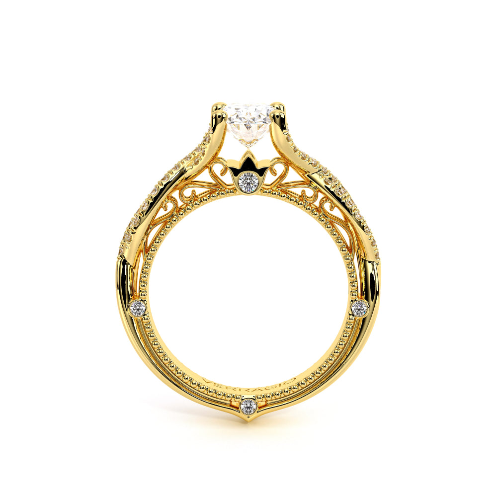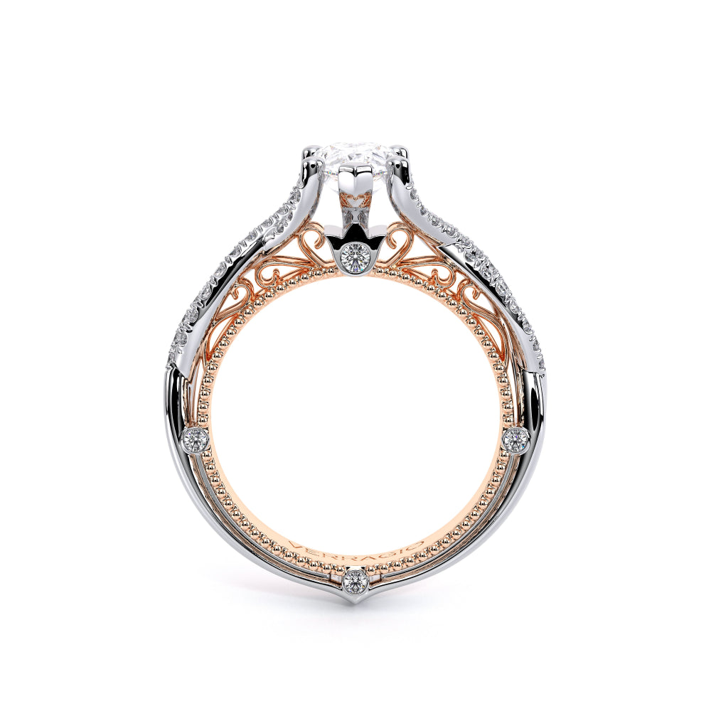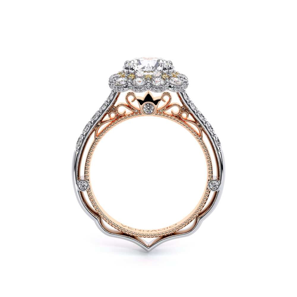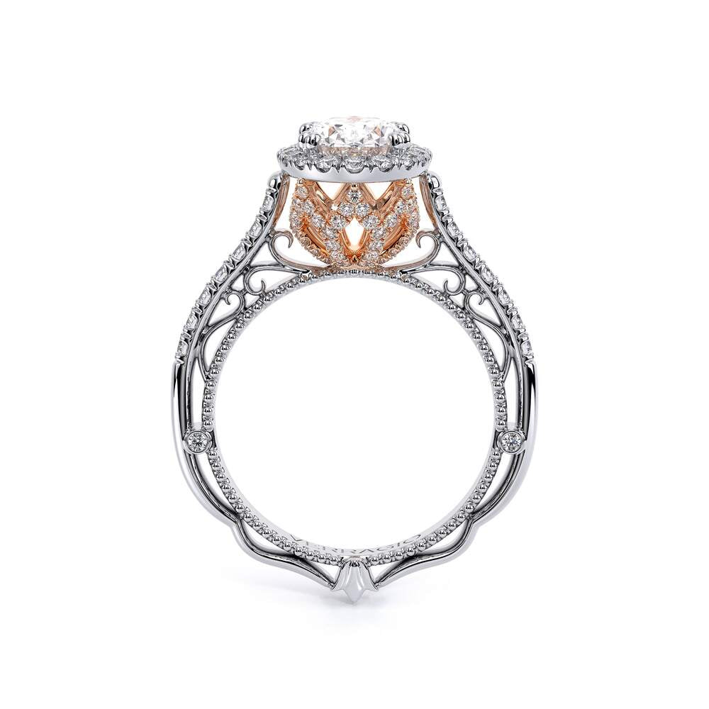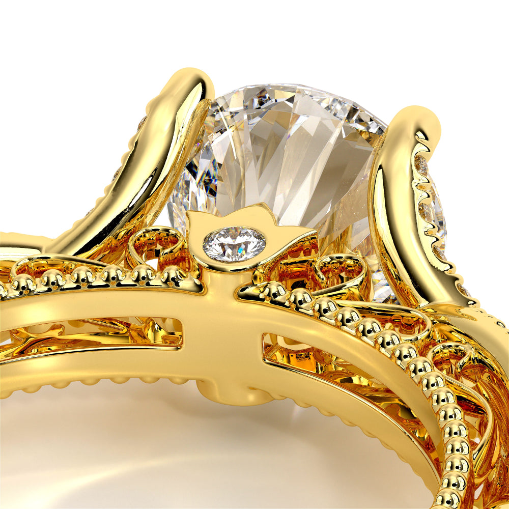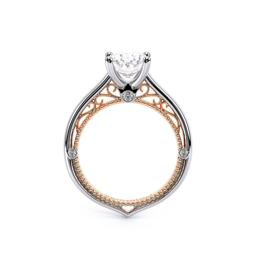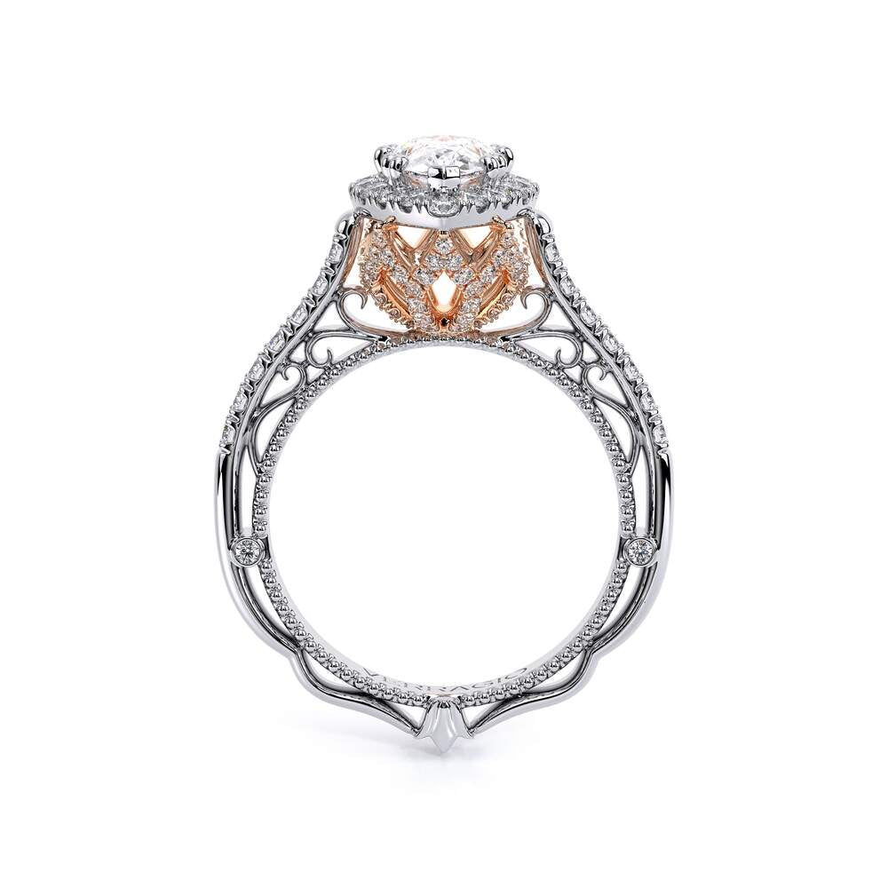 VENETIAN-5003 engagement ring from the Venetian Collection, features round brilliant-cut diamonds pave set in a twisted shank, enhancing any center shape of your choice in a floating design. Our beautiful Venetian lace and Verragio signature beading completes this vintage piece.