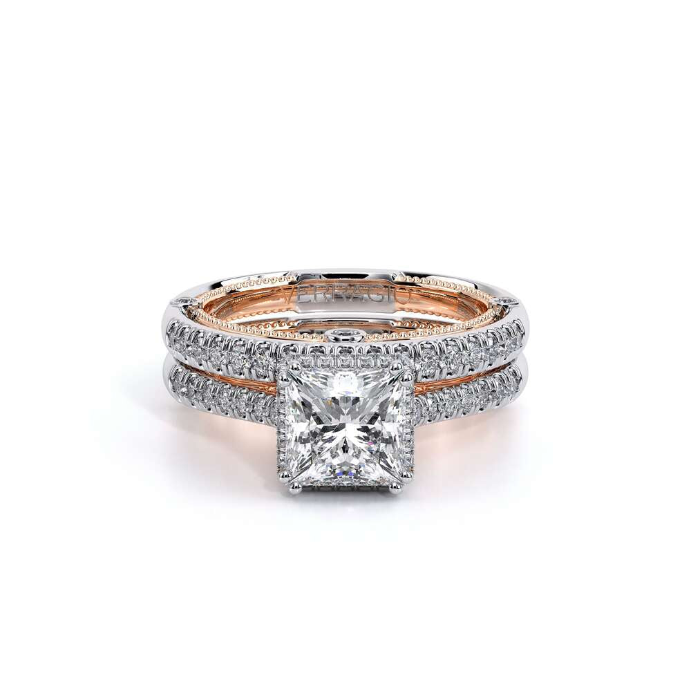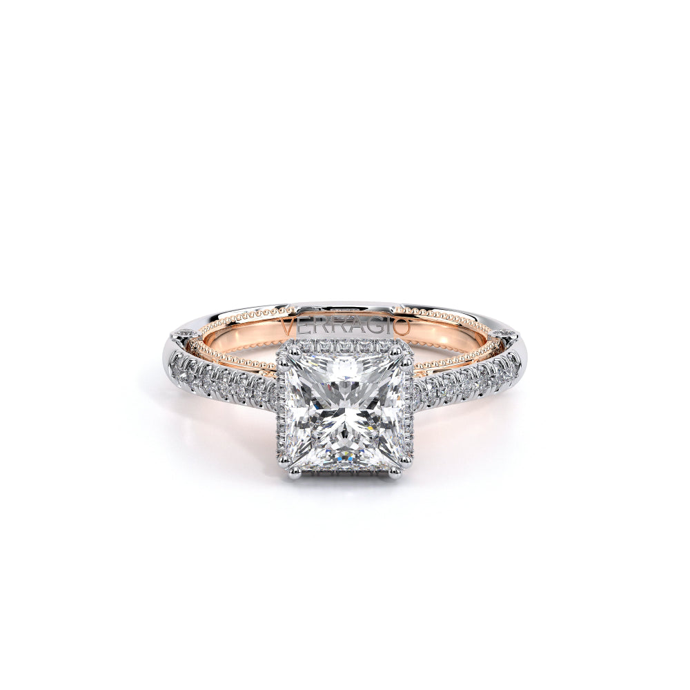 VENETIAN-5061P engagement ring from the Venetian Collection, features a unique diamond adorned basket topped with a square shaped single halo made for a princess center. A delicate straight shank encrusted with round brilliant diamonds completes this beautiful ornate design.