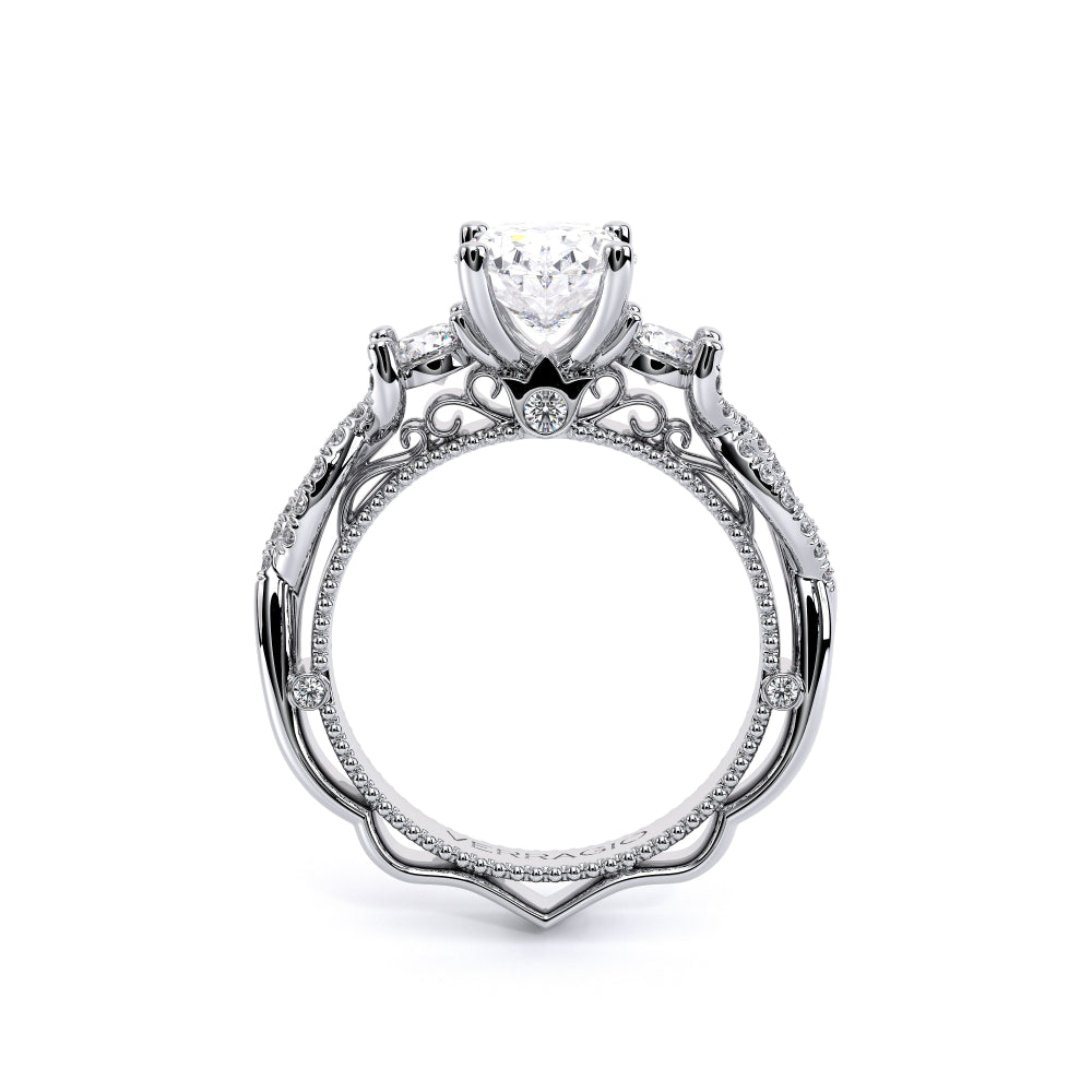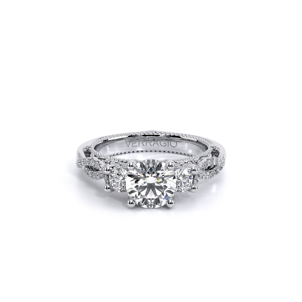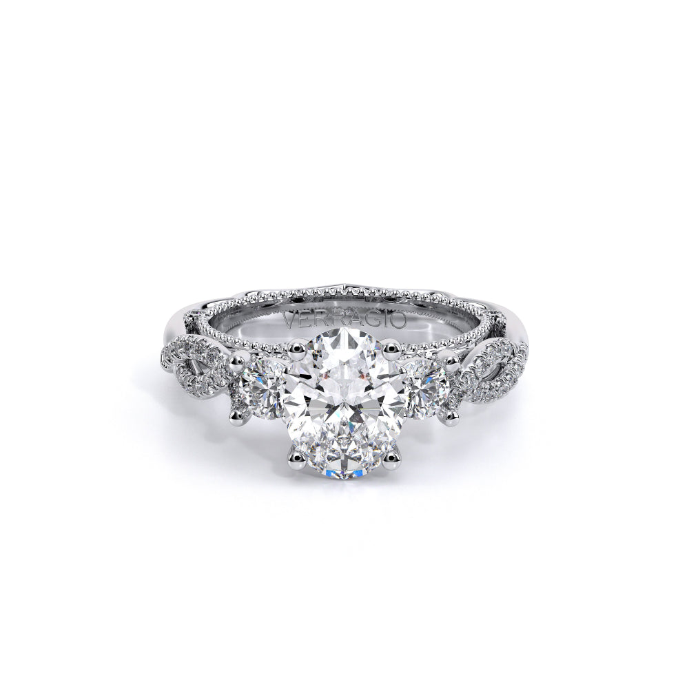 VENETIAN-5013OV features a three stone diamond engagament ring with two round side diamonds seemlesly integrated on a twisted diamond shank. The inner profile showcases beautifully handcrafted lace and our Verragio signature beading. Personalize this beauty with a center stone shape of your choice.