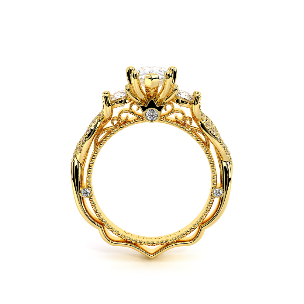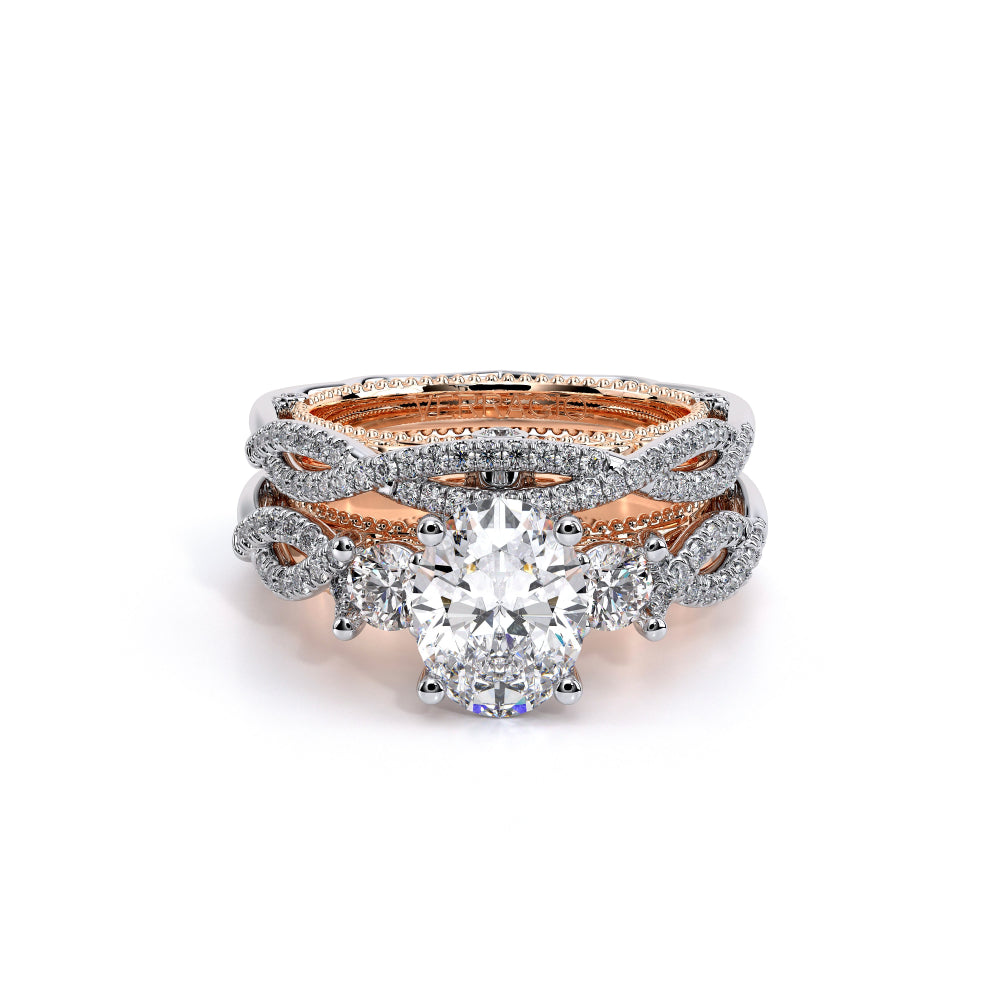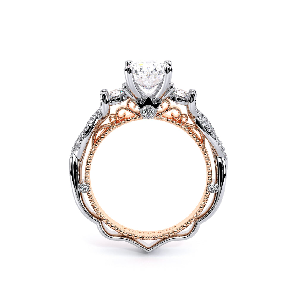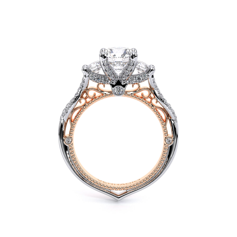 VENETIAN-5013OV features a three stone diamond engagament ring with two round side diamonds seemlesly integrated on a twisted diamond shank. The inner profile showcases beautifully handcrafted lace and our Verragio signature beading. Personalize this beauty with a center stone shape of your choice.
