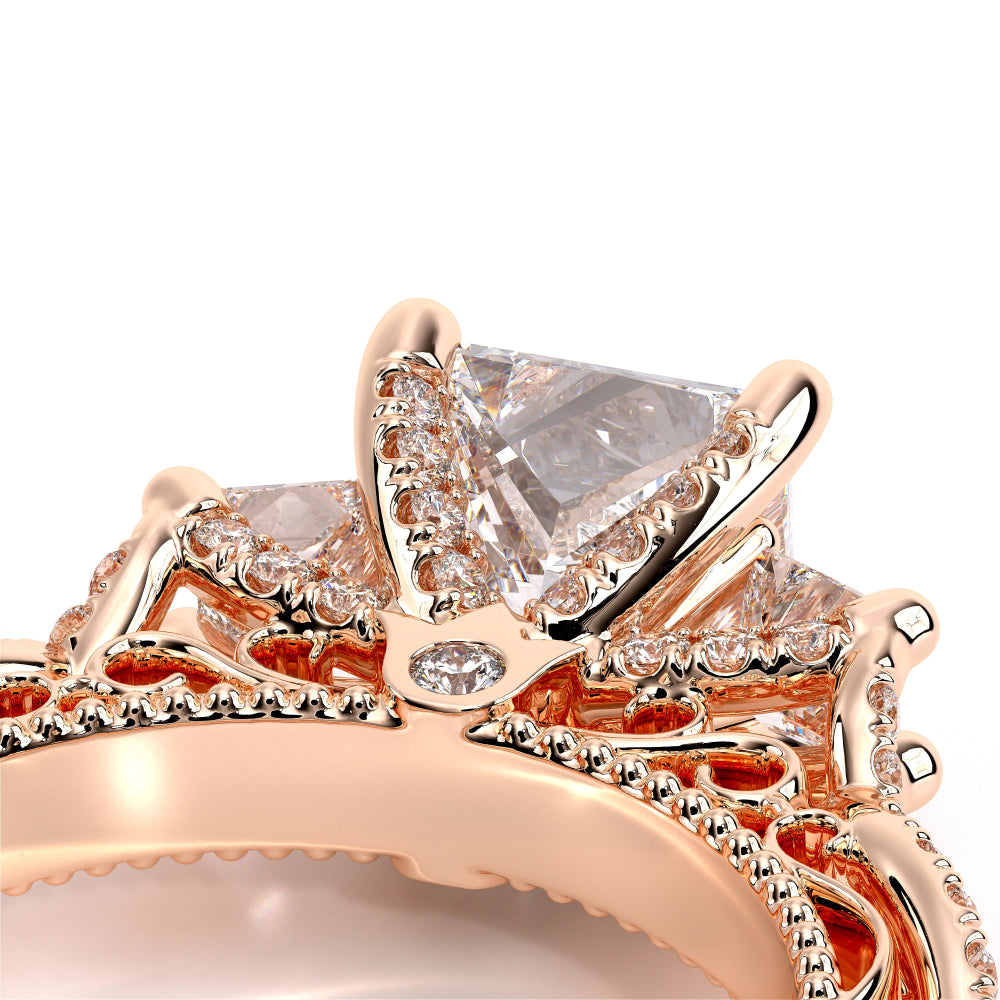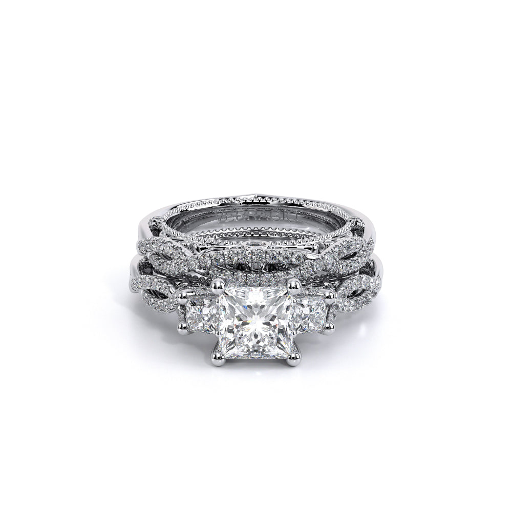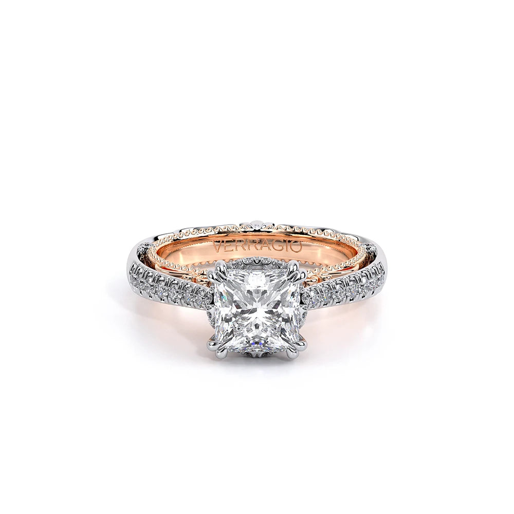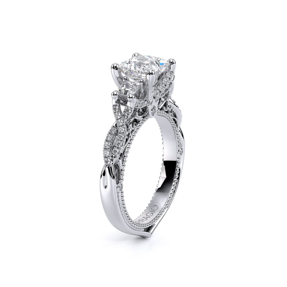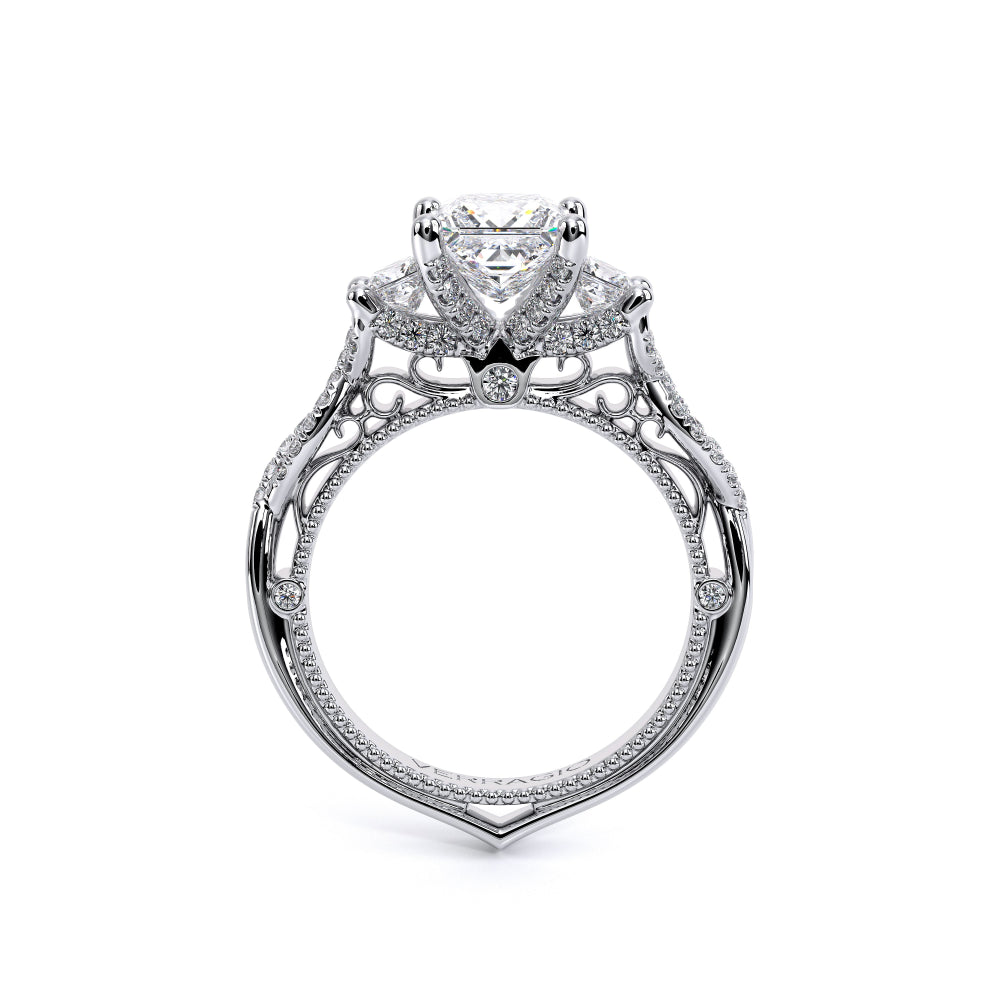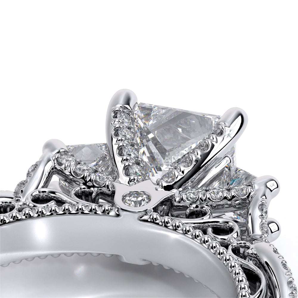 VENETIAN-5079P engagement ring from the Venetian Collection, features a vintage style three stone princess diamond prong setting, each encrusted with round brilliant diamonds. Our Verragio signature beading and lace detail beautifully binds together all elements and creates this visually stunning piece of art.