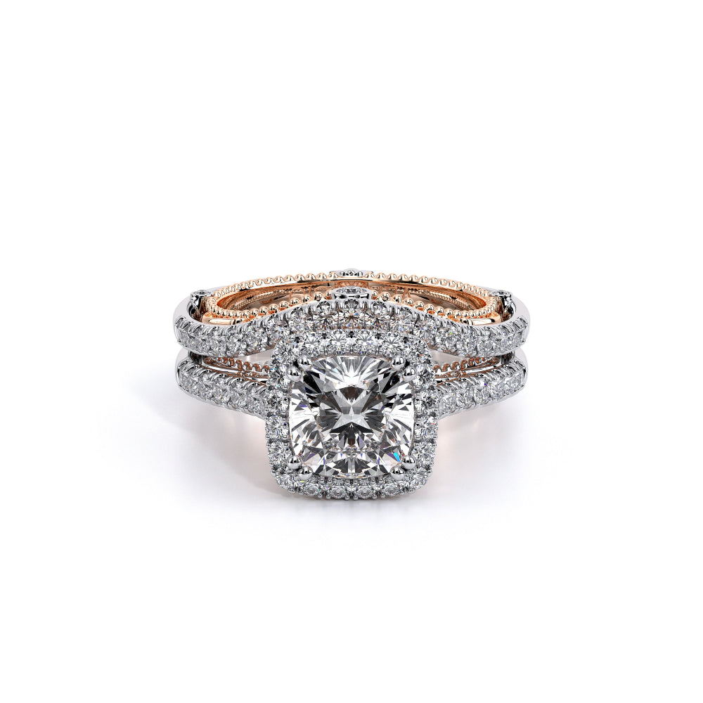 VENETIAN-5061CU-TT engagement ring from the Venetian Collection, features a unique diamond adorned basket topped with a cushion shaped single halo made for a round center. A delicate straight shank encrusted with round brilliant diamonds completes this beautiful ornate design.