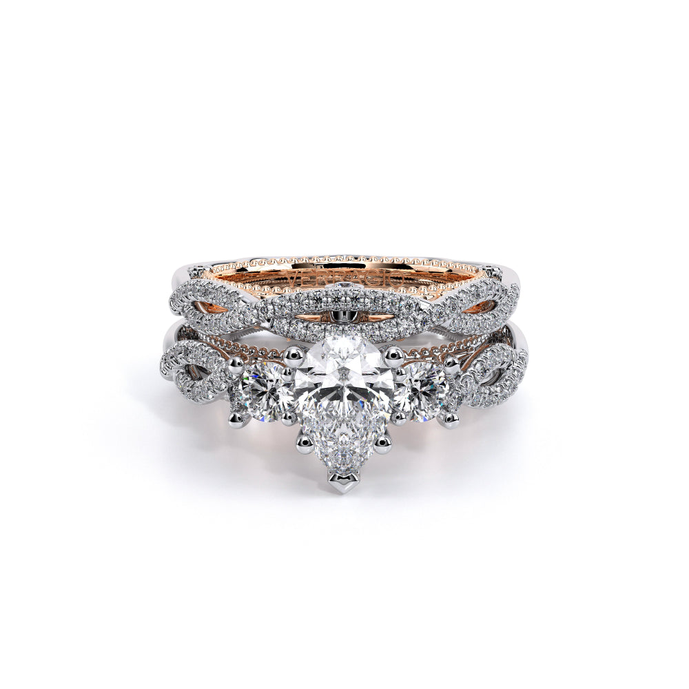 VENETIAN-5013PEAR is a three stone diamond engagament ring featuring two round side diamonds seemlesly integrated on a twisted diamond shank. The inner profile showcases a handcrafted lace and our Verragio signature beading. Personalize this beauty with a center stone shape of your choice.