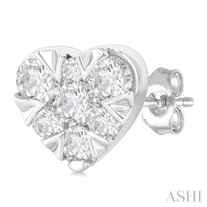 Add a touch of glamour to any outfit with these stunning Lovebright Petite diamond fashion stud earrings, a perfect accessory to elevate your style on any occasion. The earrings feature a striking heart-shaped mount that dazzles with a cluster of round cut diamonds. Each mount is skillfully adorned with 7 invisible set round cut diamonds, 1 in the center and 8 surrounding it, sparkling with unmatched brilliance. The Lovebright Petite diamond fashion stud earrings are sculpted in a rhodium finish 10 karat white gold. Total diamond weight is 1/6 ctw. Other metal types & colors may be available.
