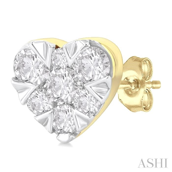 Add a touch of glamour to any outfit with these stunning Lovebright Petite diamond fashion stud earrings, a perfect accessory to elevate your style on any occasion. The earrings feature a striking heart-shaped mount that dazzles with a cluster of round cut diamonds. Each mount is skillfully adorned with 7 invisible set round cut diamonds, 1 in the center and 8 surrounding it, sparkling with unmatched brilliance. The Lovebright Petite diamond fashion stud earrings are sculpted in 10 karat yellow gold. Total diamond weight is 1/6 ctw. Other metal types & colors may be available.