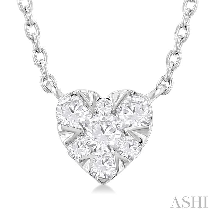 Simple, but a smart addition to your jewelry collection, this Lovebright Petite diamond fashion pendant blends style with creative fun. The delicate pendant features a lovely heart-shaped mount, embellished with a cluster of 7 invisible set round cut diamonds, 1 in the center and 6 haloing it, shimmering with every movement. The brilliant sparkle of these diamonds makes this pendant truly stand out. Paired with a CAT23 chain, the Lovebright diamond fashion pendant and chain are both styled in a rhodium finish 10 karat white gold. Total diamond weight is 1/10 ctw. Other metal types & colors may be available.