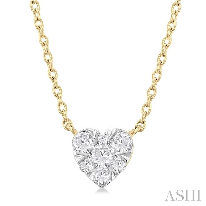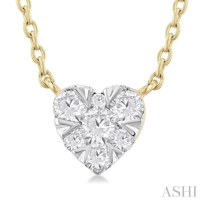 Simple, but a smart addition to your jewelry collection, this Lovebright Petite diamond fashion pendant blends style with creative fun. The delicate pendant features a lovely heart-shaped mount, embellished with a cluster of 7 invisible set round cut diamonds, 1 in the center and 6 haloing it, shimmering with every movement. The brilliant sparkle of these diamonds makes this pendant truly stand out. Paired with a CAT23 chain, the Lovebright diamond fashion pendant and chain are both styled in 10 karat yellow gold. Total diamond weight is 1/10 ctw. Other metal types & colors may be available.