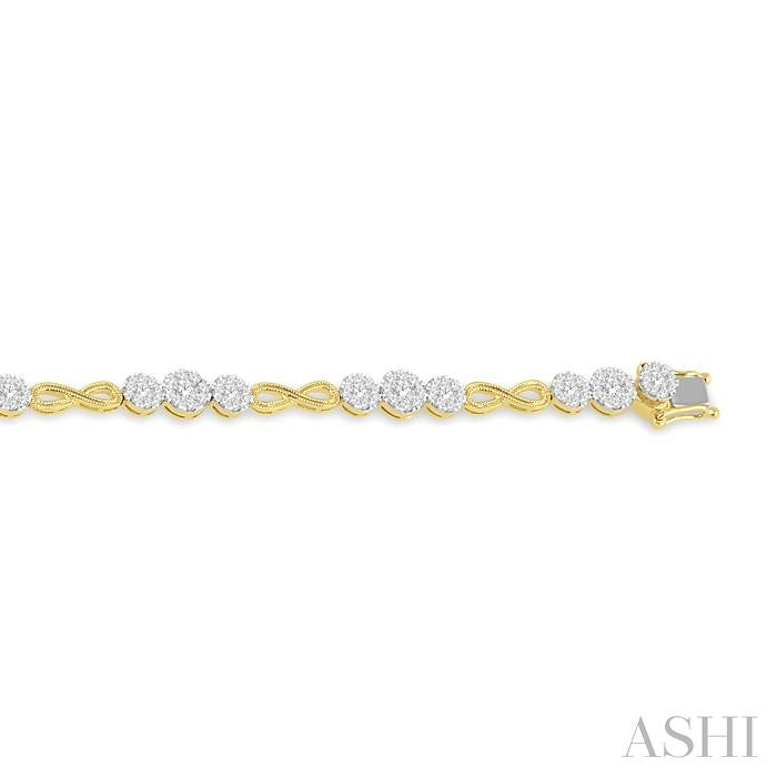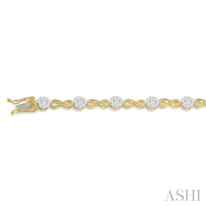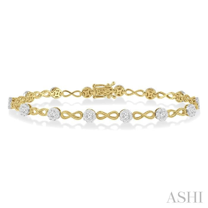 A breathtakingly beautiful diamond bracelet, this makes the most gorgeous anniversary gift for your beloved. Coming from the Lovebright collection, the bracelet is nothing less than spectacular. It features 14 small 14 karat white gold circular mounts, connected via infinity links. The milgrain finished infinity links signify an eternal bond, most apt for the occasion, while diamonds on the mounts offer the bracelet aesthetic appeal. 9 each, 1 in the center and 8 encircling it, invisible set round cut diamonds, total 126, embellish the 14 circular mounts. An open box clasp with double security snap lock fastens the bracelet, which is styled in 14 karat yellow and white gold. Total diamond weight is 1 1/2 ctw. Other metal types & colors may be available.
