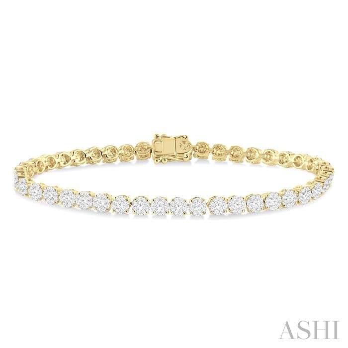 This exquisite fresh and timeless diamond lovebright tennis bracelet will complement her look and form a continuous band of brilliance around the wrist. Fashioned on luminous 14 karat yellow and white gold, this bracelet showcases shimmering 387 round cut diamonds that are set in a beautifully complementary flower motif. Diamonds are perfectly invisible set. Total diamond weight is 3 ctw. Fastens with a secure clasp. Other metal types & colors may be available.