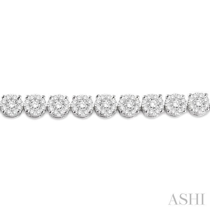 This exquisite fresh and timeless diamond lovebright tennis bracelet will complement her look and form a continuous band of brilliance around the wrist. Fashioned on luminous 14 karat white gold, this bracelet showcases shimmering 387 round cut diamonds that are set in a beautifully complementary flower motif. Diamonds are perfectly invisible set. Total diamond weight is 3 ctw. Fastens with a secure clasp. Other metal types & colors may be available.