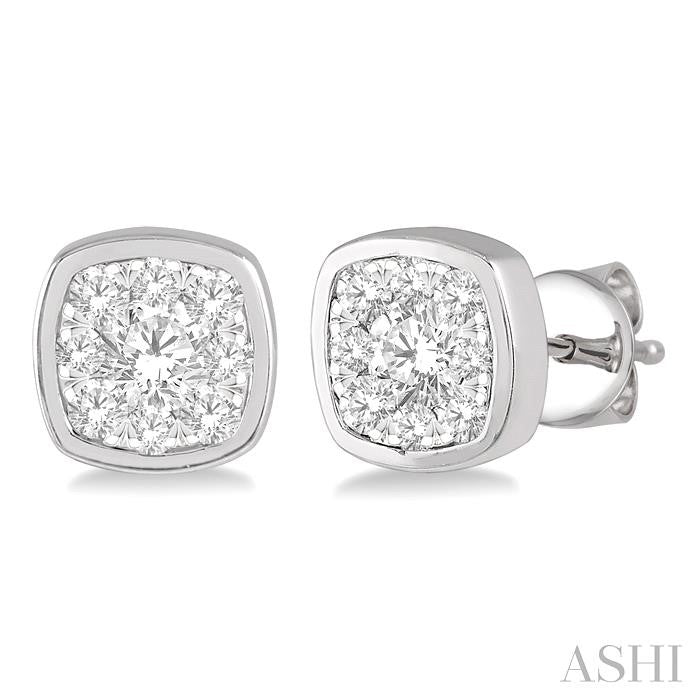 The Lovebright collection offers splendor, no matter how big or small the piece of jewelry may be. These diamond stud earrings come from this grand assemblage. The earrings feature a cushion shape, with a raised cushion shape center mount, bounded by a lower border frame in the same shape. On each earring, in the center of the top mount is a 1/20 ctw invisible set round cut diamond, haloed by 8 invisible set 1/50 ctw round cut diamonds. The bordering mount is embellished with 16 pave set round cut diamonds, 32 in total on both earrings. The stud earrings are styled in 14 karat white gold. Total diamond weight is 1/2 ctw. Other metal types & colors may be available.