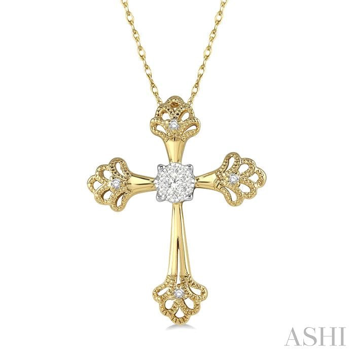 A unique cross charm pendant, this catches the eye instantly. It features tree-shaped arms that give it a spectacular look. Also adorned are round-cut diamonds that add to the charm of the pendant. A white gold round mount sits in the center and is decorated with 9 pressure set round cut diamonds, one in the center and 8 forming a halo around it. Apart from this, there are 4 prong sets of round cut diamonds, one each on the arms, in the center of the tree-like structures, which also feature a milgrain finish, 14 karat yellow gold Rope chain completes the pendant. The pendant is styled in 14 karat yellow and white gold. Total diamond weight is 1/8 ctw. Other metal types & colors may be available.