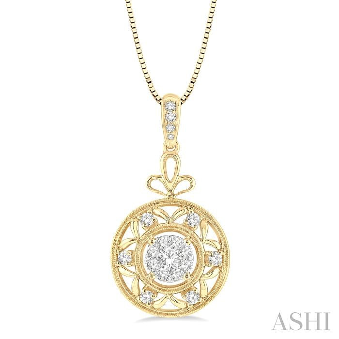 Dazzle up her neckline with this charming diamond Lovebright pendant. Crafted in glinting 14 karat yellow and white gold this double circle frame pendant is graced with a set of sparkling round cut diamonds nestled amid open circle design and the outer halo frame is embellished with shimmering round cut diamonds accents along with the front edge. Brilliant 19 diamonds are set in invisible, prong settings. This pendant hangs up from a fashionable box chain. Total diamond weight is 1/2 ctw. Other metal types & colors may be available.