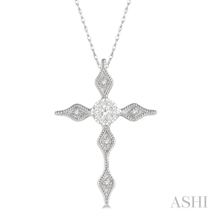 The marquise shape structures with pointed tips, making up this cross charm pendant, give a unique and stylish look to it. Adding beauty to it is a diamond-studded round center mount, between the arms of the cross. While 9 pressure set round cut diamonds, one in the center and 8 forming a halo around it embellish the center mount, 5 pave set round cut diamonds adorn the center of each of the 5 marquise shape accents. A milgrain border highlights the cross-charm pendant. A Rope chain completes the look. Both pendant and chain are styled in 14 karat white gold. Total diamond weight is 1/8 ctw. Other metal types & colors may be available.