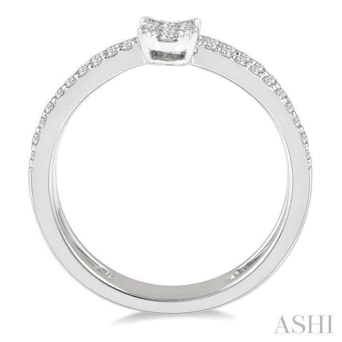 A lovely Lovebright diamond fashion ring, this lends style to your looks. It features a split twin band structure, with an oval shape center mount on one of the rings. Embellishing the oval mount are 10 invisible set round cut diamonds. Also decorating the twin bands is more diamonds. There are 20 micro wall set round cut diamonds on the ring with the mount, 10 each flanking it on either side. On the other band are seen 22 micro wall set round cut diamonds, lined in a row. The Lovebright fashion ring is styled in a polished rhodium finish 14 karat white gold. Total diamond weight is 1/3 ctw. Other metal types & colors may be available.