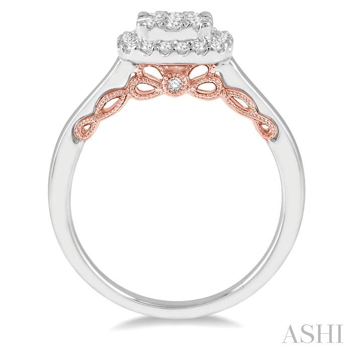 A gorgeous Lovebright diamond ring, beautifully carved and embellished, this calls for instant attention. It features a white gold cushion cut shape center mount, which comprises of a 1/8 ct invisible set round cut diamond in the center, with 8 invisible set round cut diamonds encircling it. A white gold trim borders the center mount and is encrusted with 20 prong set round cut diamonds. 2 bezel set round cut diamonds adorn the rose gold carved gallery. The ring is styled in 14 karat White and Rose gold. Total diamond weight is 1/2 Ctw. Other metal types & colors may be available.