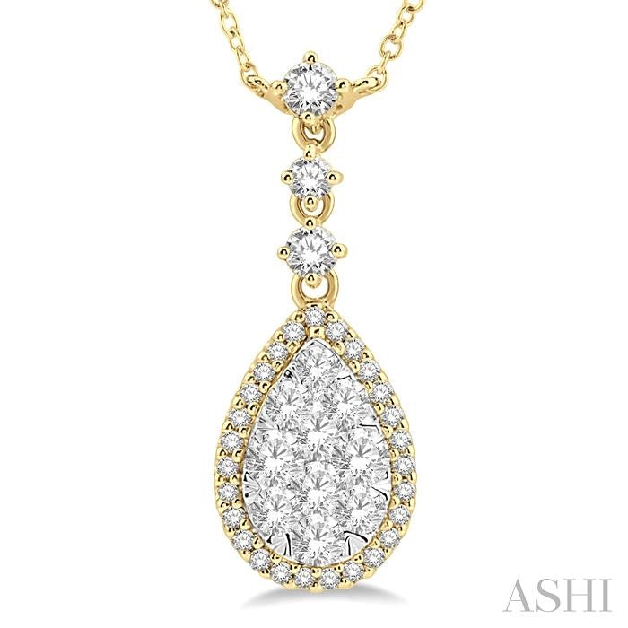 Each piece in the Lovebright collection leaves you awestruck. This grand pendant comes from this majestic collection. It features a pear shape mount at the base, moving up to a round mount that connects with a marquise mount and then a floral mount at the top, holding the link chain. The pear mount has a white gold pear shape center that is accented with 10 invisible set round cut diamonds. 15 micro wall set round cut diamonds form a halo effect around this mount. A bezel set round cut diamond adorns the round mount, while 2 pave hand set round cut diamonds embellish the marquise mount. The floral mount is decorated with 4 pave hand set round cut diamonds. A milgrain border is seen on the smaller mounts. The pendant is styled in 14 karat yellow and white gold and is held by a 14 karat yellow gold 18-inch cat chain. Total diamond weight is 3/8 ctw. Other metal types & colors may be available.