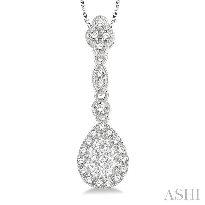 Each piece in the Lovebright collection leaves you awestruck. This grand pendant comes from this majestic collection. It features a pear shape mount at the base, moving up to a round mount that connects with a marquise mount and then a floral mount at the top, holding the link chain. The pear mount has a white gold pear shape center that is accented with 10 invisible set round cut diamonds. 15 micro wall set round cut diamonds form a halo effect around this mount. A bezel set round cut diamond adorns the round mount, while 2 pave hand set round cut diamonds embellish the marquise mount. The floral mount is decorated with 4 pave hand set round cut diamonds. A milgrain border is seen on the smaller mounts. The pendant is styled in 14 karat white gold and is held by a 14 karat white gold 18-inch cat chain. Total diamond weight is 3/8 ctw. Other metal types & colors may be available.